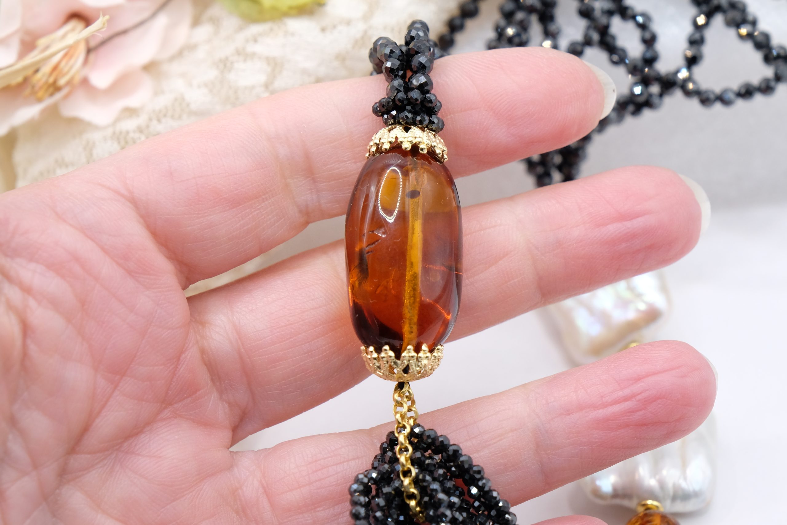Le perle sono alternate a ematite gold che dona dei punti luce molto eleganti e il barilotto di ambra ha le coppette in argento 925 placcato oro