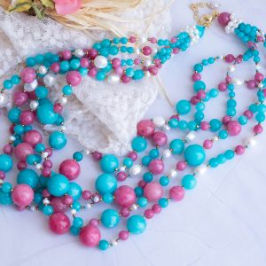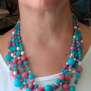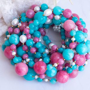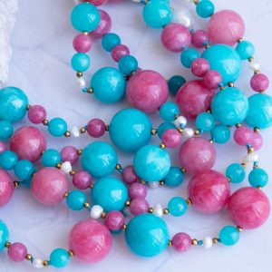 Collana ben 5 file di pietre naturali: Giada Rosa, Apatite e Perle, per una combinazione di colori raffinata e femminile, perfetta per valorizzare il tuo look con colori sofisticati e di classe.