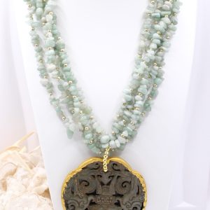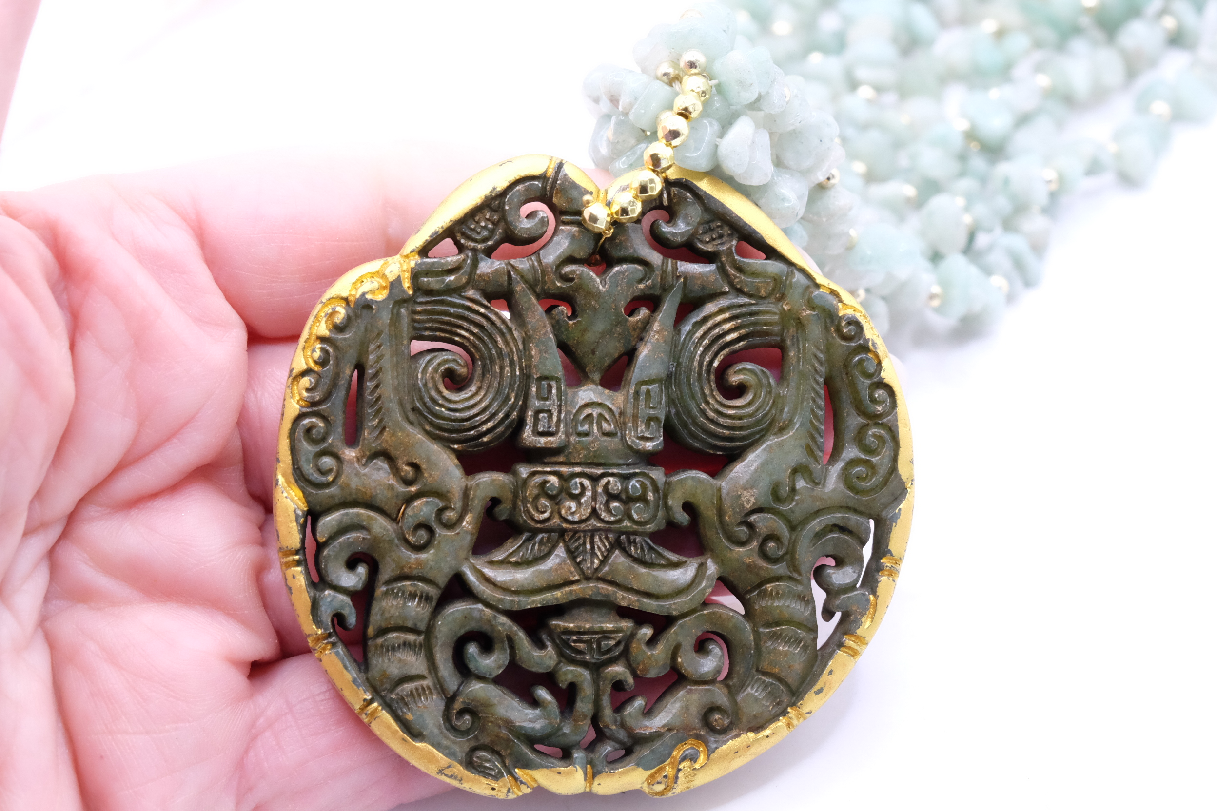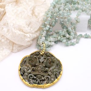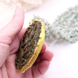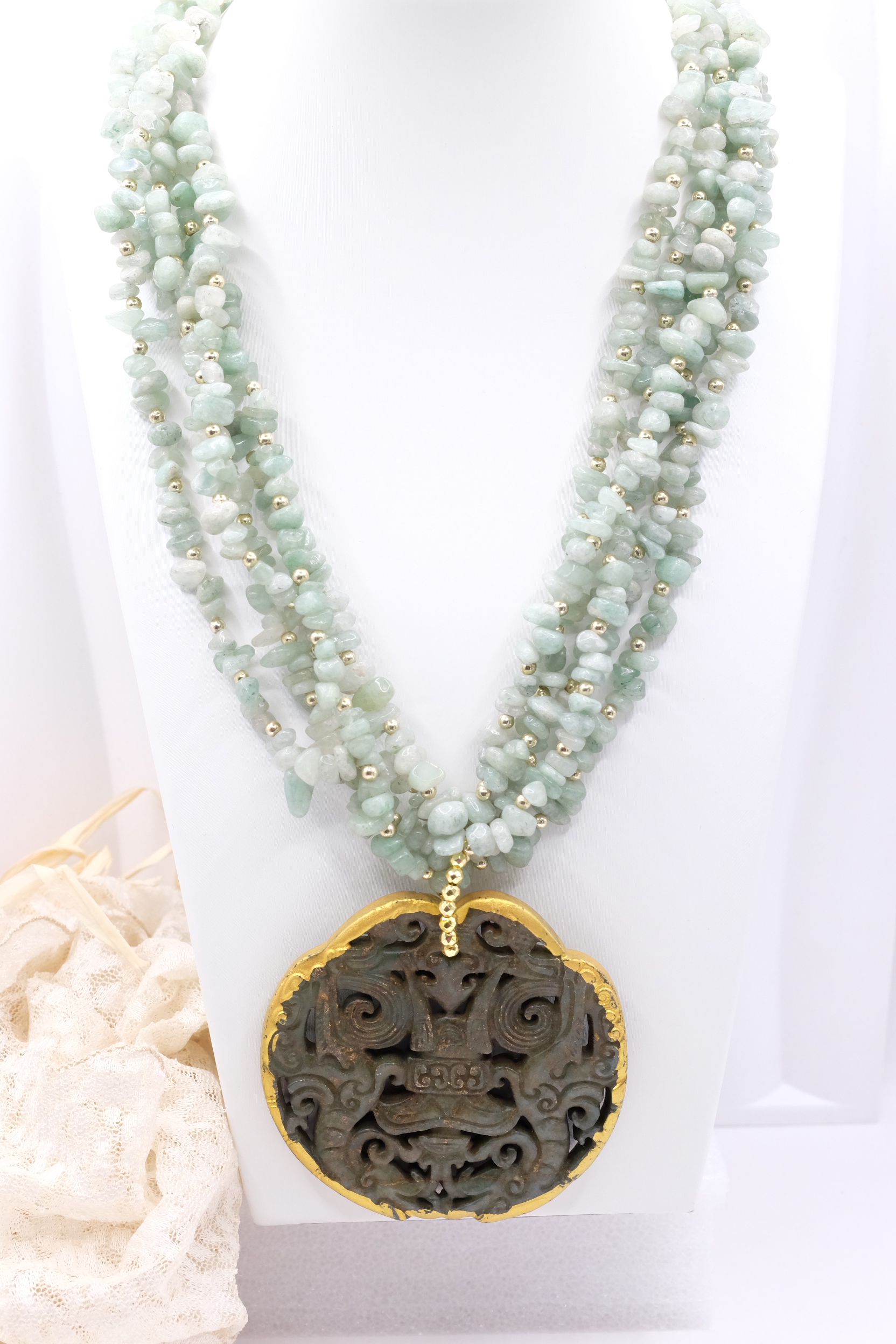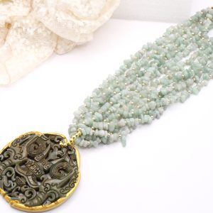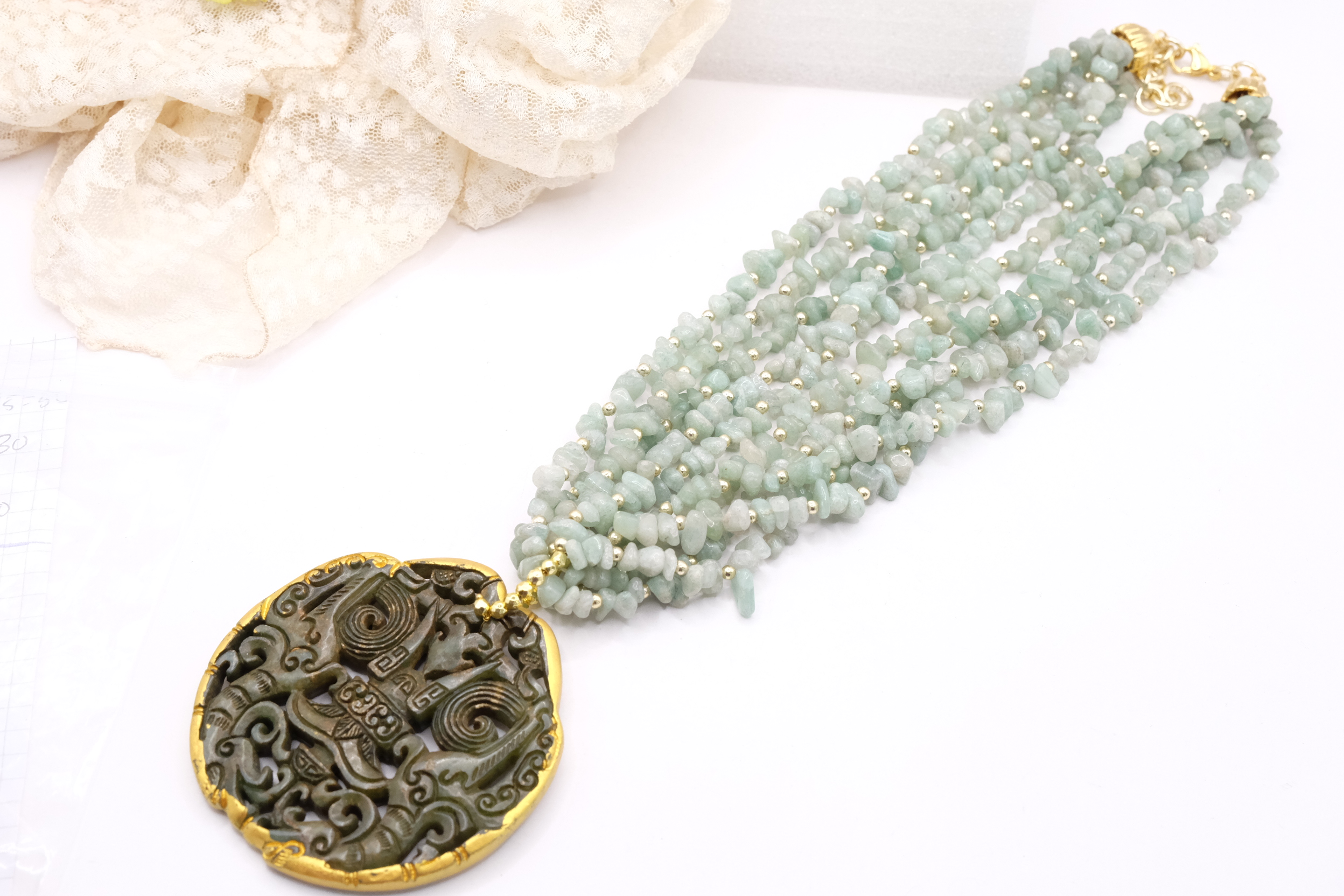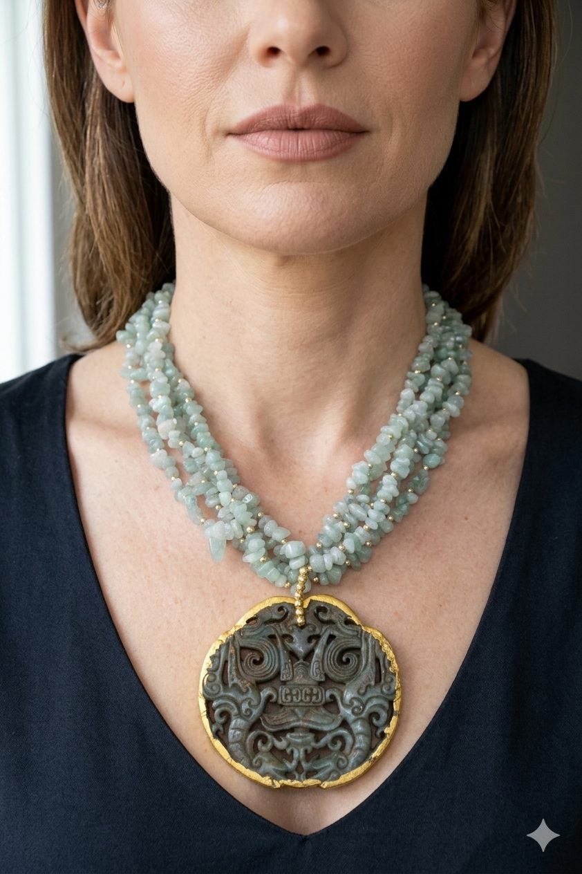 Un gioiello che unisce carattere e armonia: fili di giada verde a chips si intrecciano delicatamente, accompagnando un importante pendente mandala in giada finemente intarsiata a mano. Il dettaglio del passante in ematite gold dona luce e un tocco raffinato 🌿