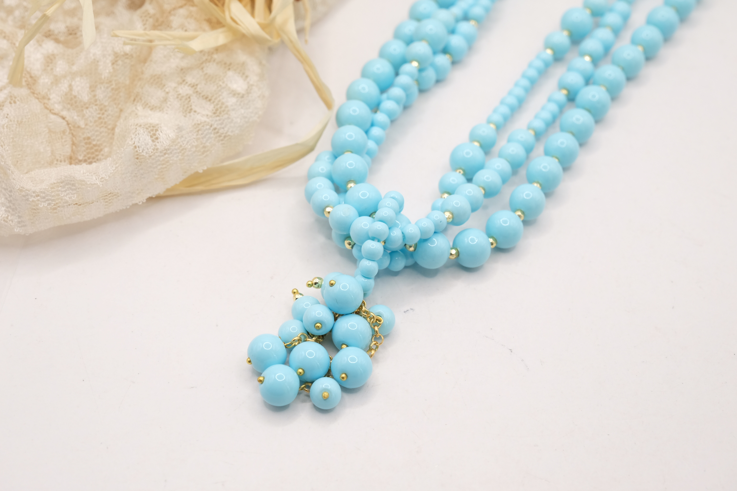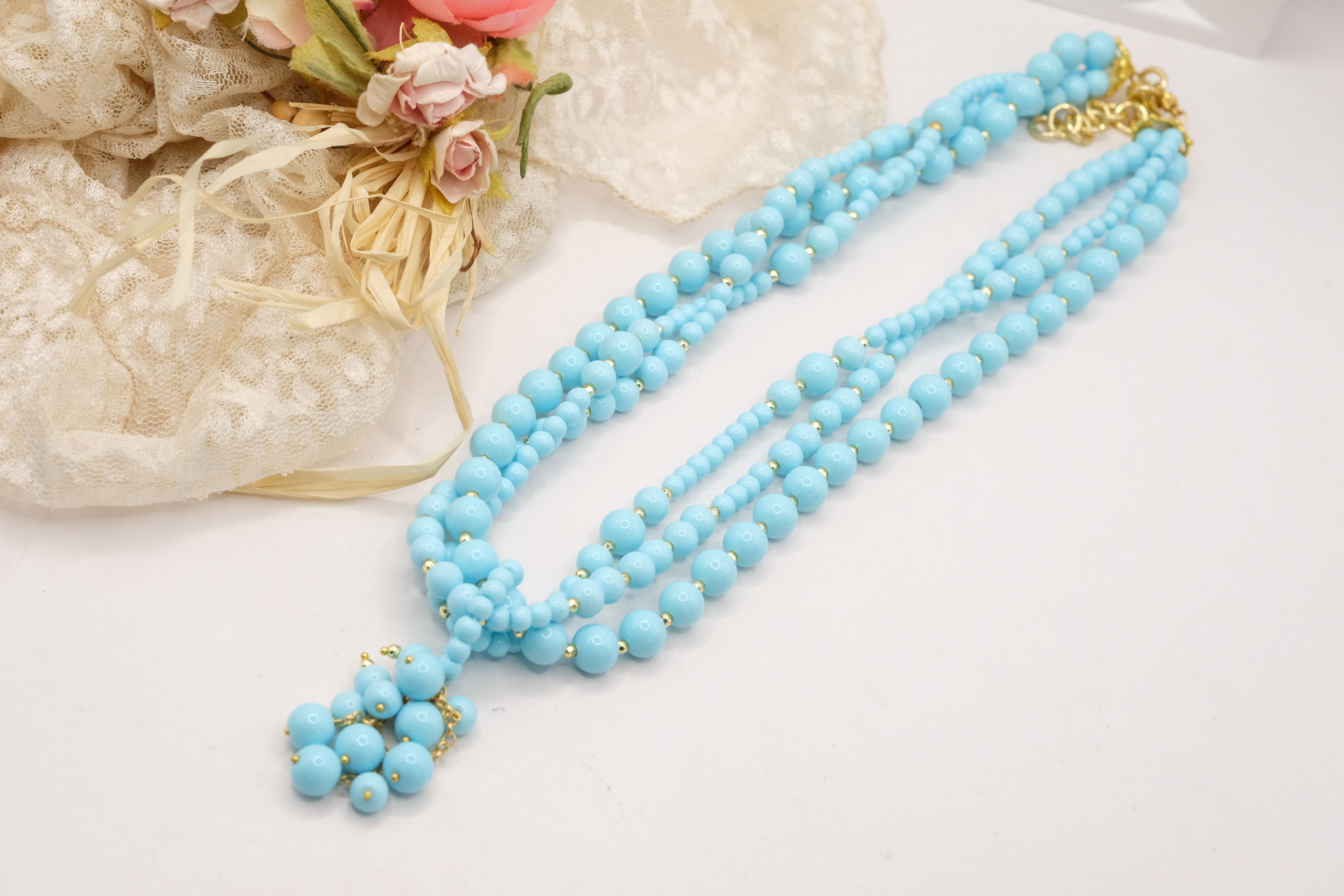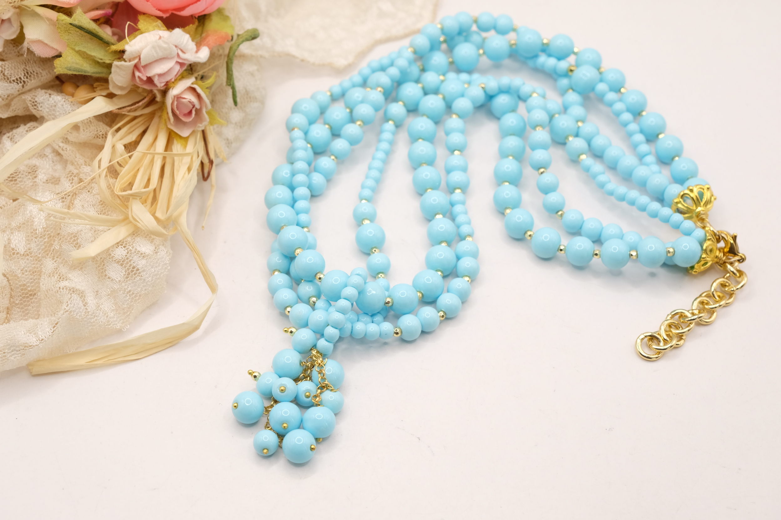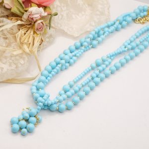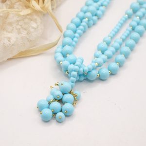 Collana multifilo stupenda a 3 fili in pasta di turchese 4 fiori, con pendente formato da un grappolo di pietre