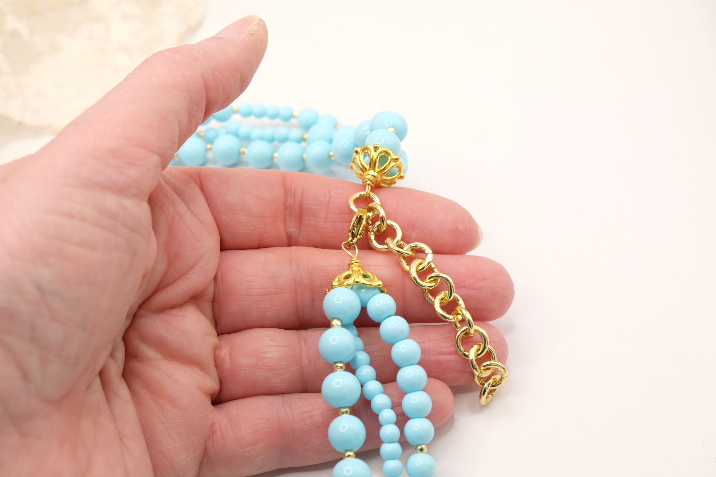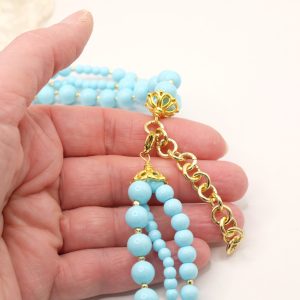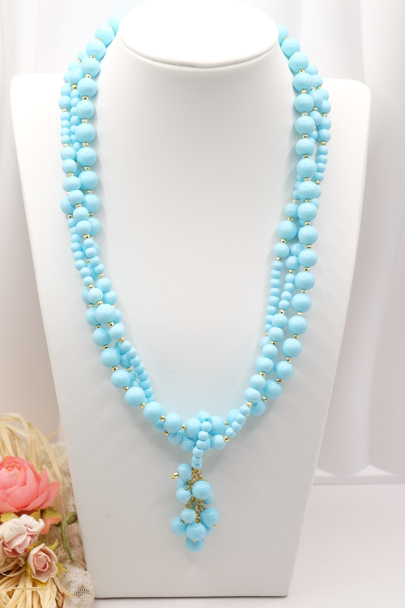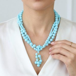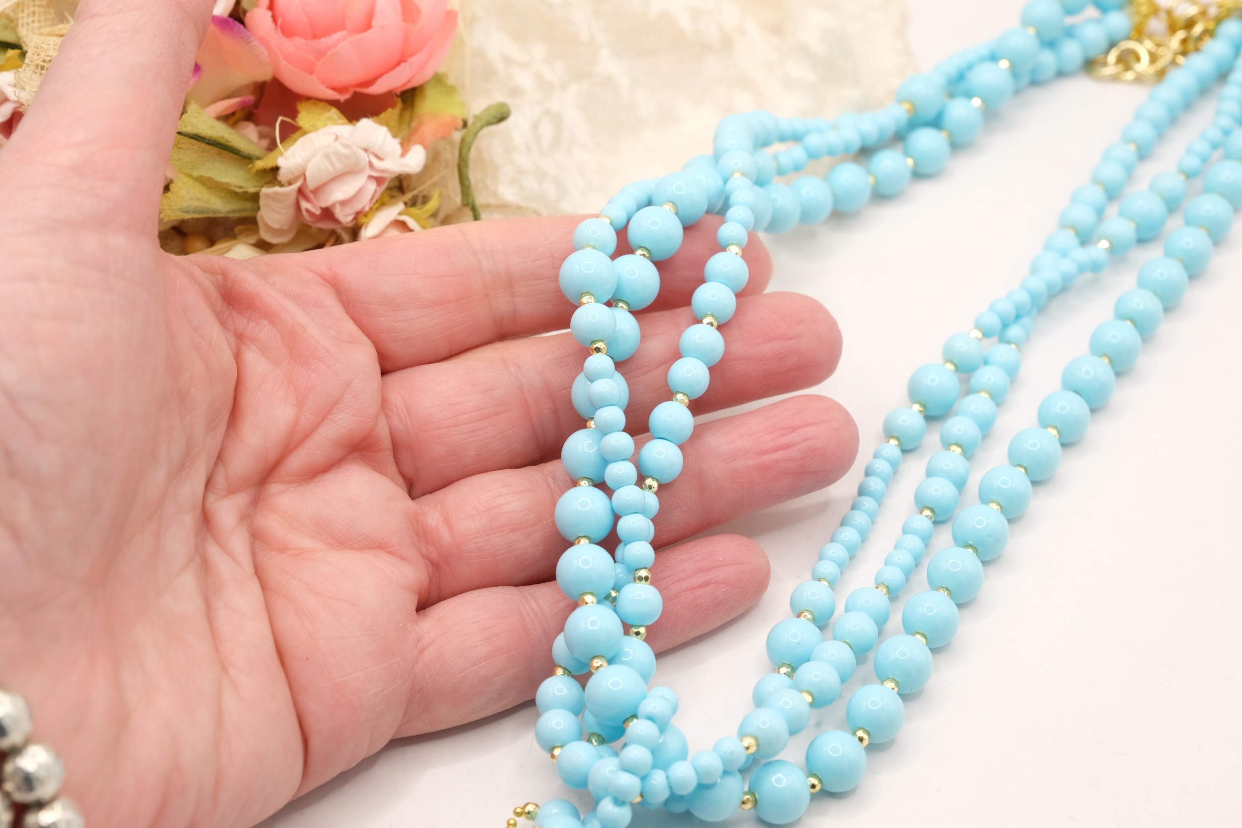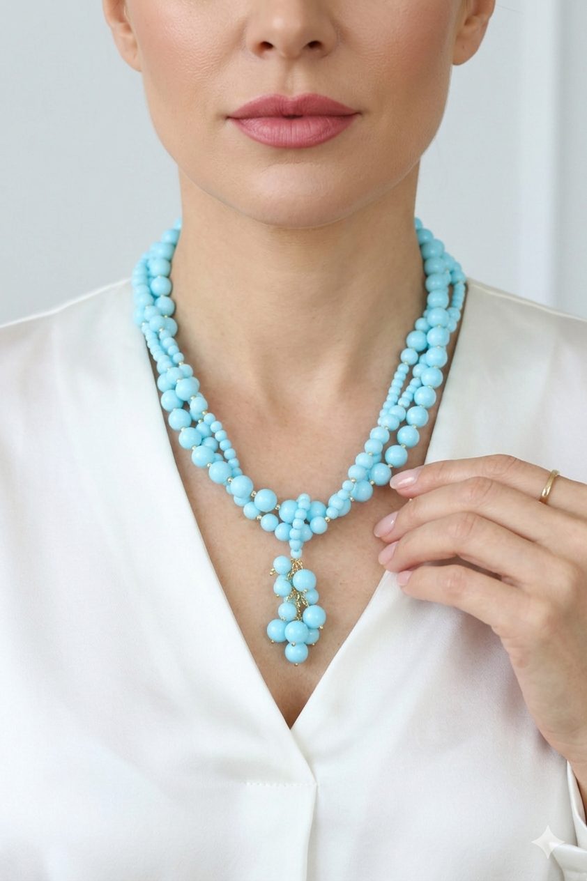 Collana multifilo stupenda a 3 fili in pasta di turchese 4 fiori, con pendente formato da un grappolo di pietre