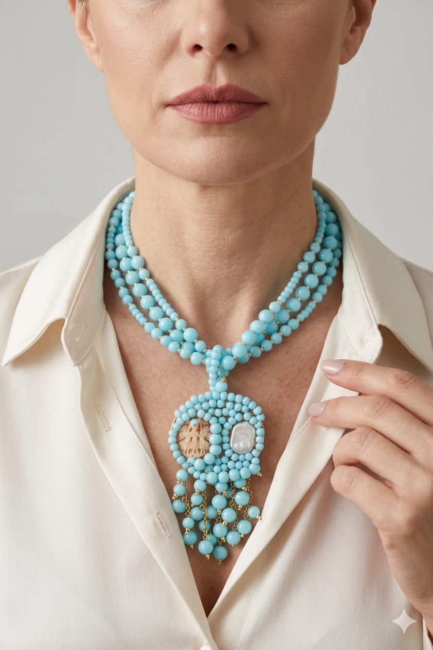 Collana Giada Azzurra Perle e Cammeo di Torre del Greco a Y
