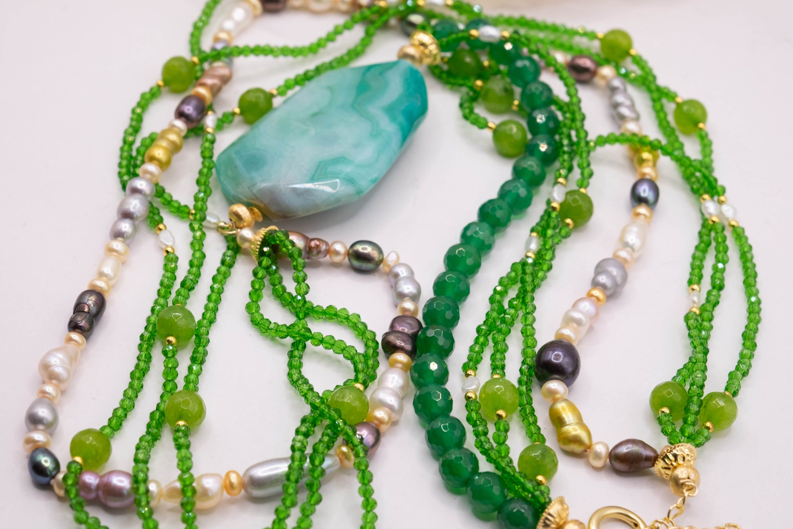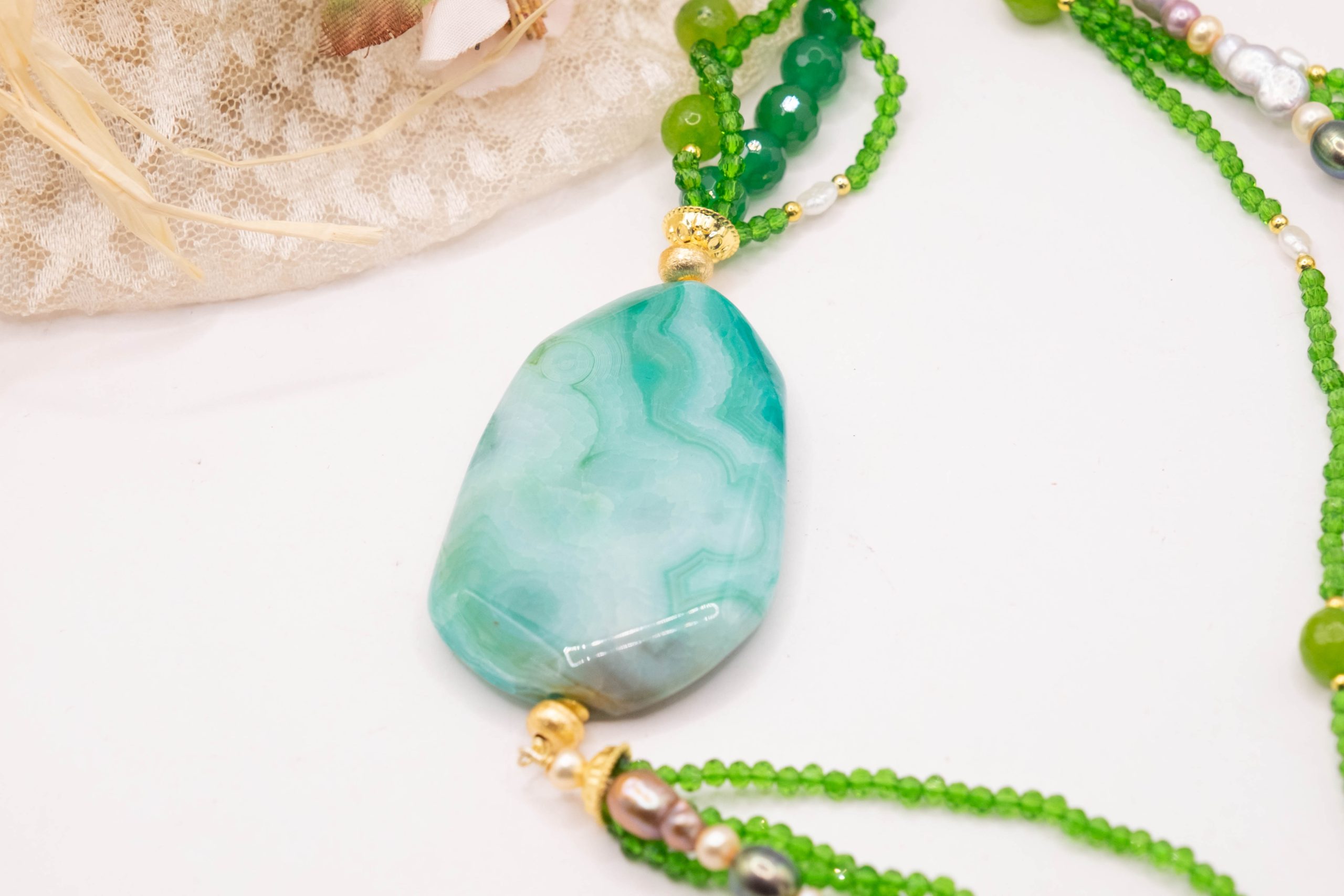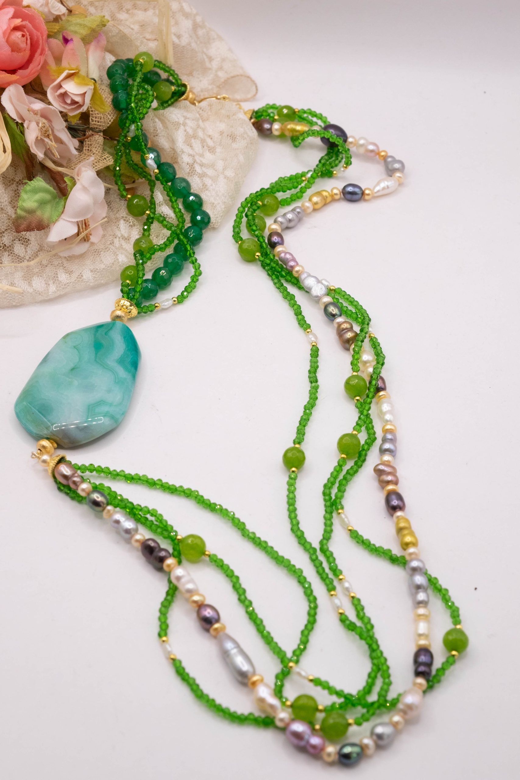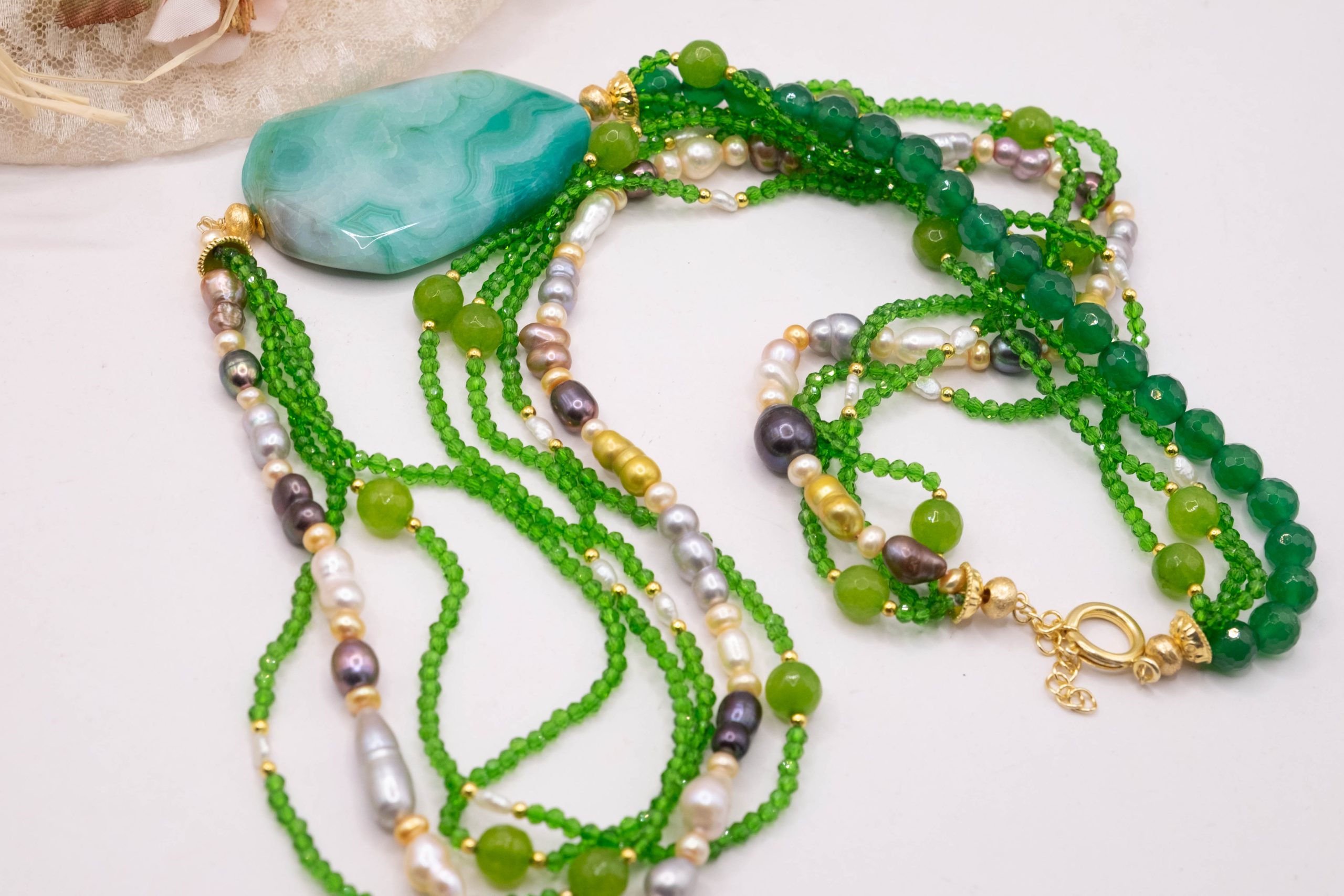 Collana Multifilo Perle Giada Verde Cristalli Piastra Agata