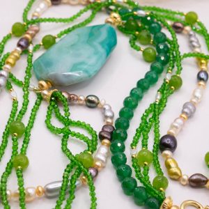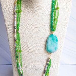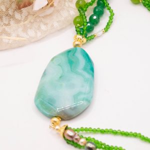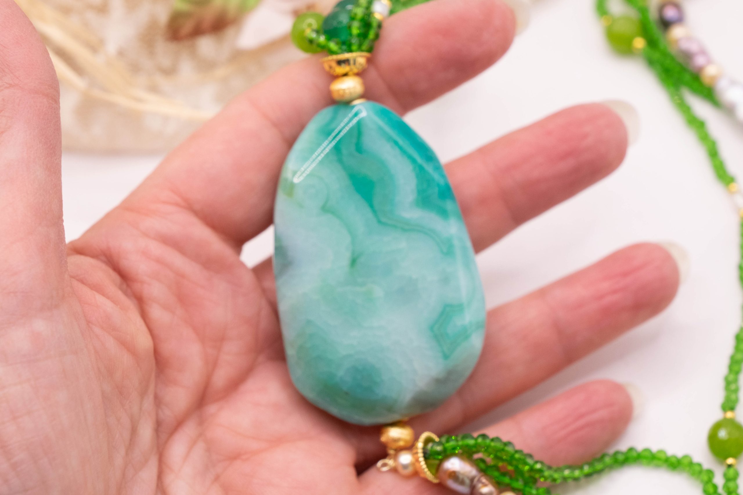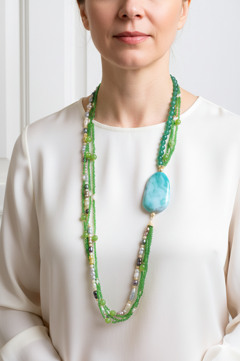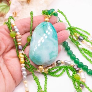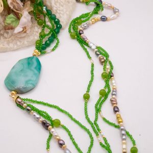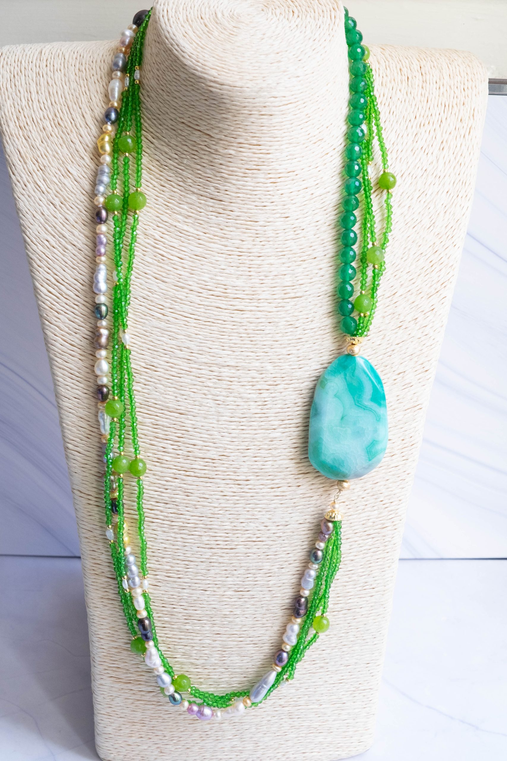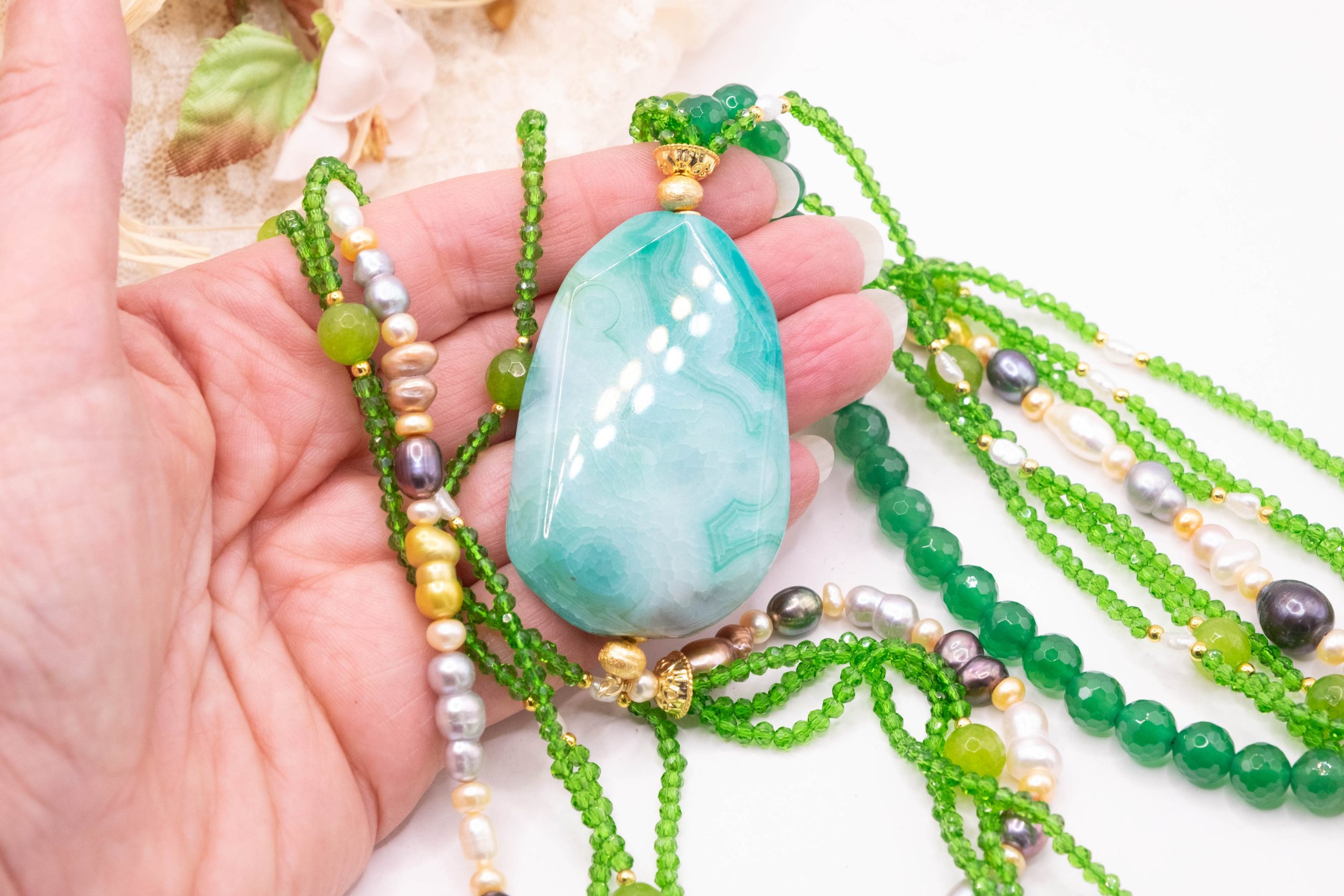 Collana Multifilo Perle Giada Verde Cristalli Piastra Agata