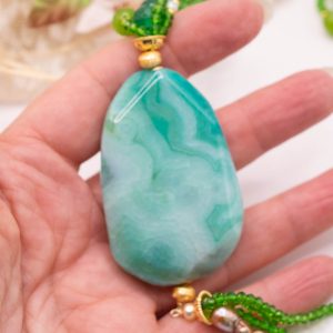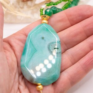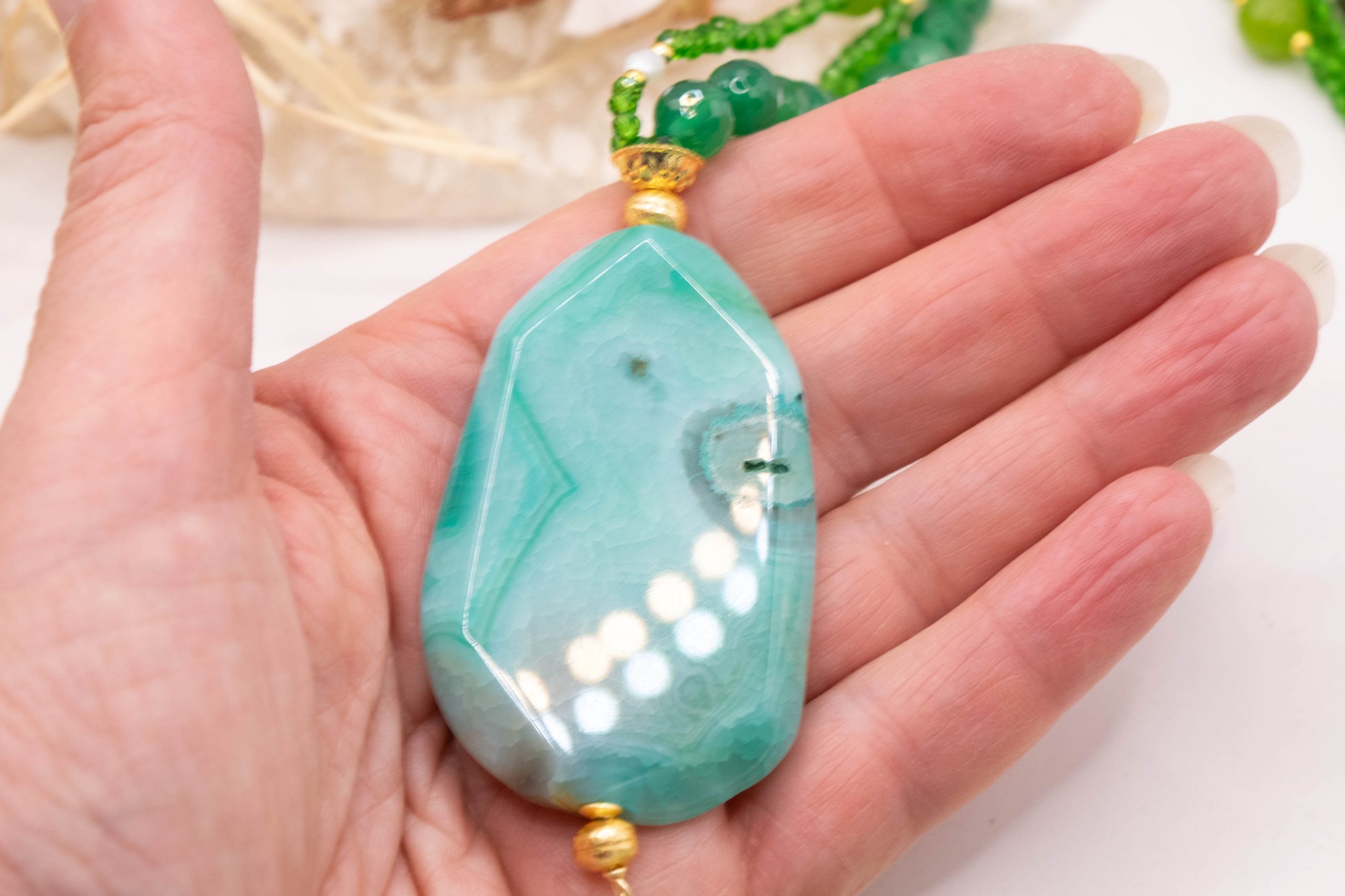 Collana 4 file di cristalli verdi, perle naturali, giada verde con grande piastra laterale in agata grezza naturale con crateri tipici delle pietre naturali che non sono difetti, ma garanzia di genuinità della pietra