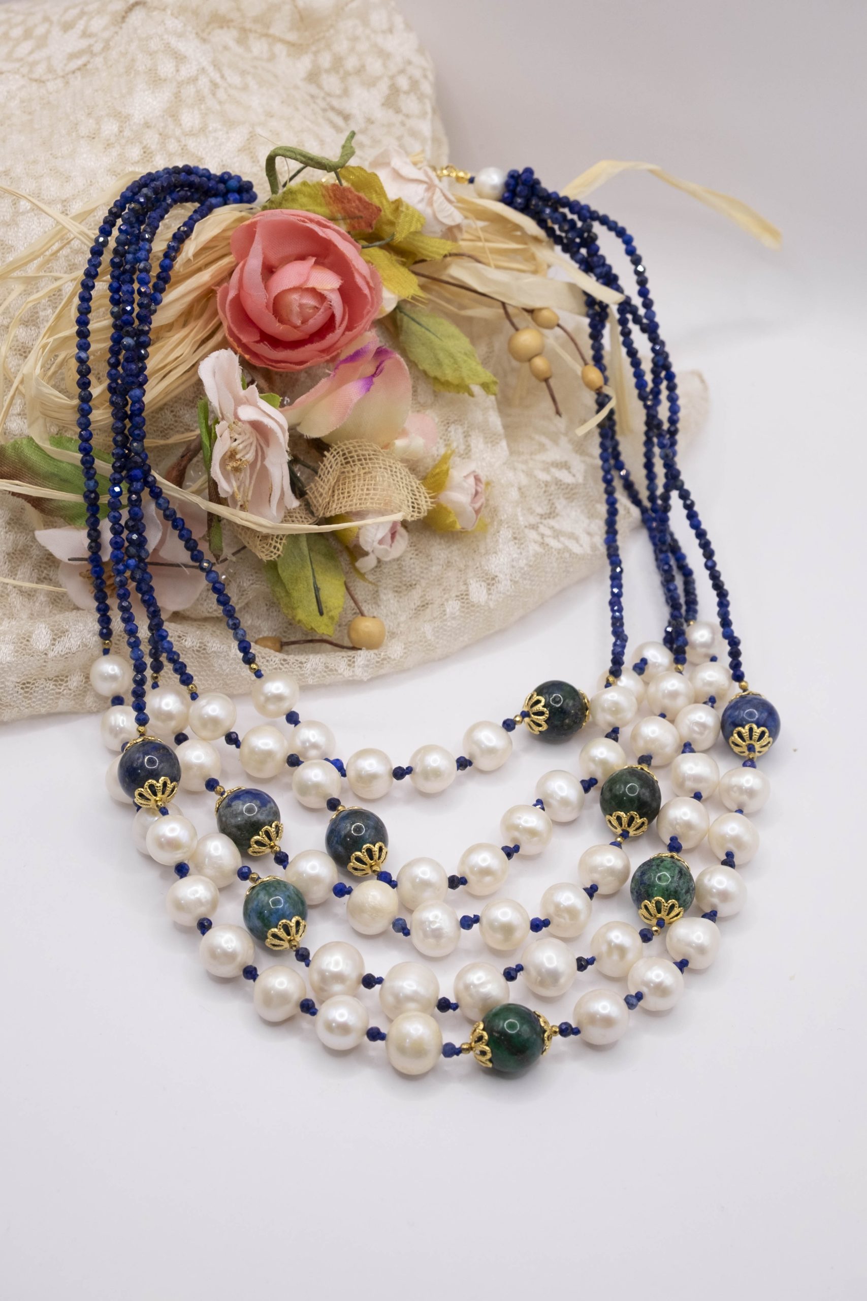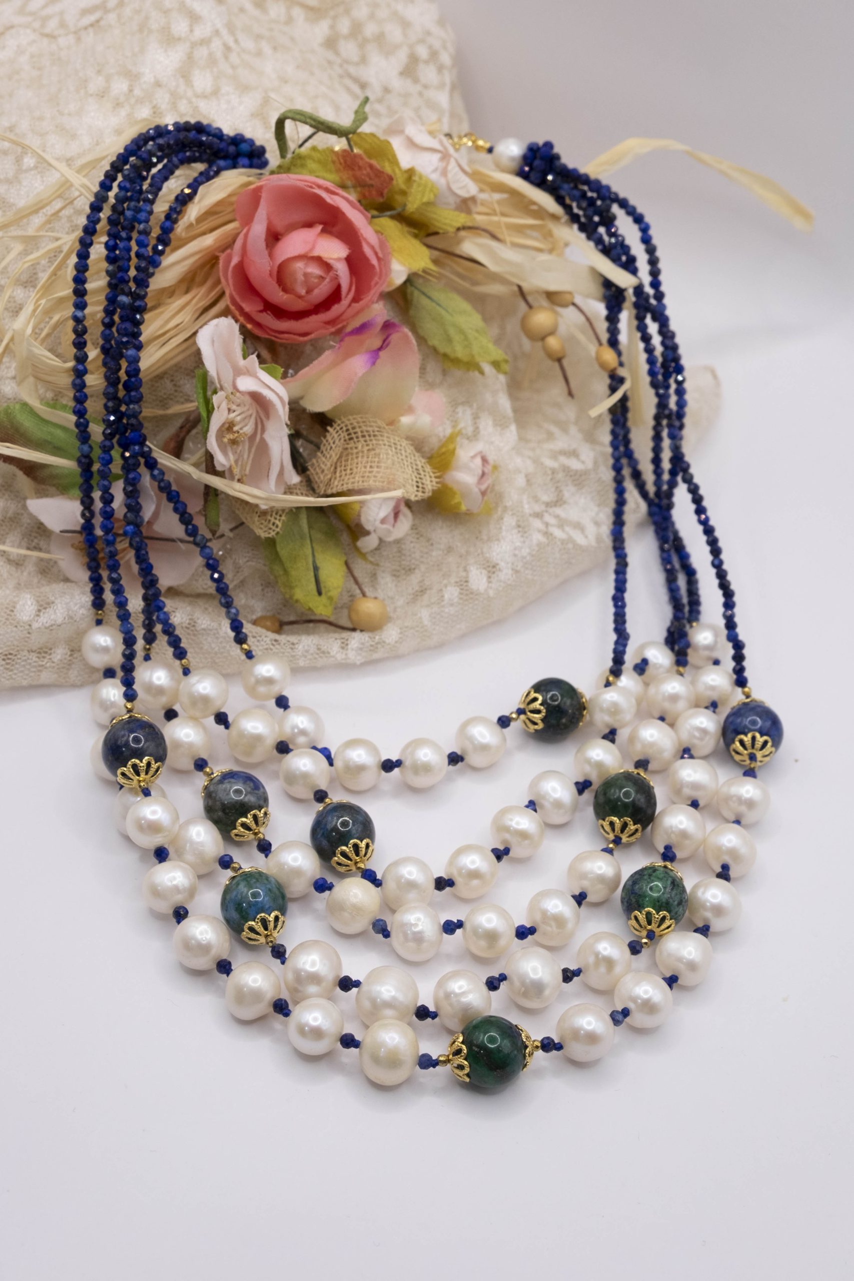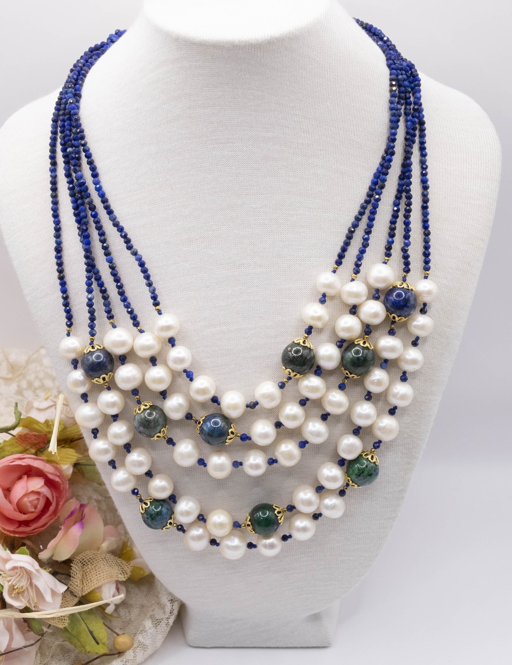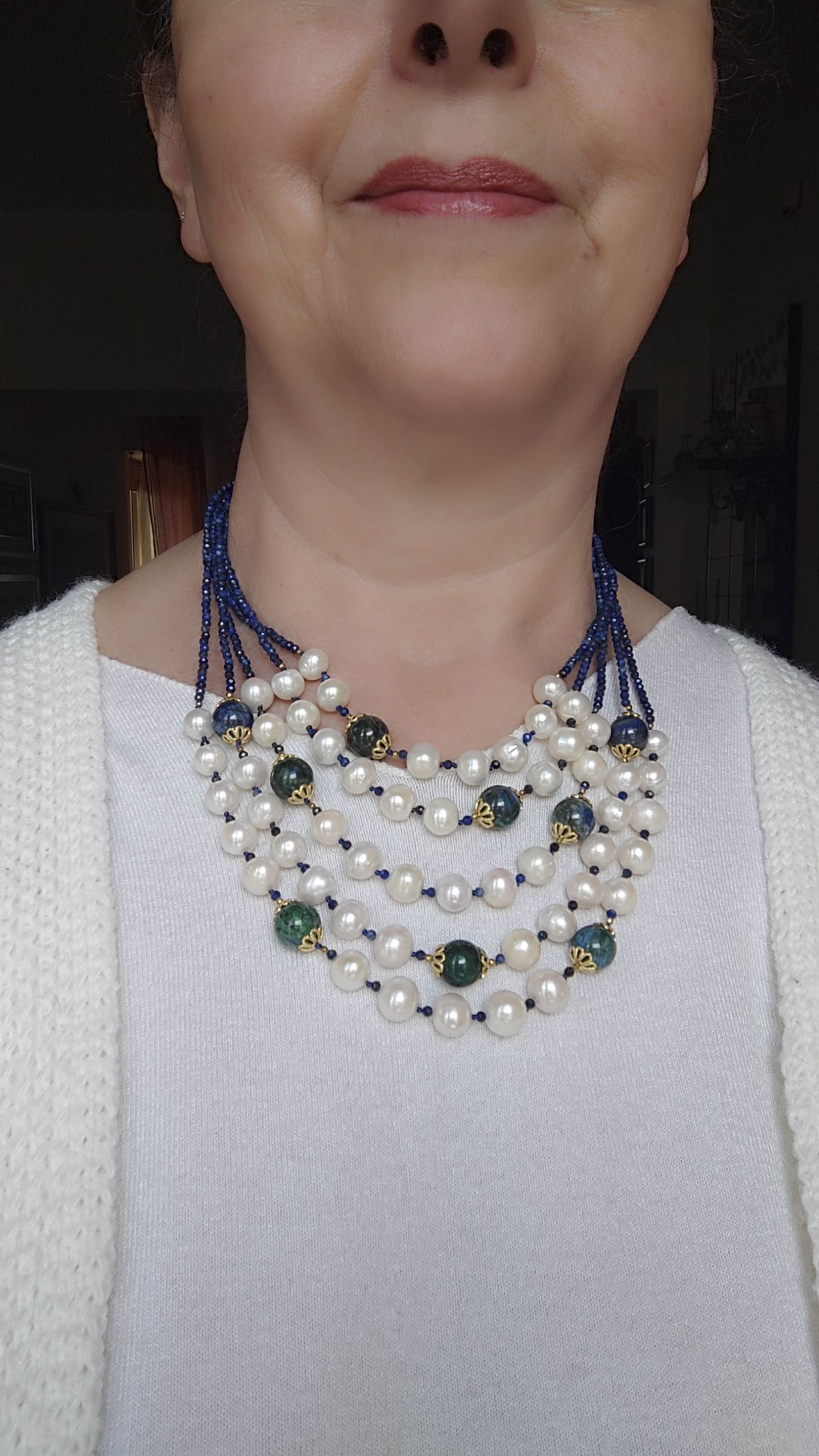 Elegante e luminosa collana 5 file di perle naturali, e sodalite naturale