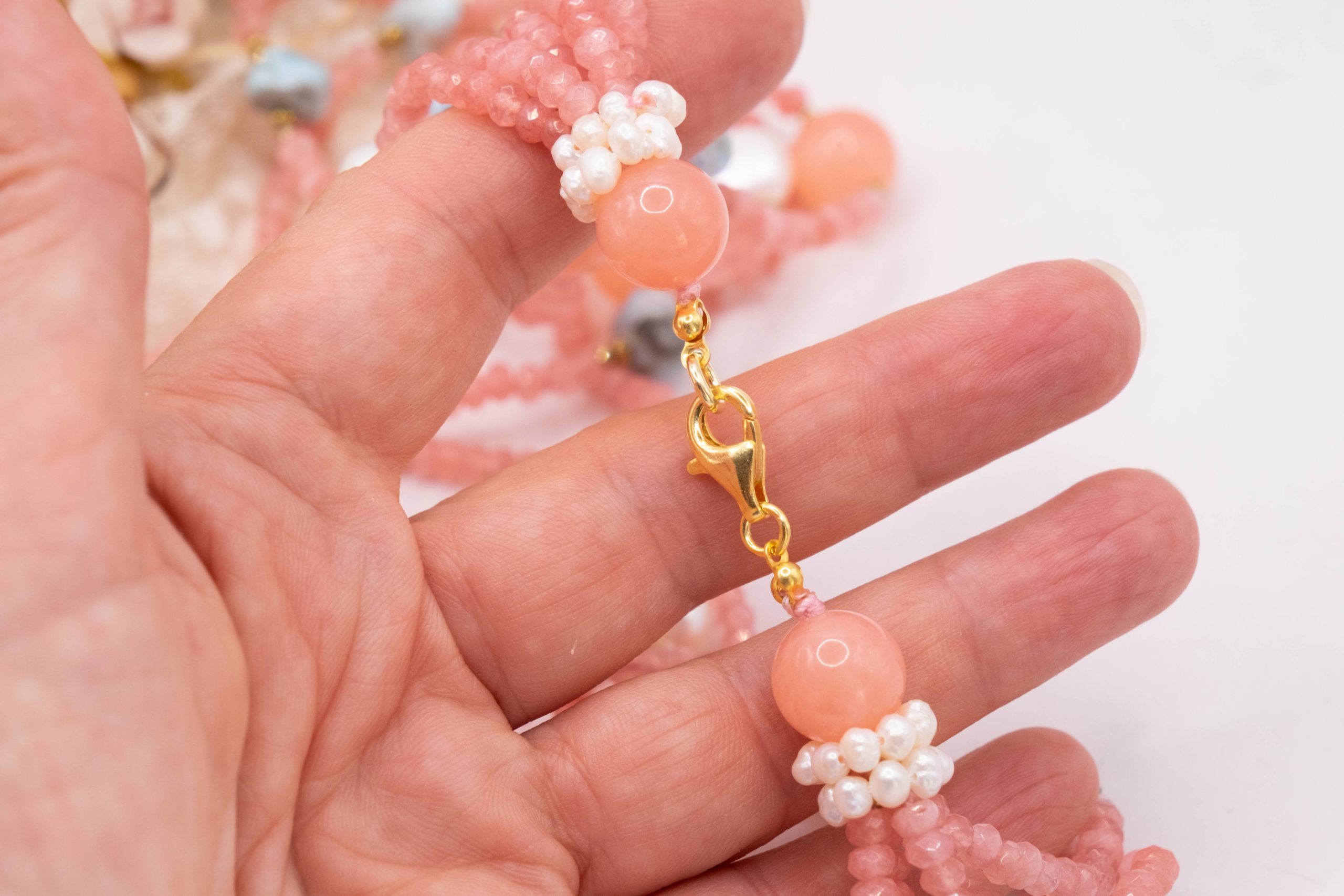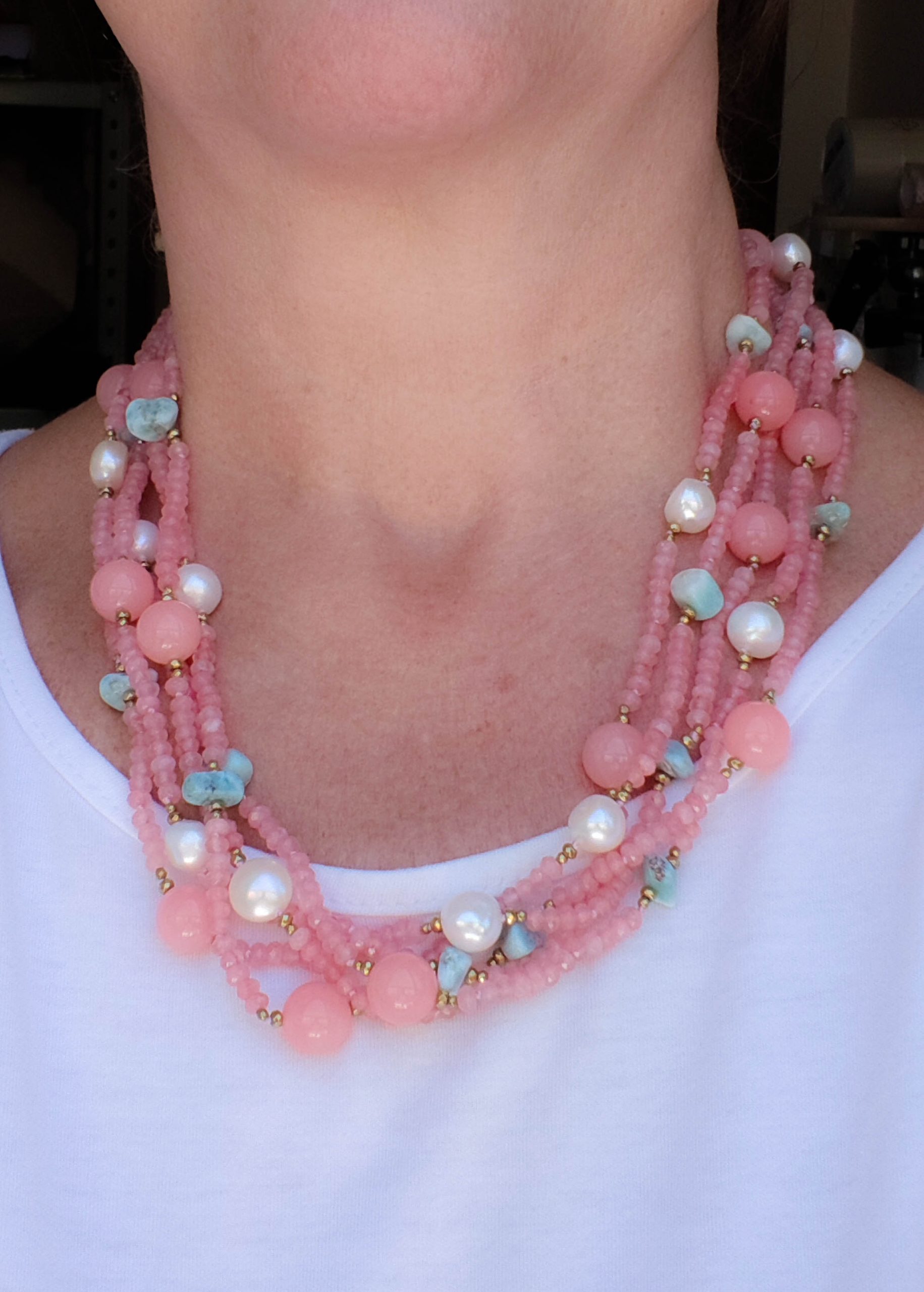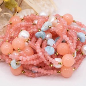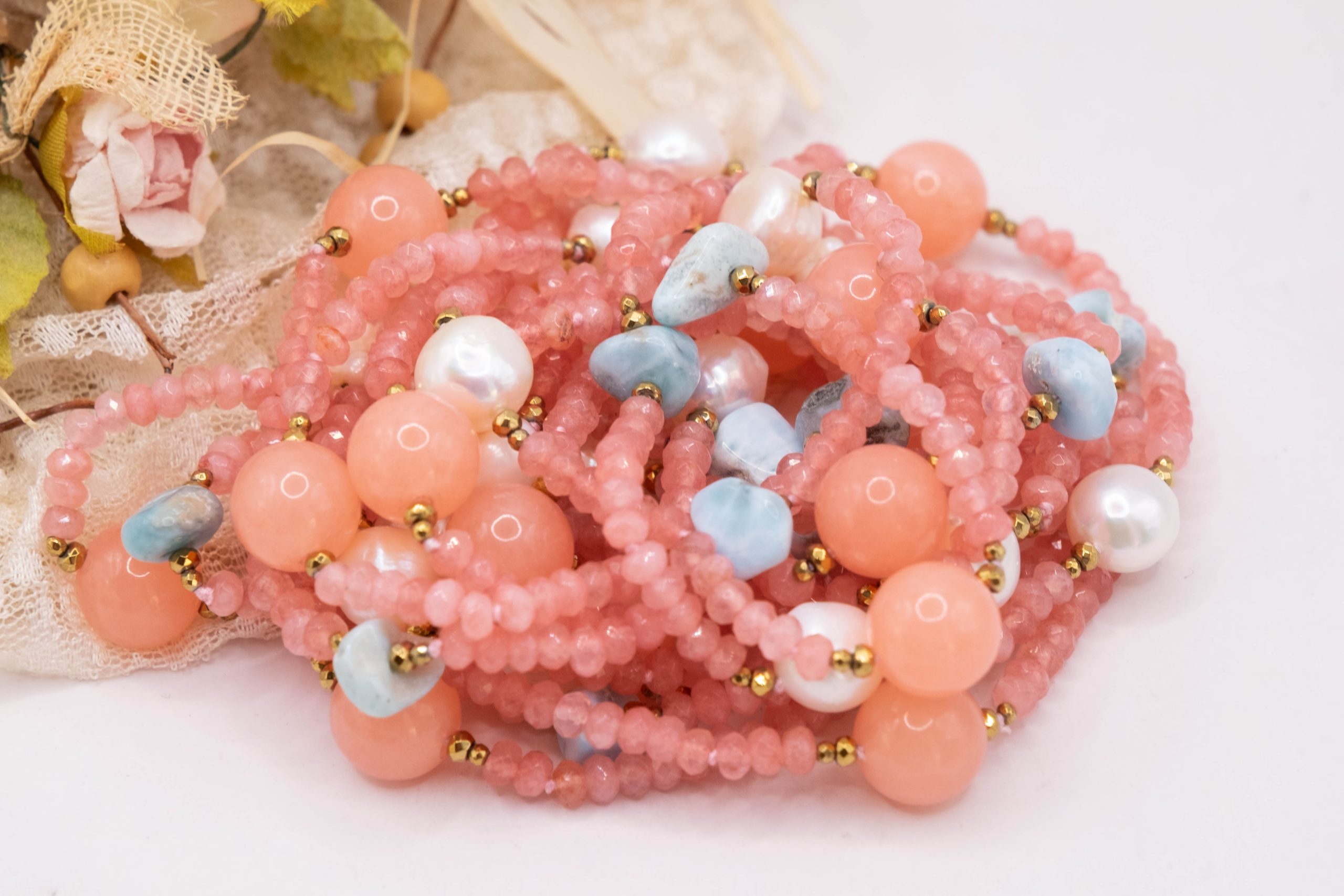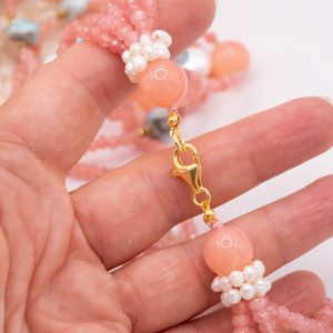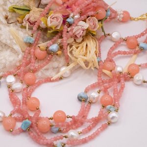 Collana per le clienti “pastellose” con ben 5 file di pietre naturali: Giada Rosa Fragola, Prezioso Larimar, Ematite Gold e Perle, per una combinazione di colori raffinata e femminile, perfetta per valorizzare il tuo look con colori sofisticati e di classe.