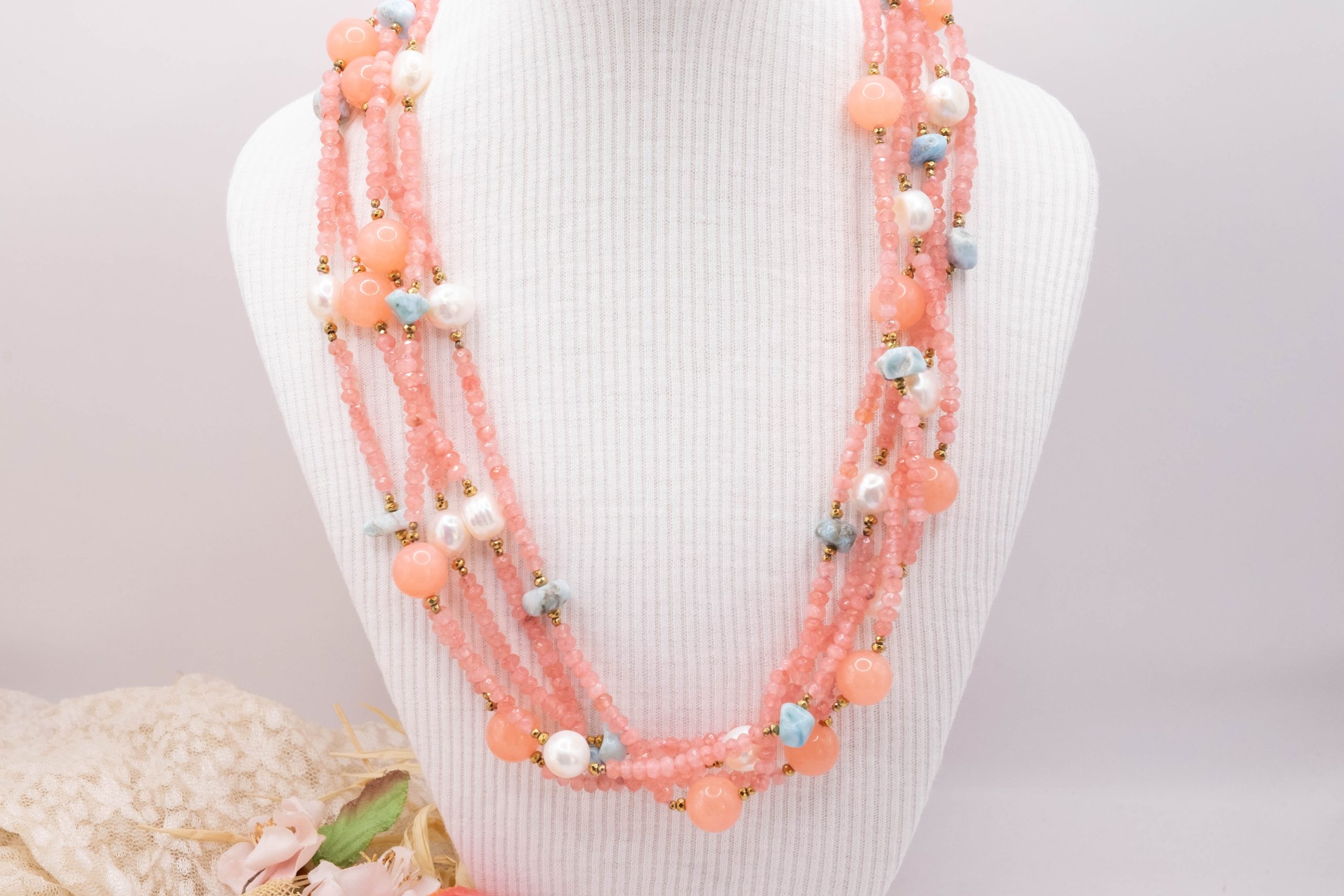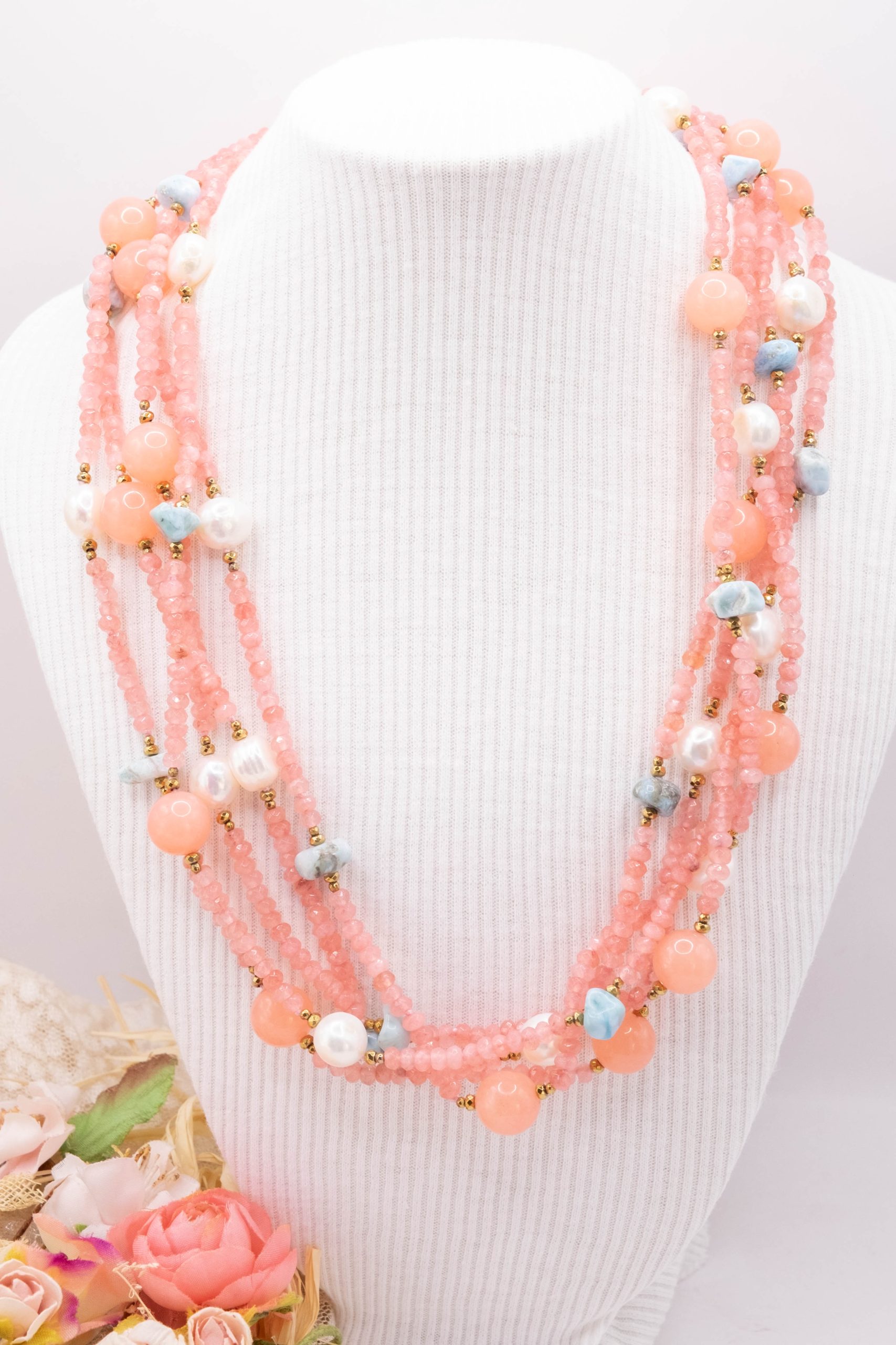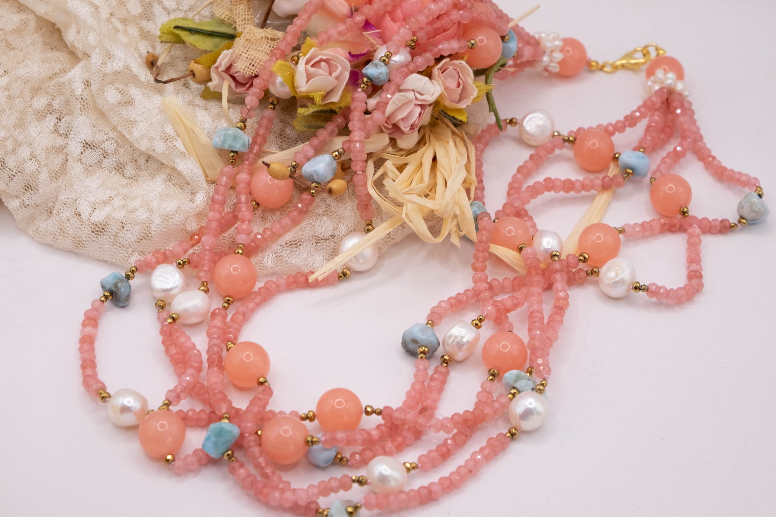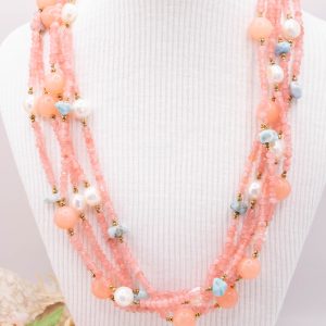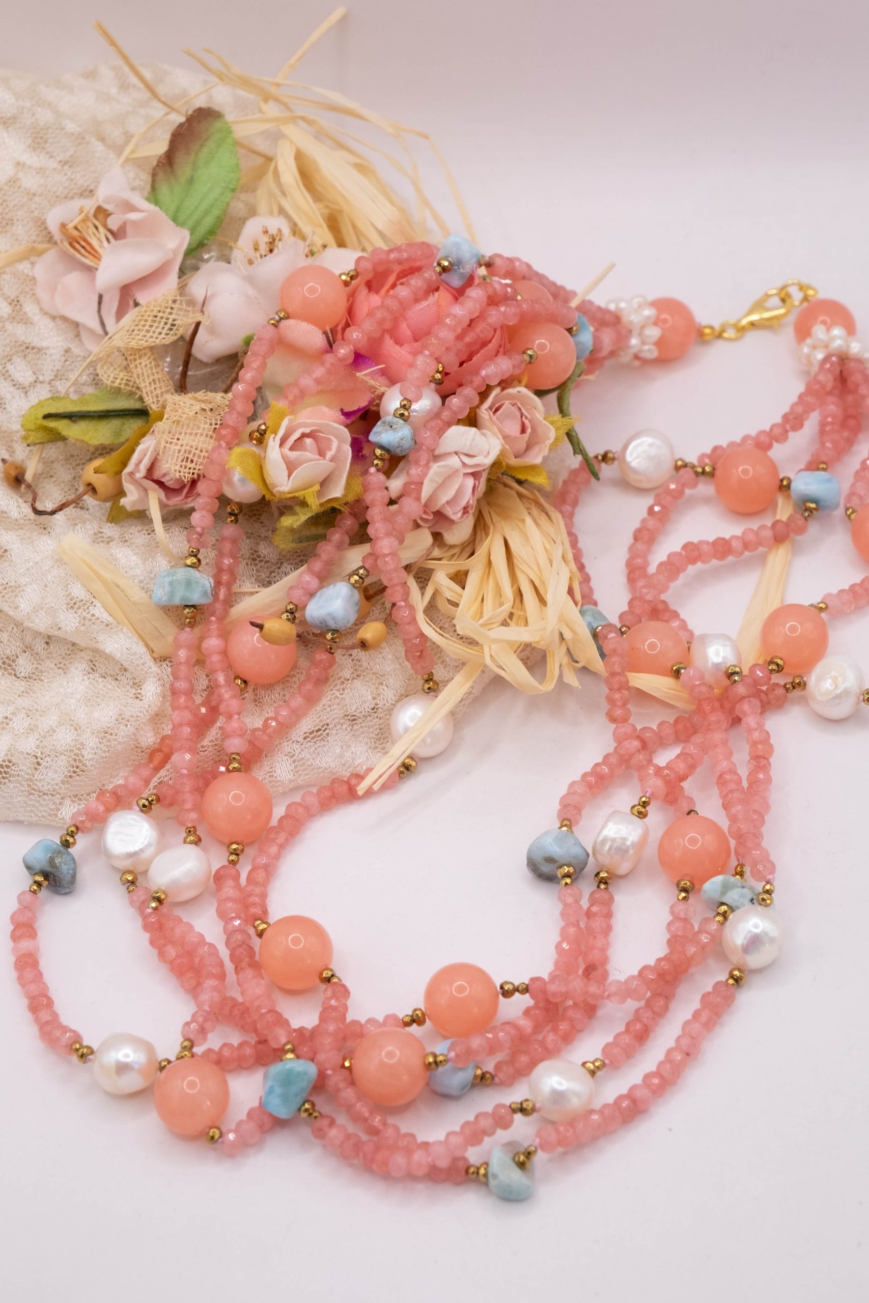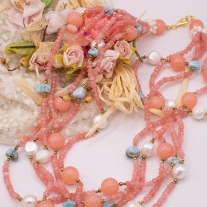 Collana Multifilo “Sorbetto Rosa e Mare” Giada Larimar Perle Argento 925
