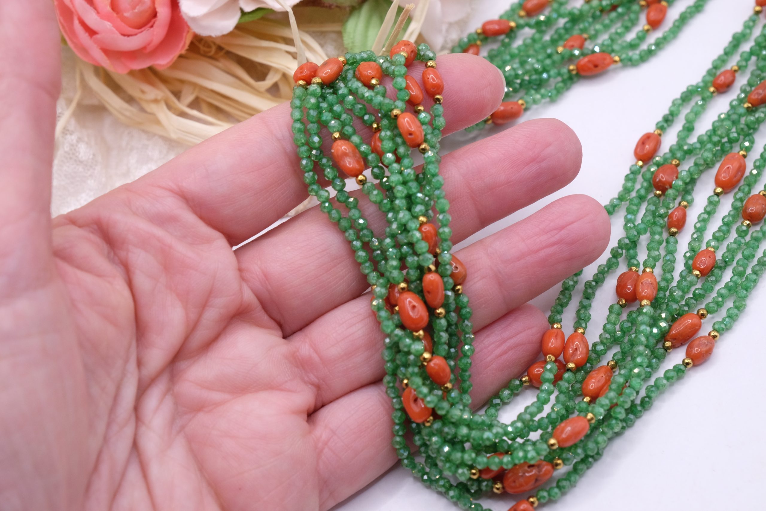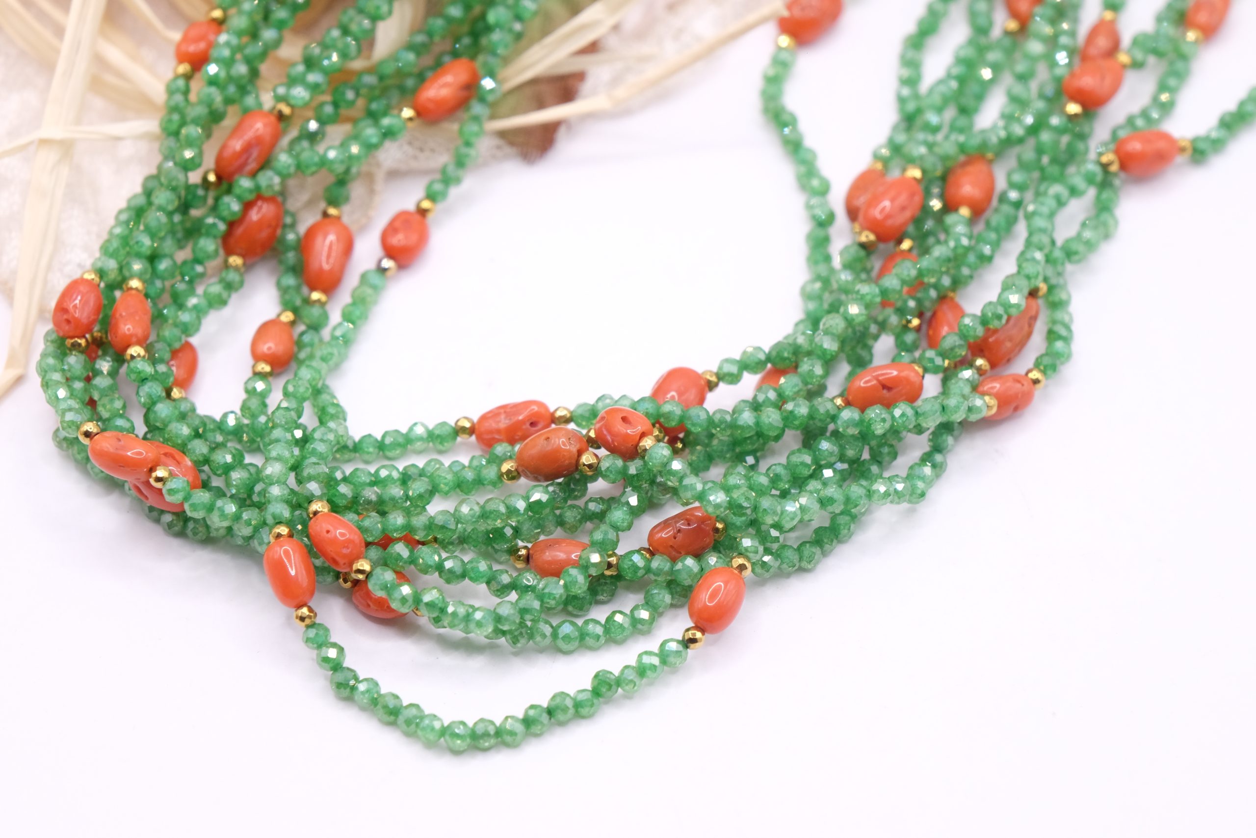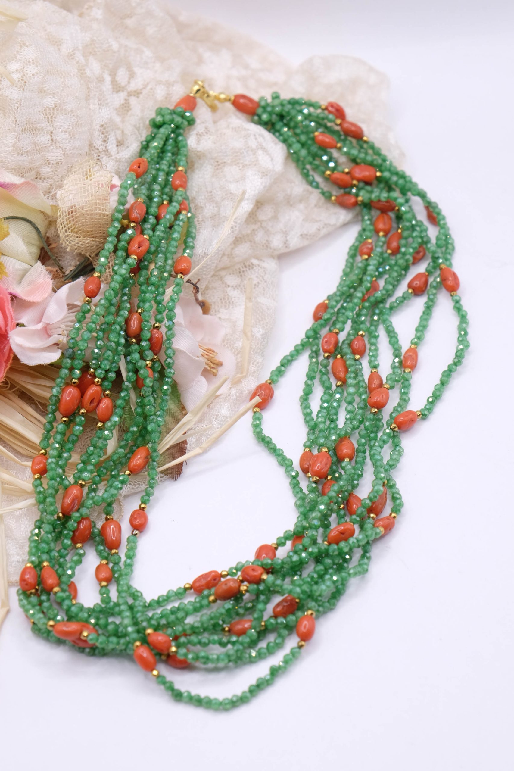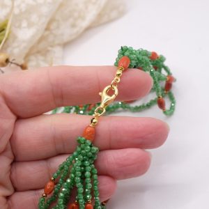 Strabiliante ed elegante collana artigianale multifilo (ben 10 fili) in zirconi naturali verdi di alta qualità alternati a corallo naturale a piccole spole, top quality del Mediterraneo. Le finiture sono in argento 925 placcato oro. Dal vivo lascia senza fiato