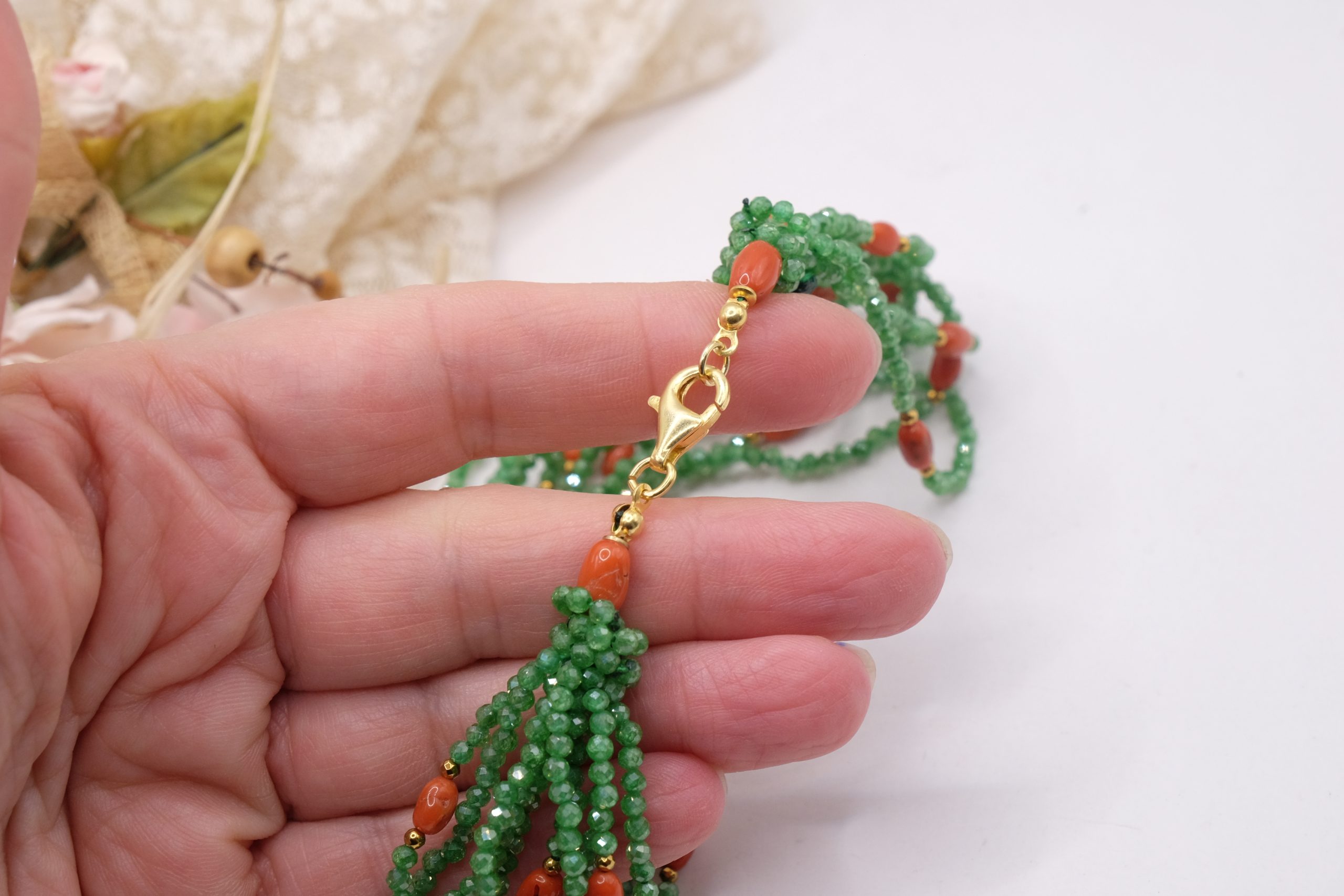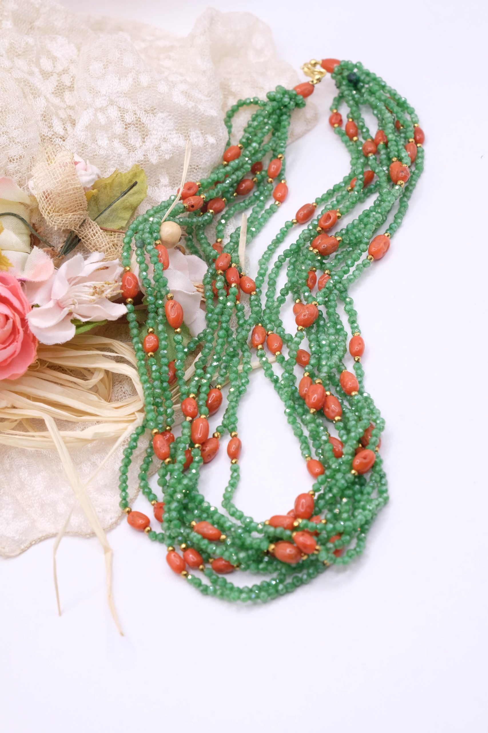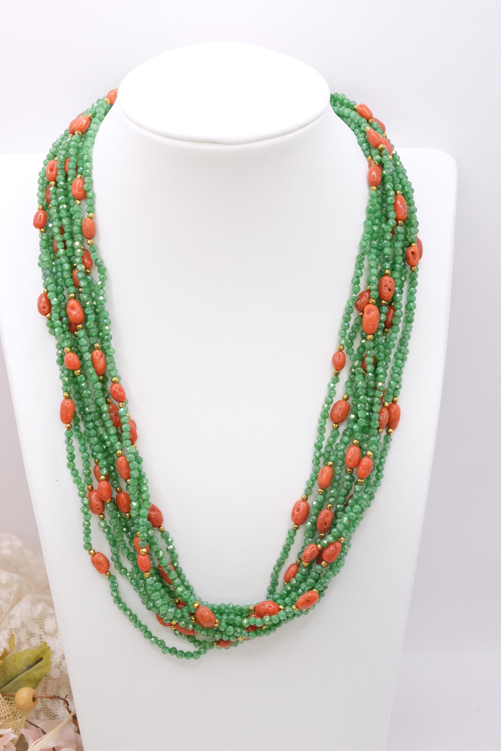 Strabiliante ed elegante collana artigianale multifilo (ben 10 fili) in zirconi naturali verdi di alta qualità alternati a corallo naturale a piccole spole, top quality del Mediterraneo. Le finiture sono in argento 925 placcato oro. Dal vivo lascia senza fiato