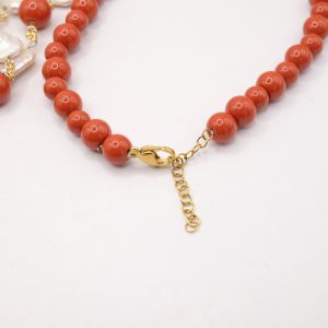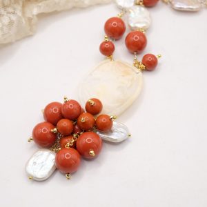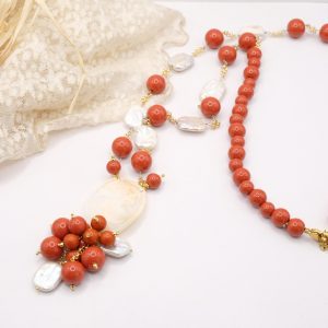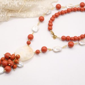 Collana raffinata e femminile, realizzata con pasta di corallo rosso e perle naturali 🤍