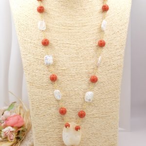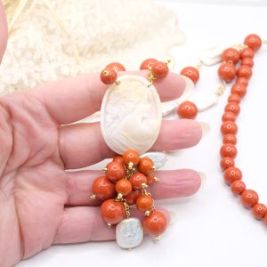 Collana Pasta di Corallo Perle Cammeo di Torre del Greco Lunga