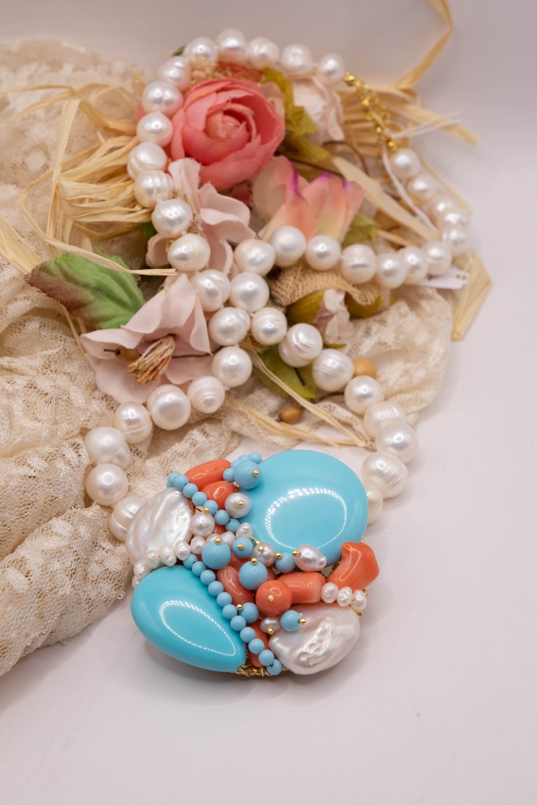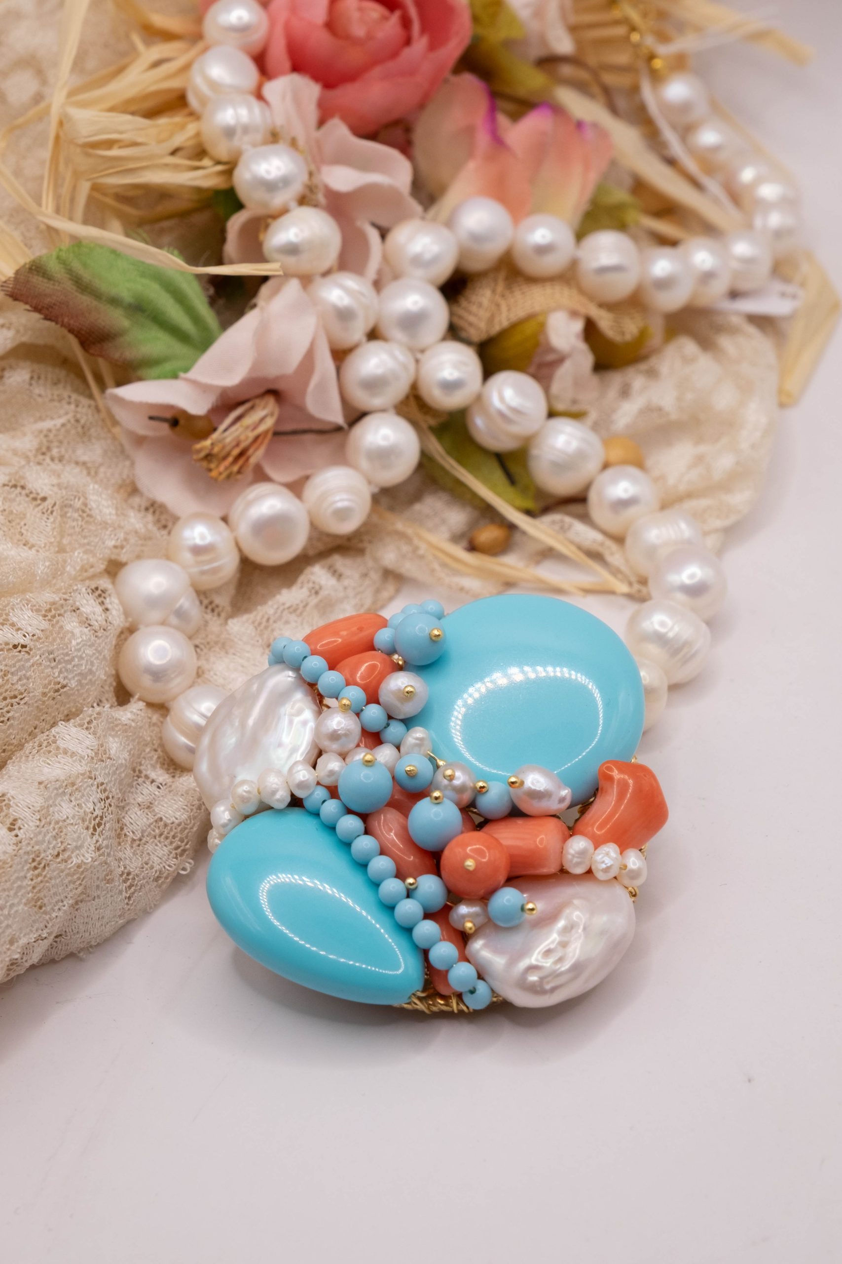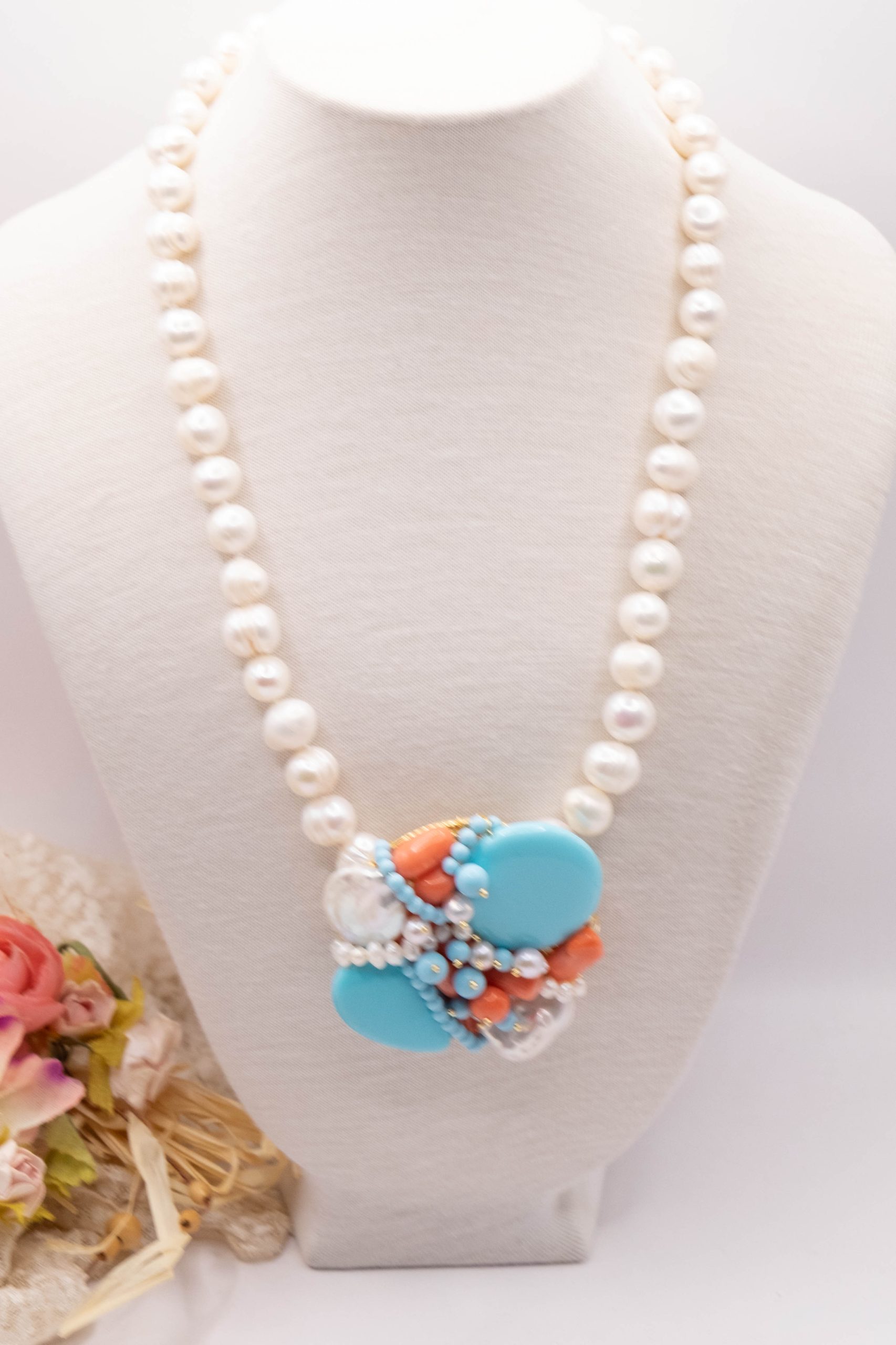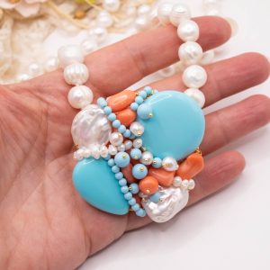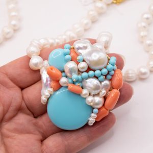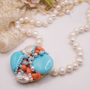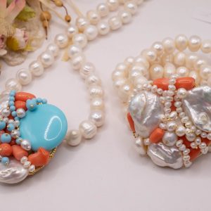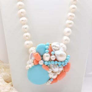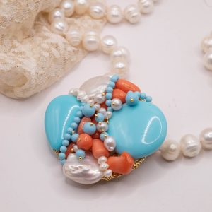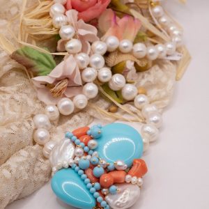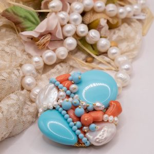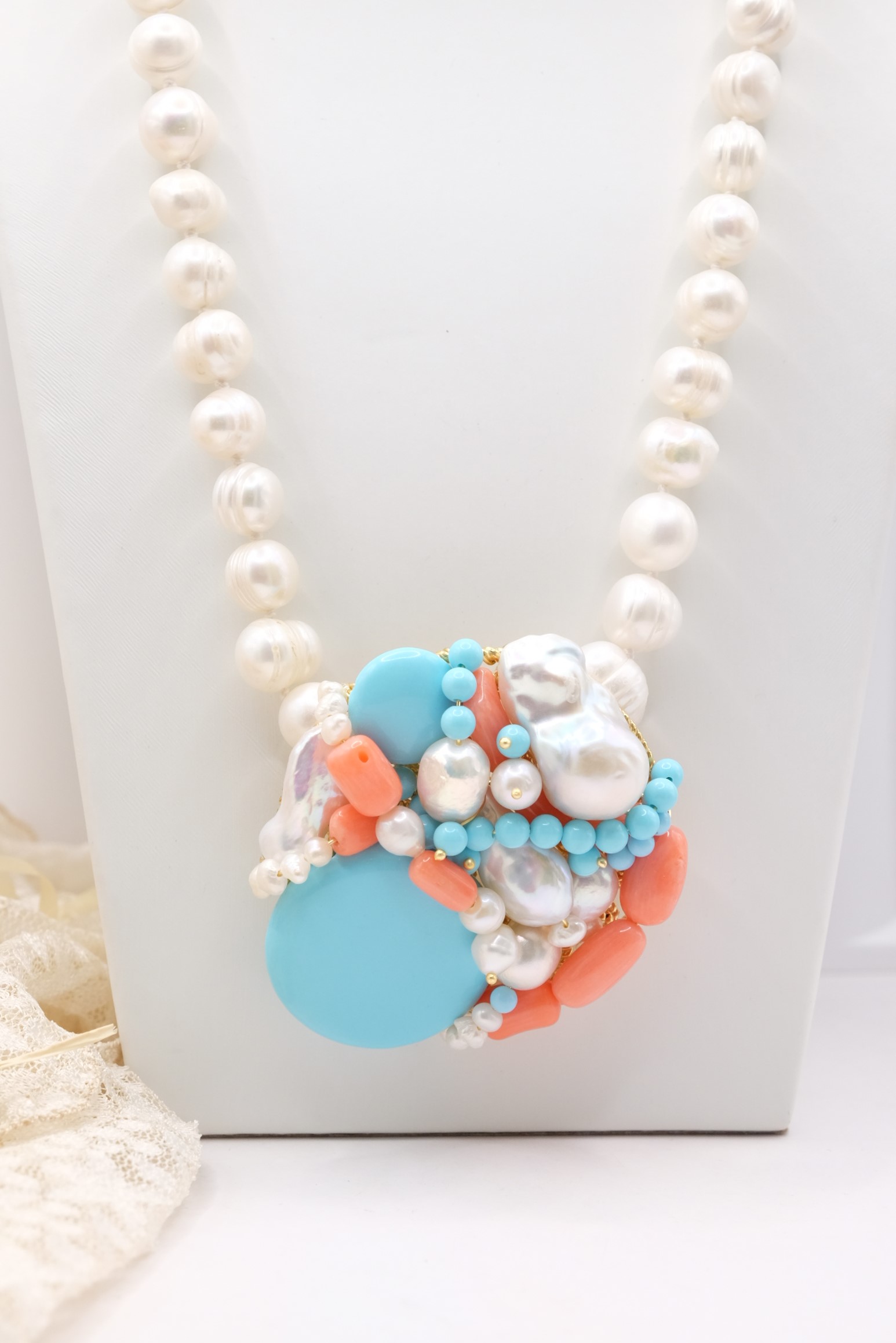 Collana artigianale in perle naturali barocche da 10/11 mm, con un centrale da 5,5/6 cm, tessito a mano con elementi in pasta di turchese 4 fiori, perle luminose e corallo bamboo rosa