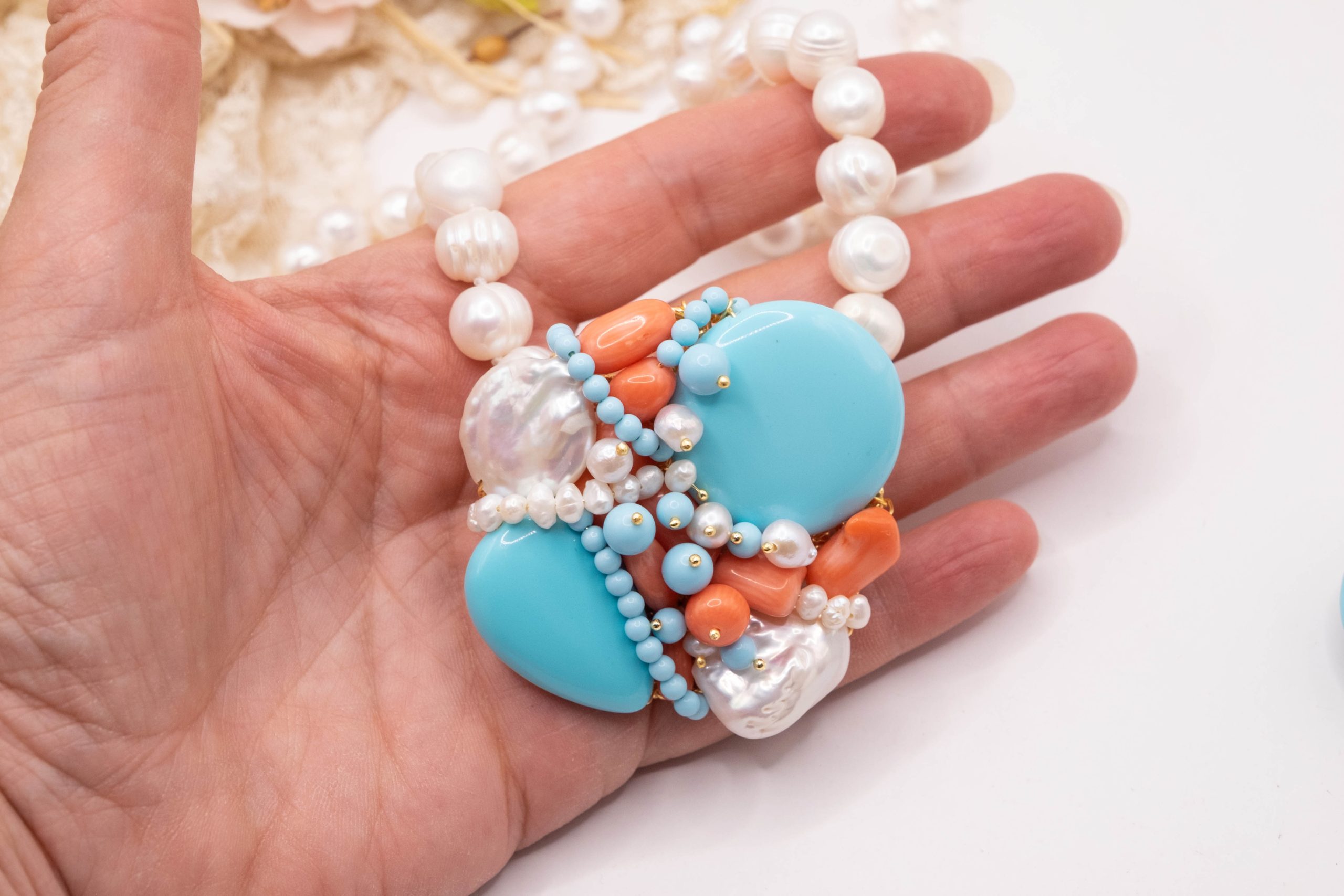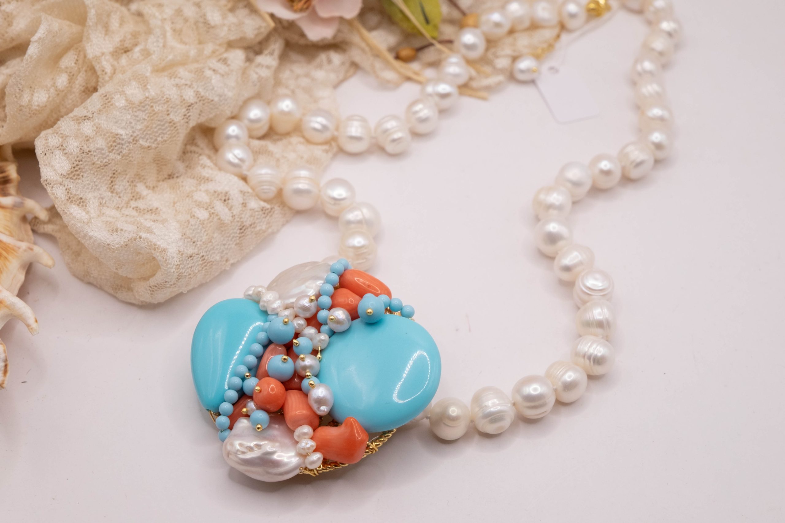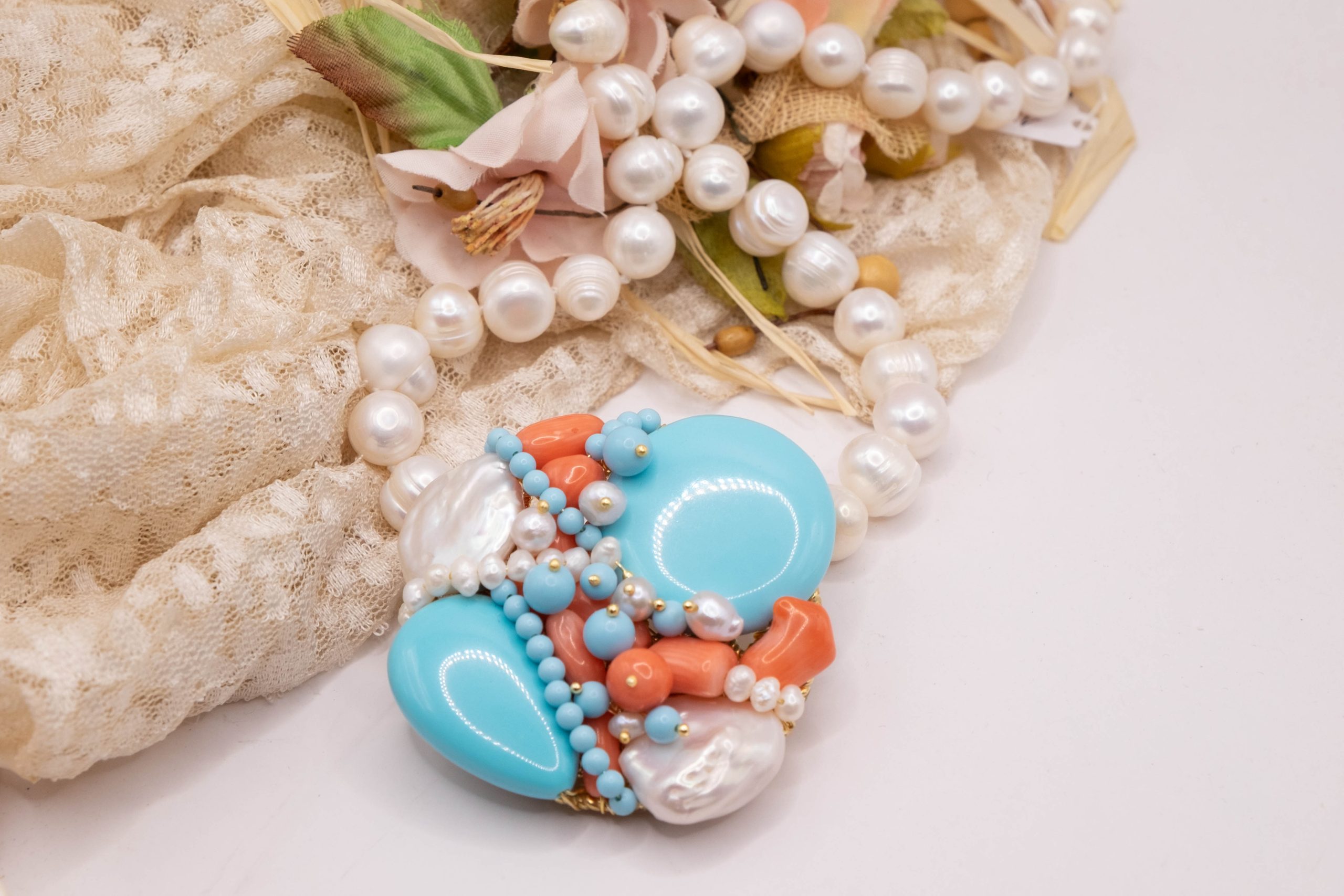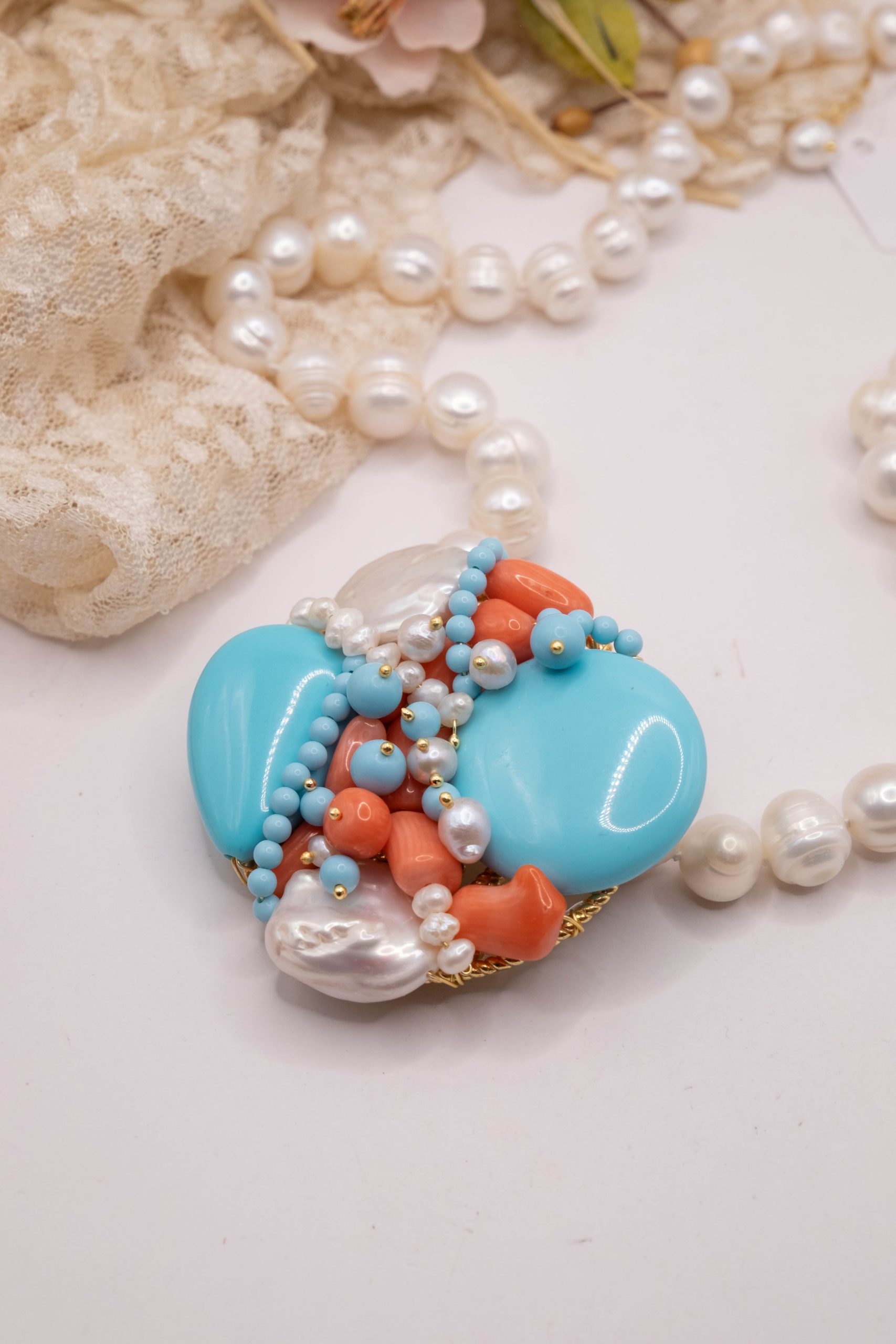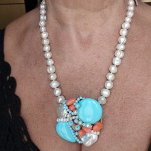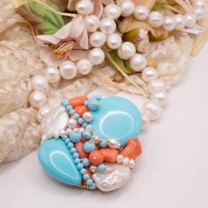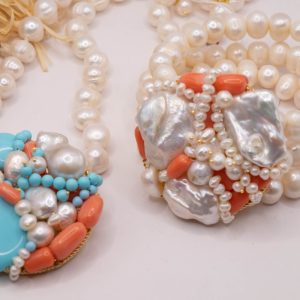 Collana artigianale in perle naturali barocche da 10/11 mm, con un centrale da 5,5/6 cm, tessito a mano con elementi in pasta di turchese 4 fiori, perle luminose e corallo bamboo rosa