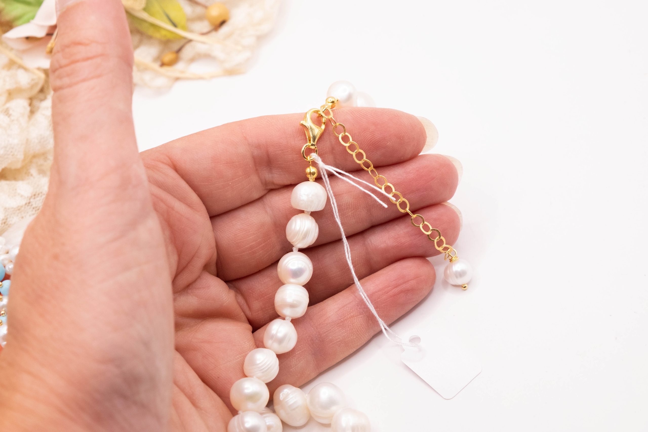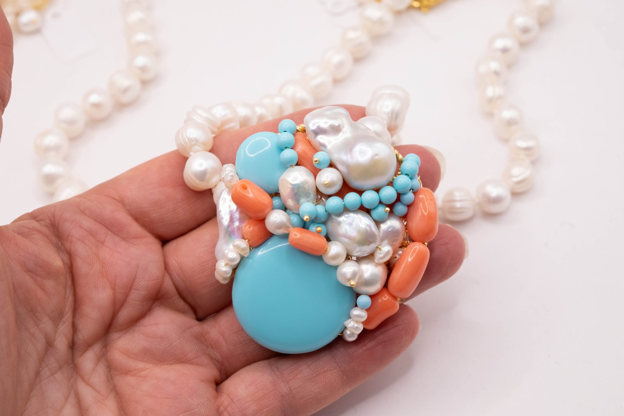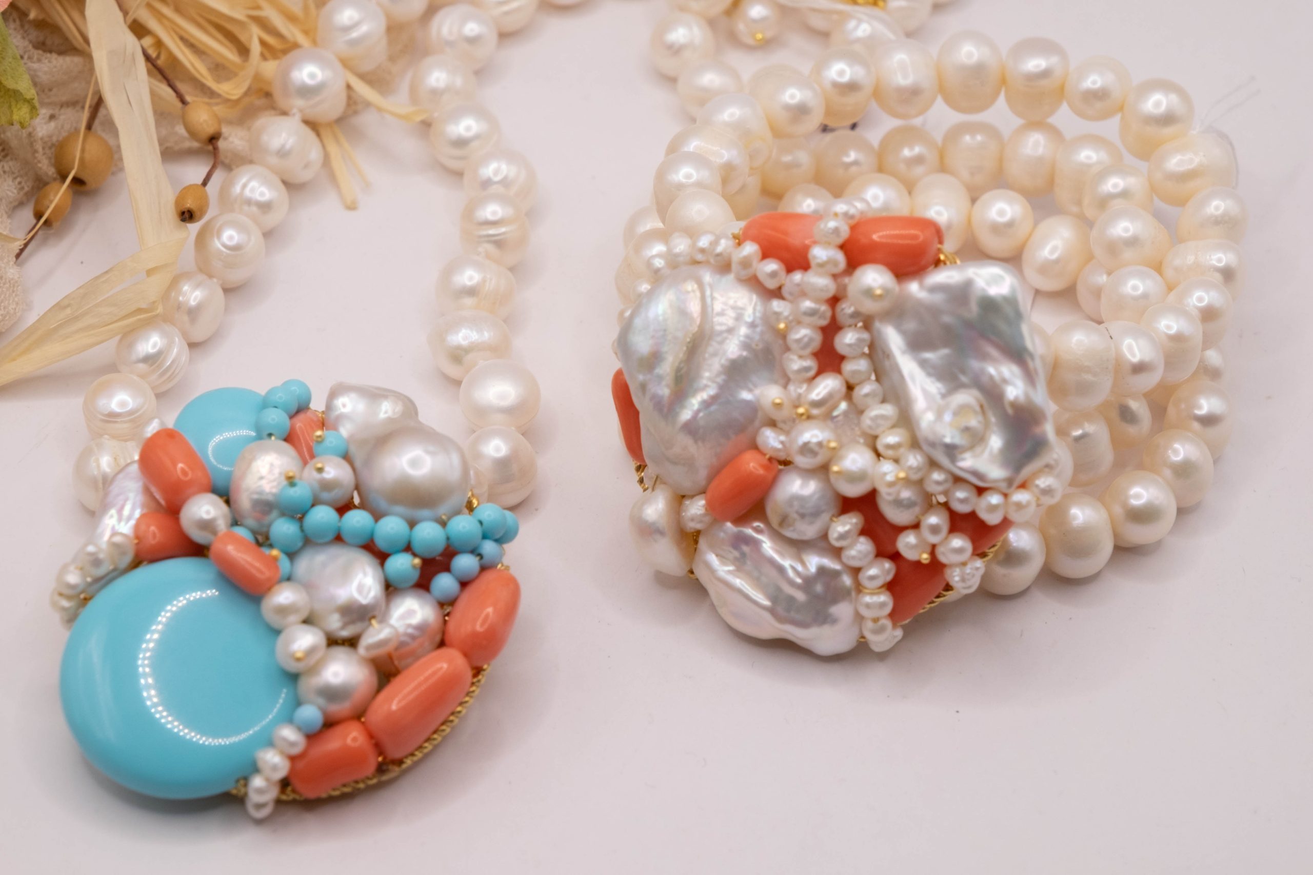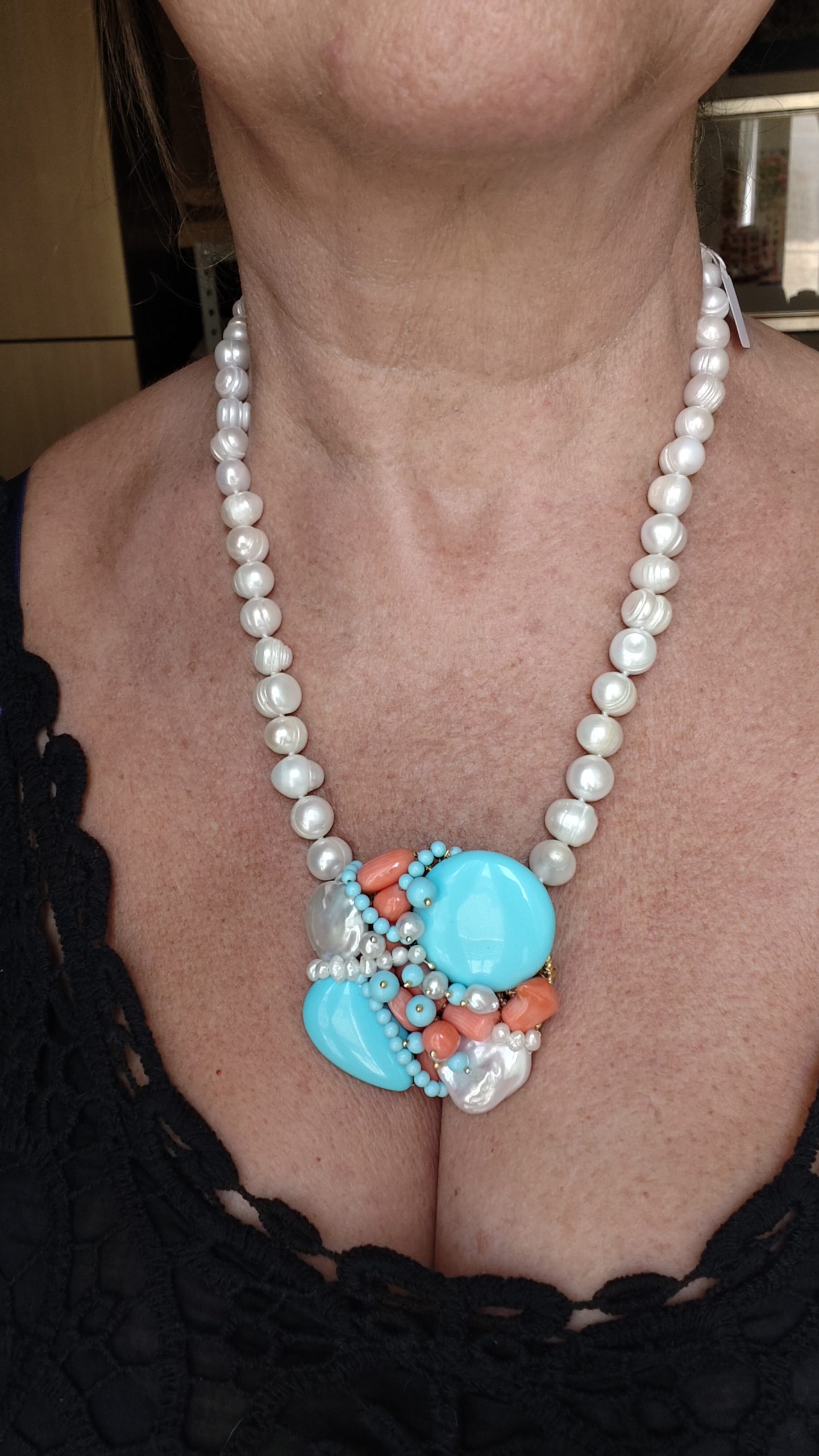 Collana artigianale in perle naturali barocche da 10/11 mm, con un centrale da 5,5/6 cm, tessito a mano con elementi in pasta di turchese 4 fiori, perle luminose e corallo bamboo rosa