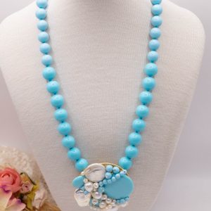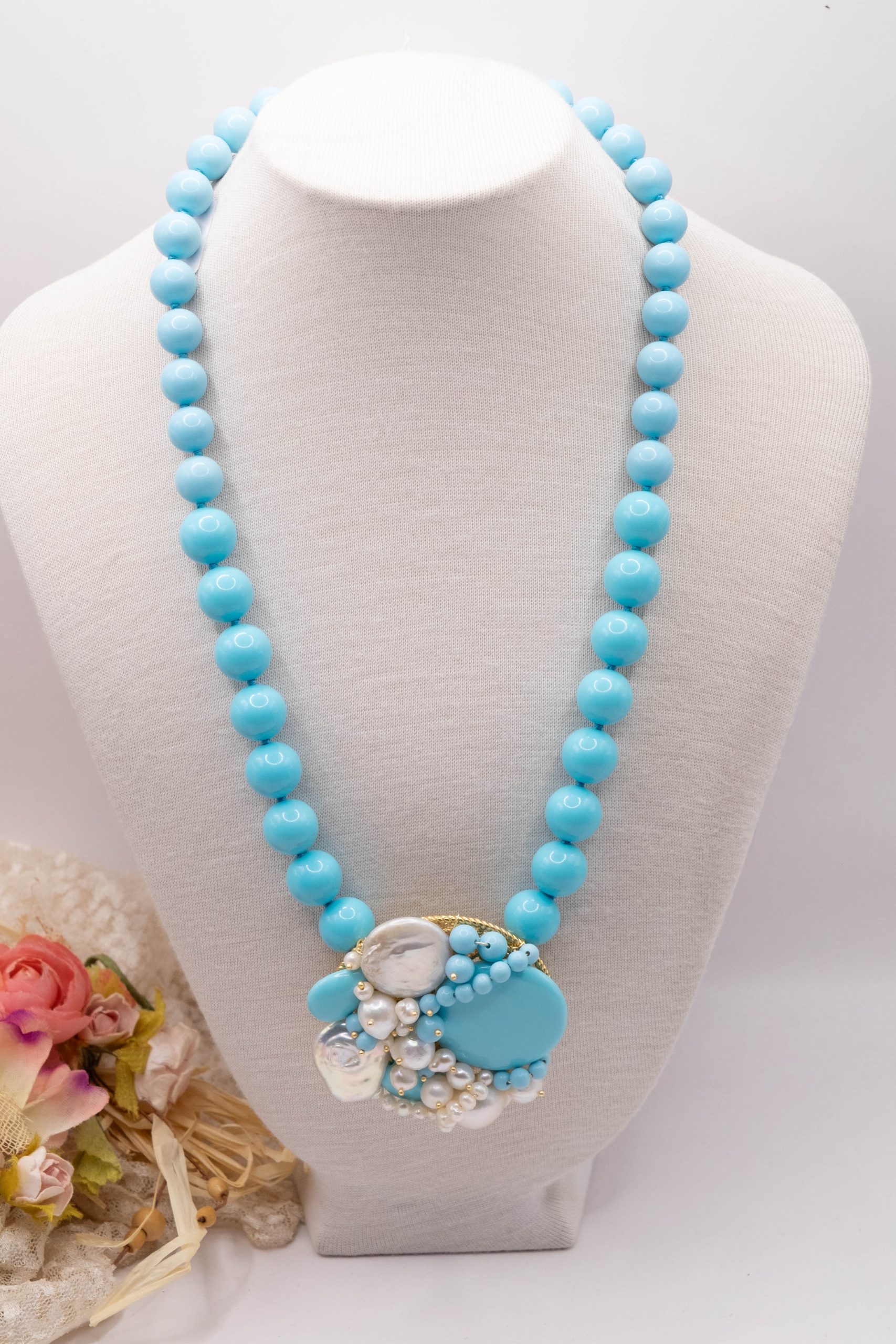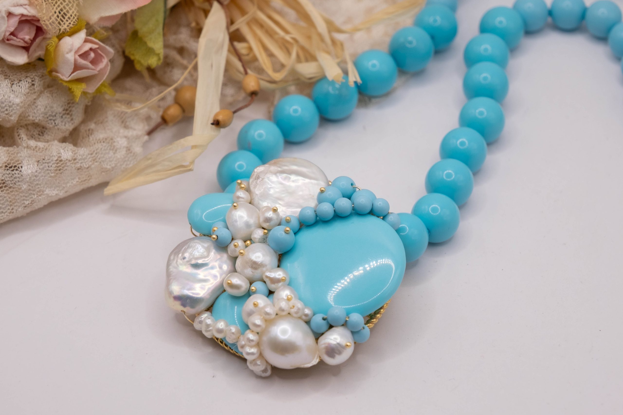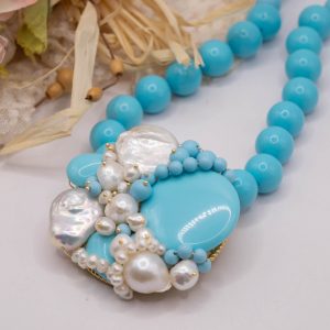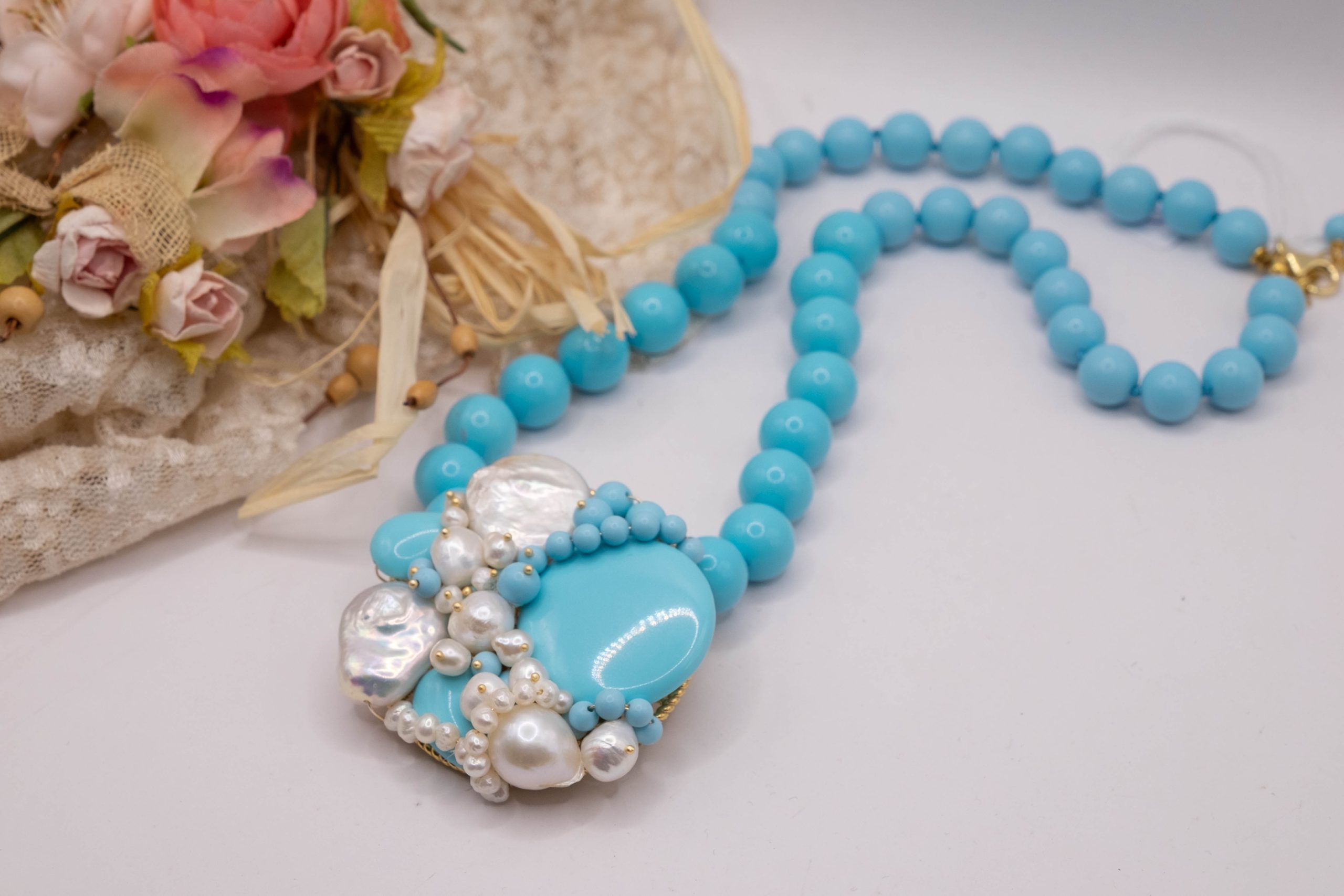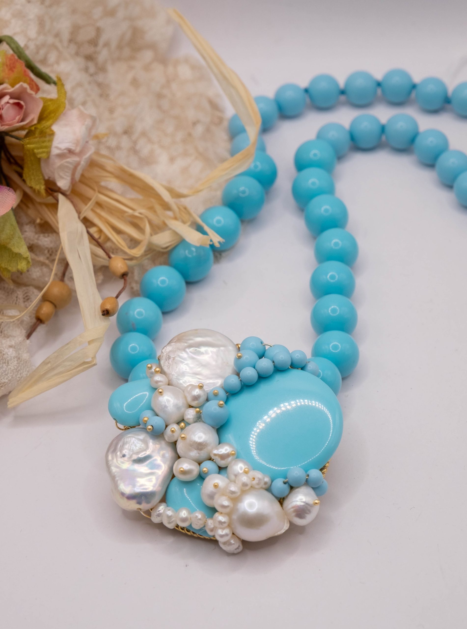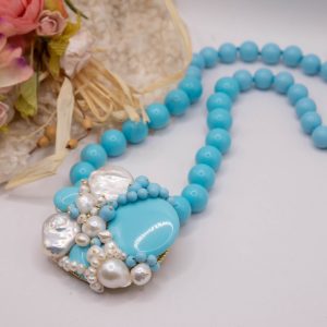 Collana artigianale in pasta di turchese da 13 mm, con un centrale da 5,5 cm, tessito a mano con elementi in pasta di turchese 4 fiori e perle molto luminose