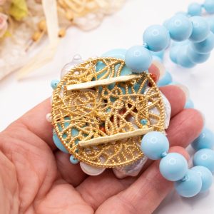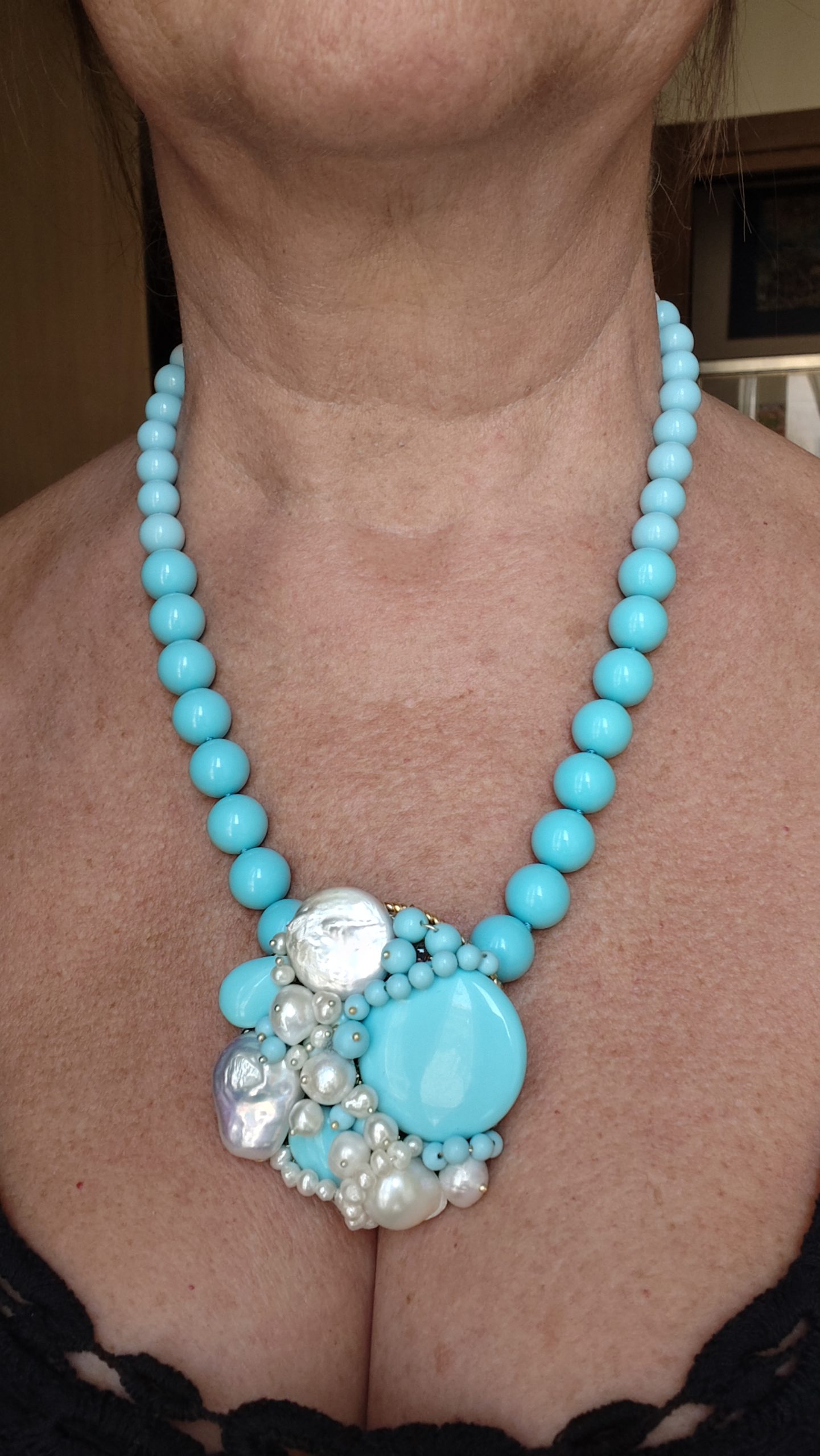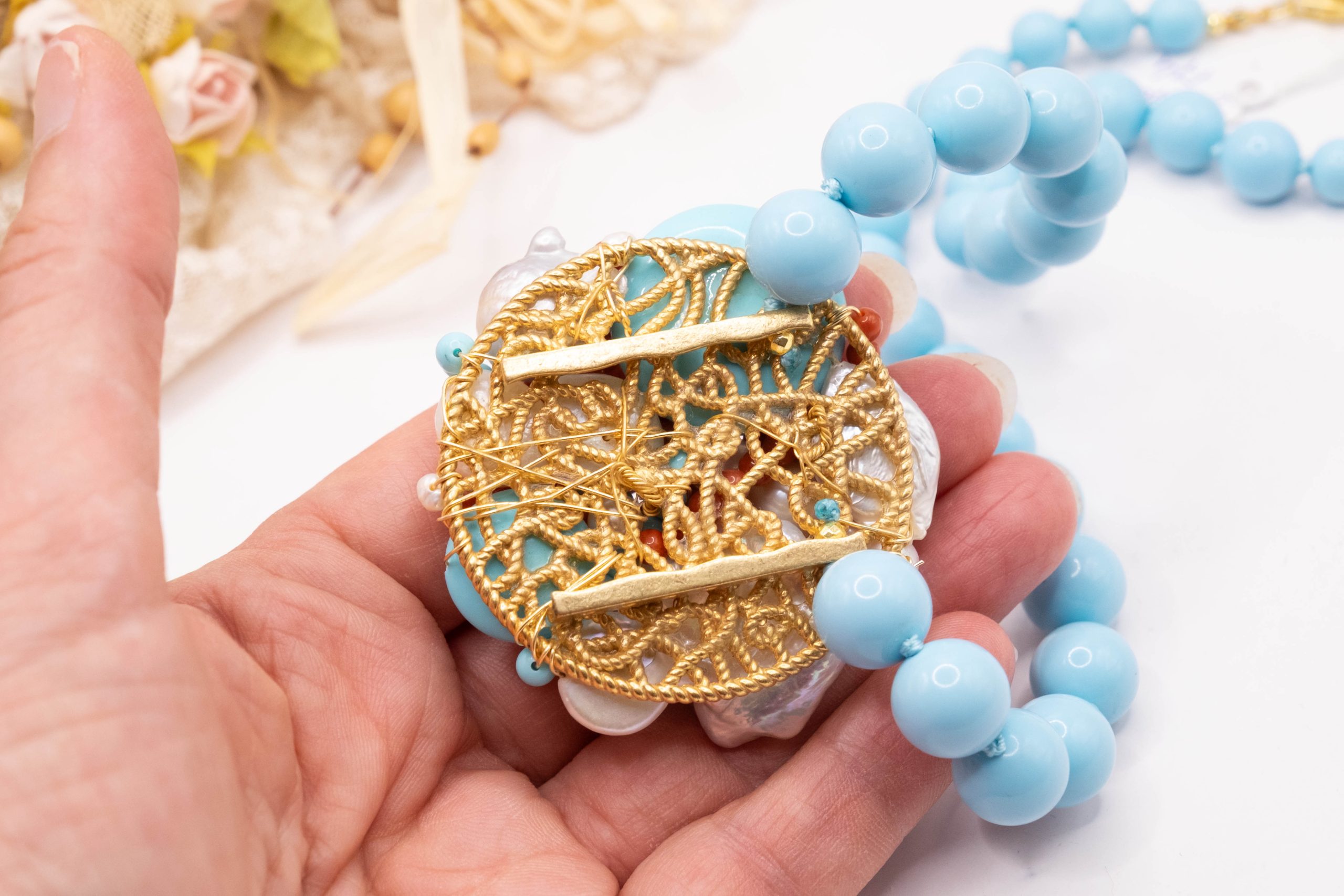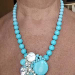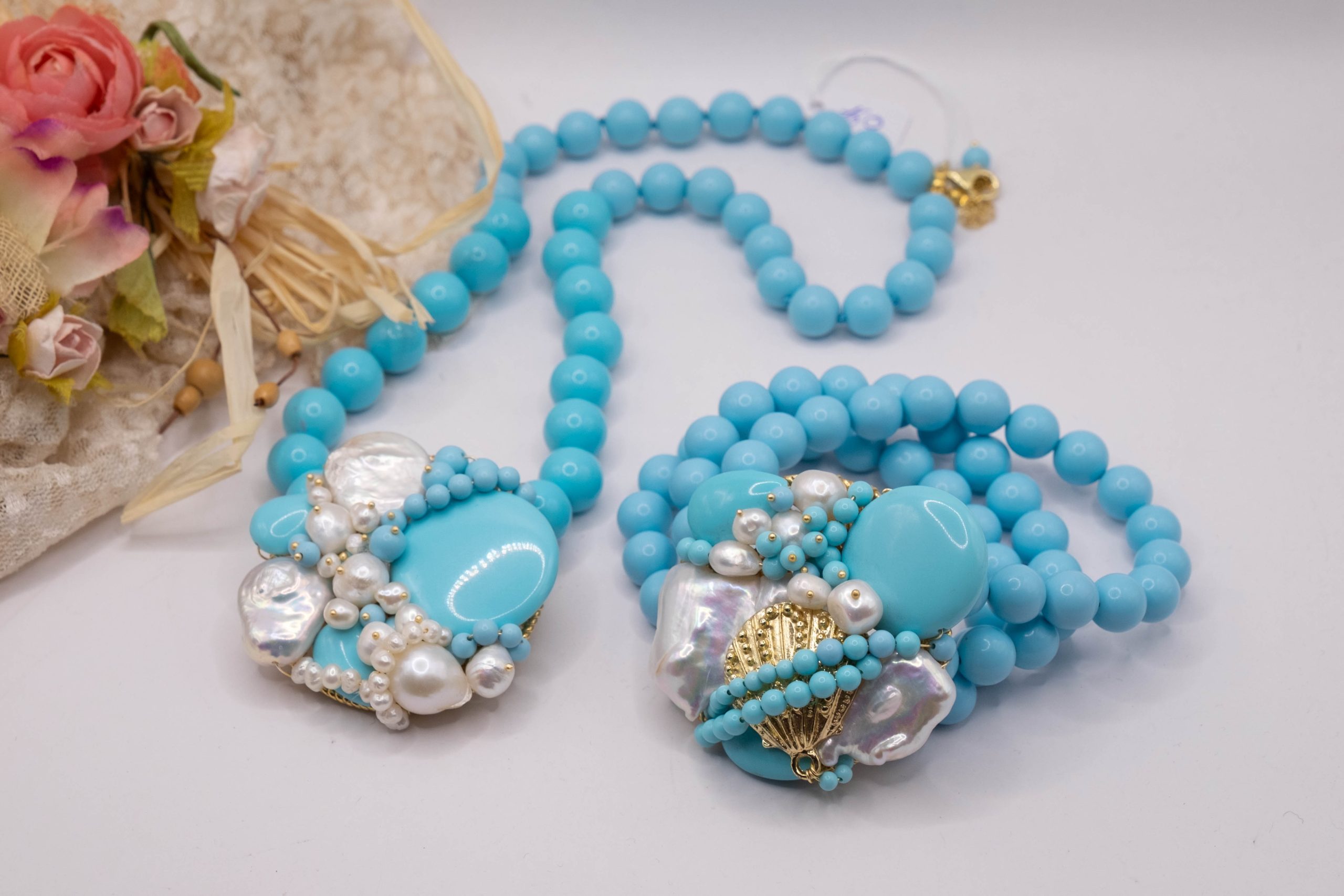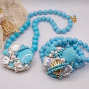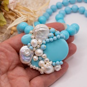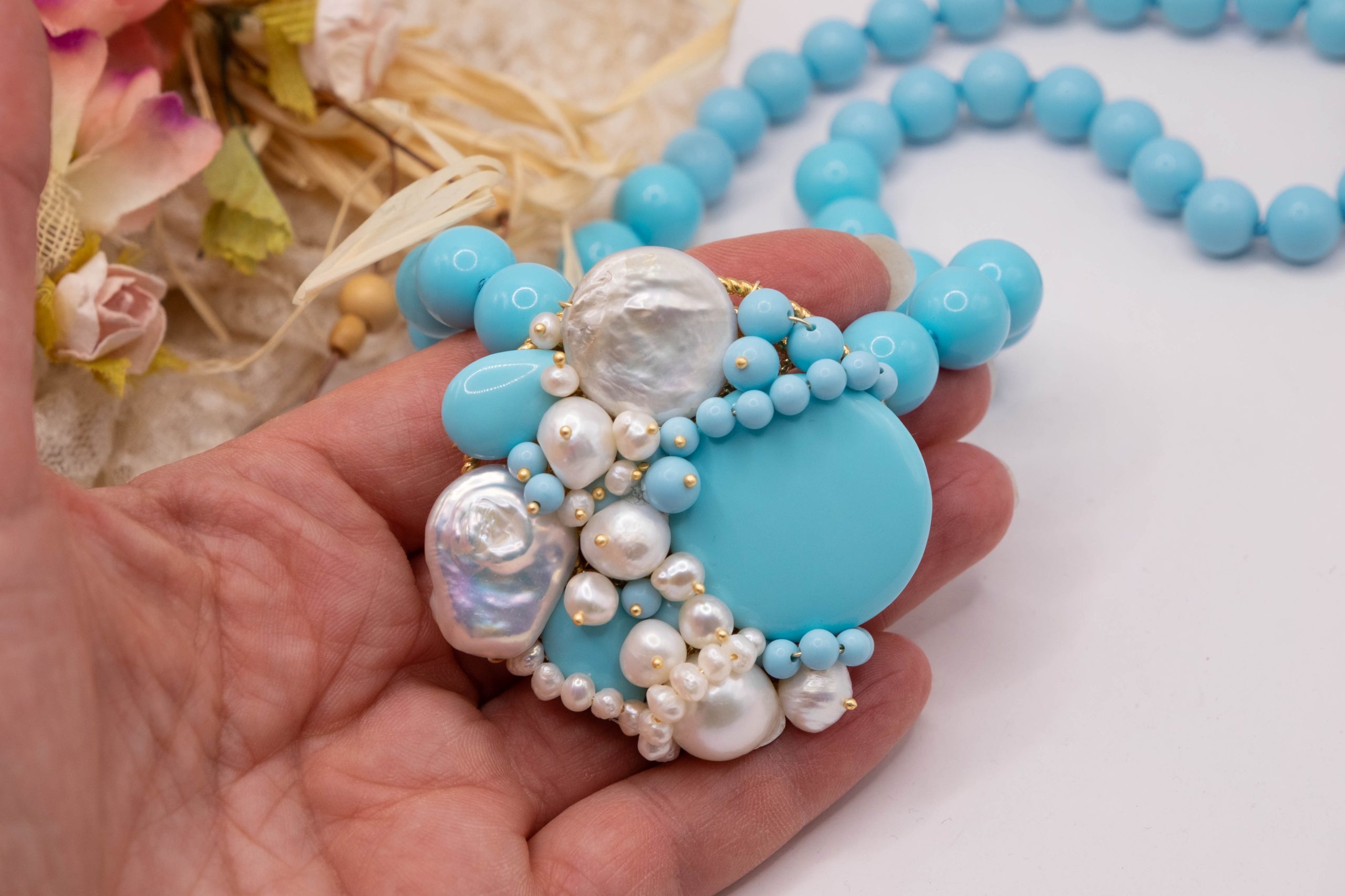 Collana artigianale in pasta di turchese da 13 mm, con un centrale da 5,5 cm, tessito a mano con elementi in pasta di turchese 4 fiori e perle molto luminose