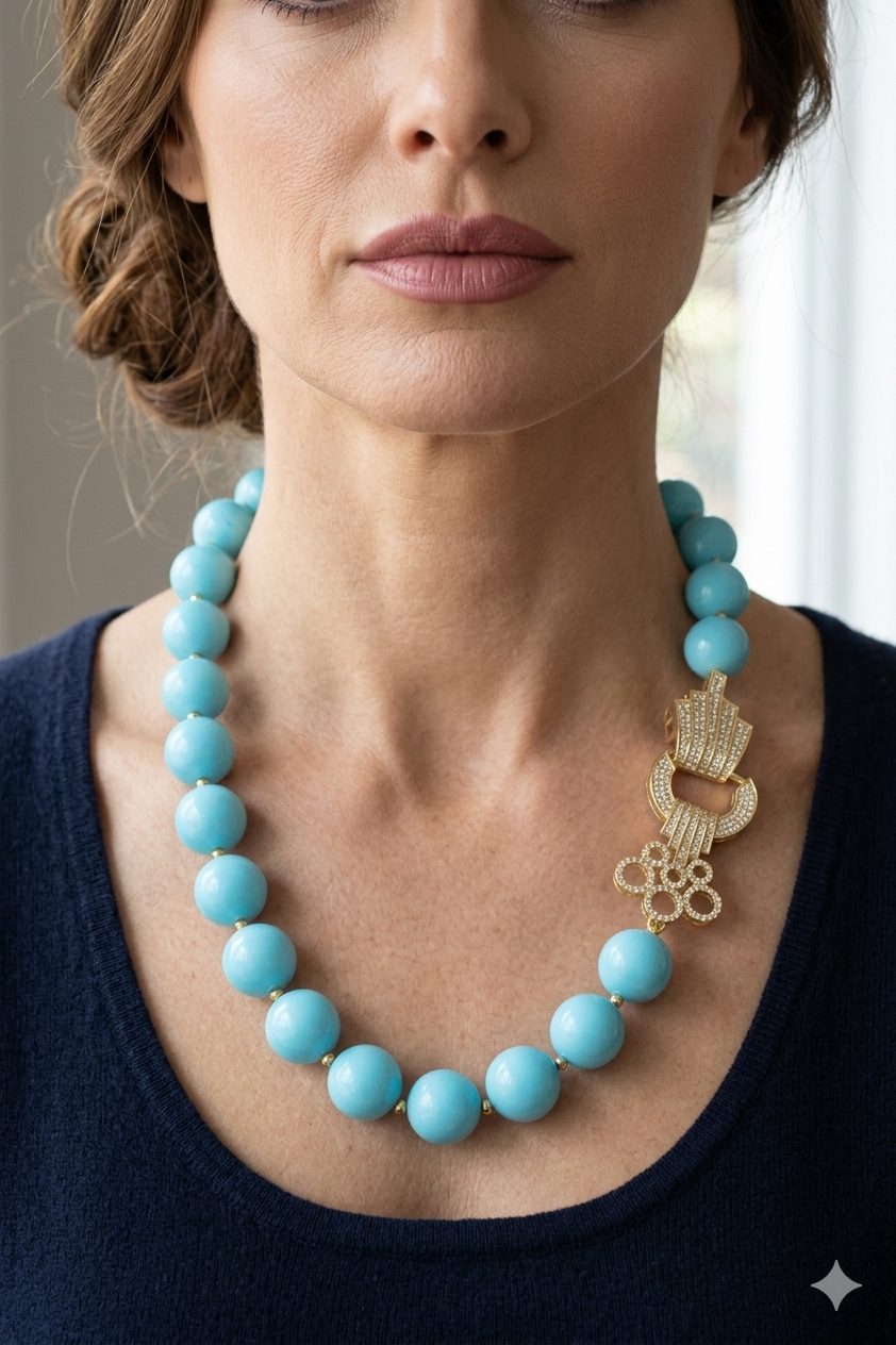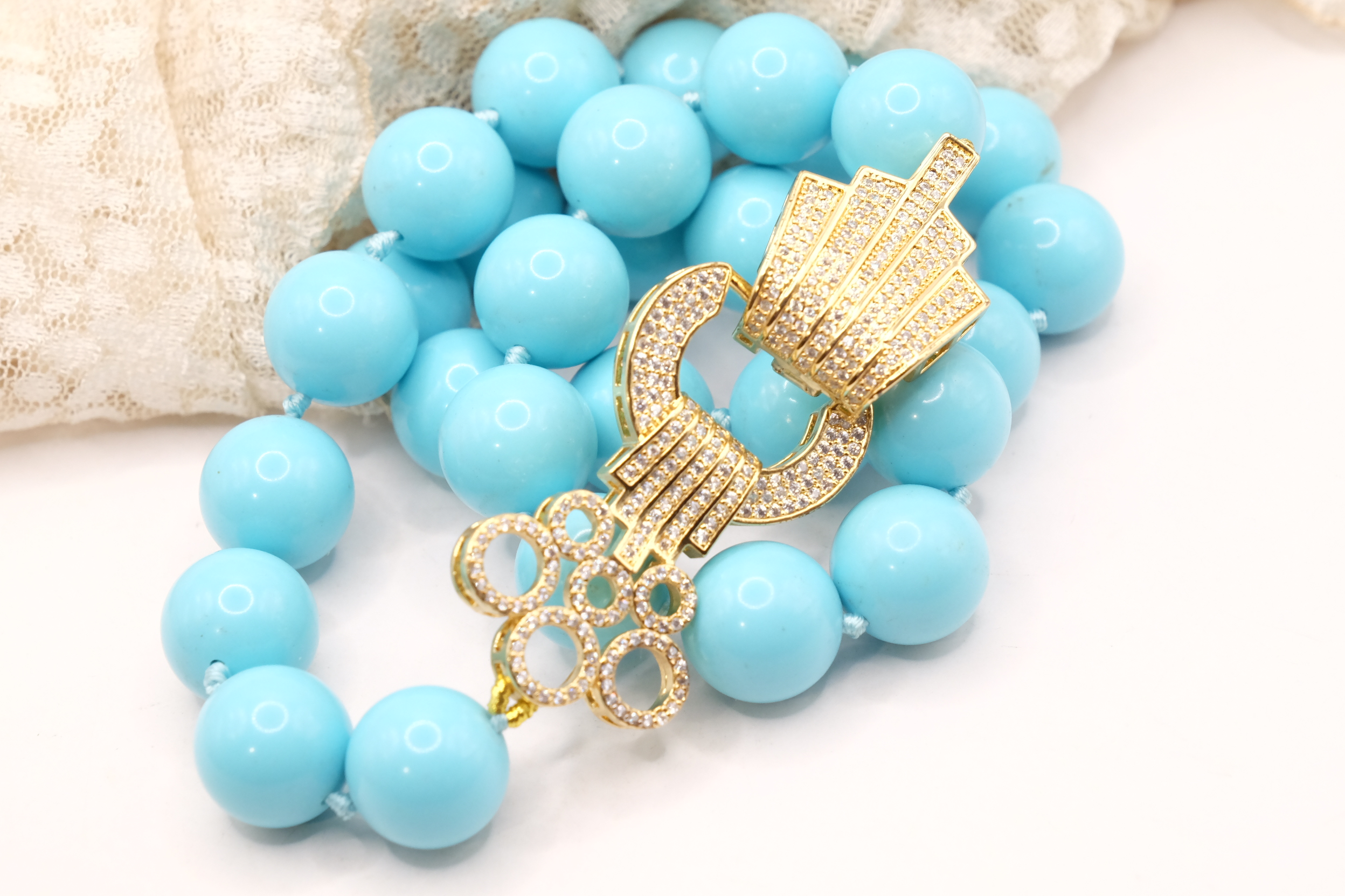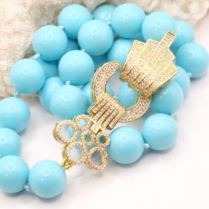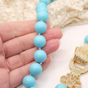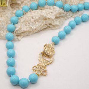 Collana in pasta di turchese a grandi sfere da 15mm, con bellissima chiusura gioiello in acciaio e zirconi
