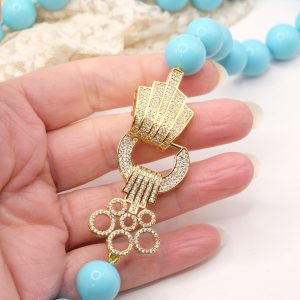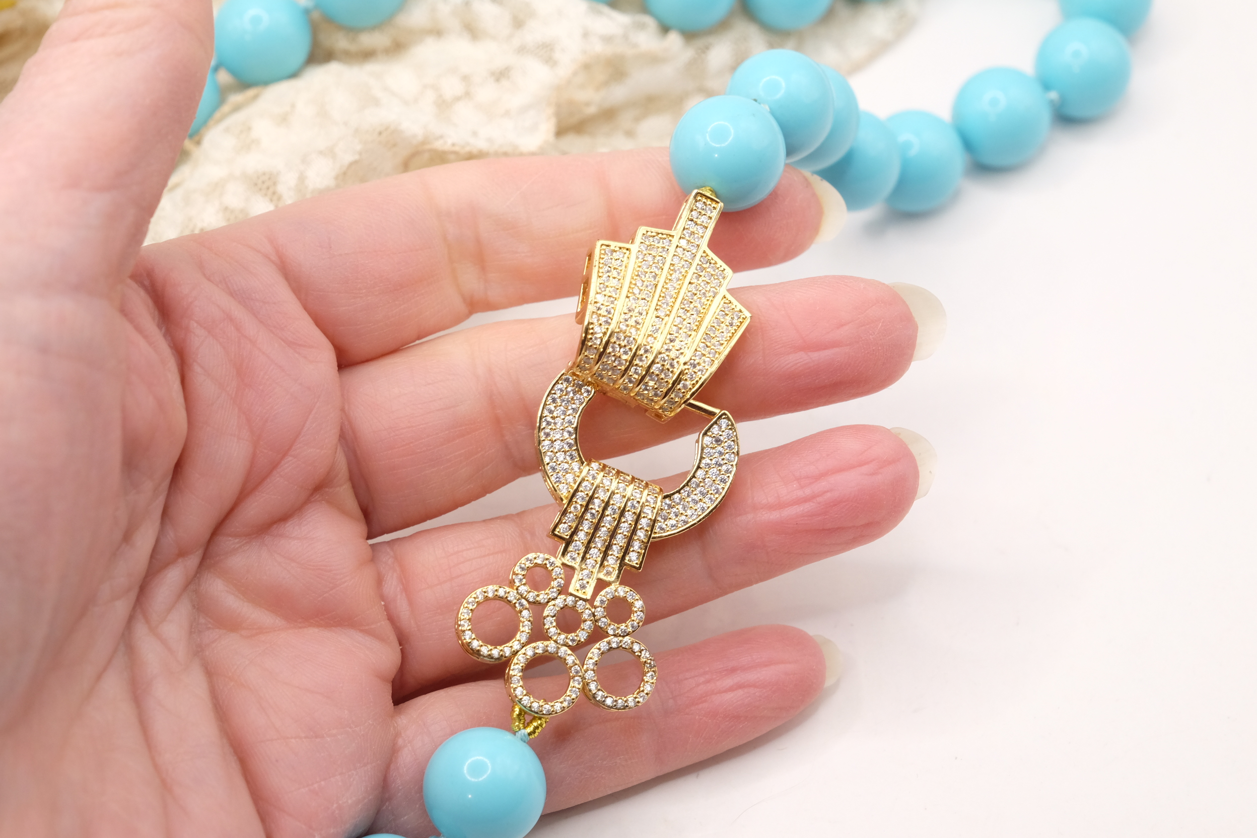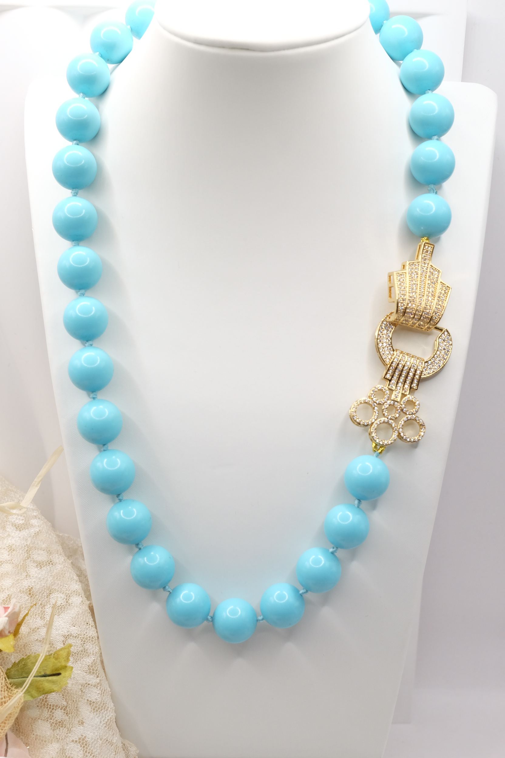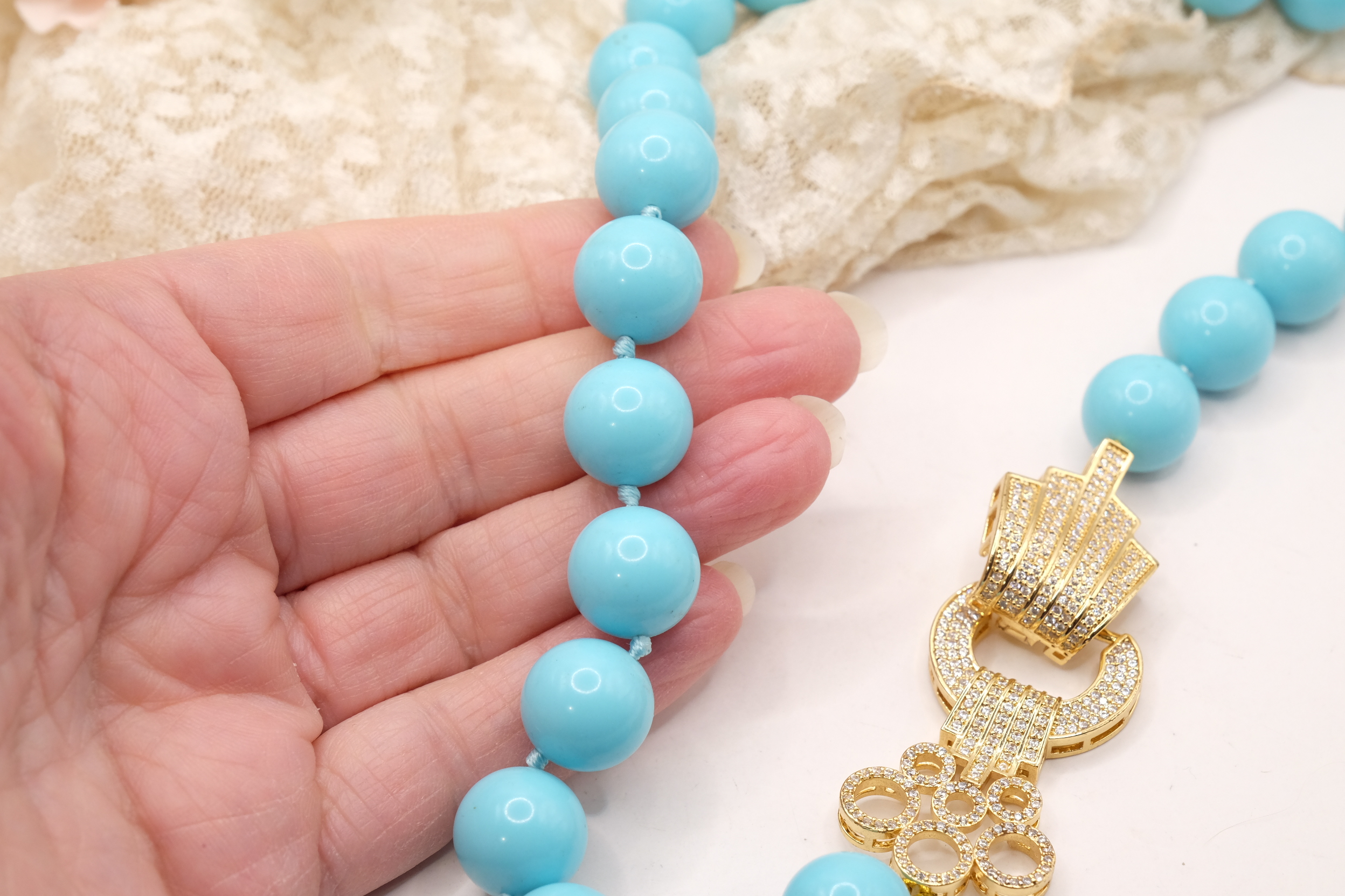 Collana in pasta di turchese a grandi sfere da 15mm, con bellissima chiusura gioiello in acciaio e zirconi