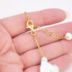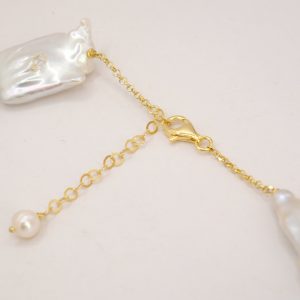 Collana lussuosa di grande fascino, in luminose e grandi perle bianche barocche e 5 meravigliosi barilotti in preziosa acquamarina. Le finiture sono in argento 925 Placcato oro