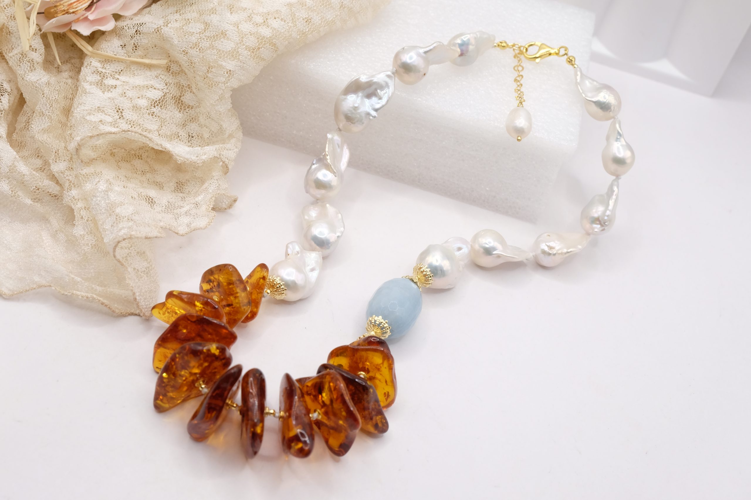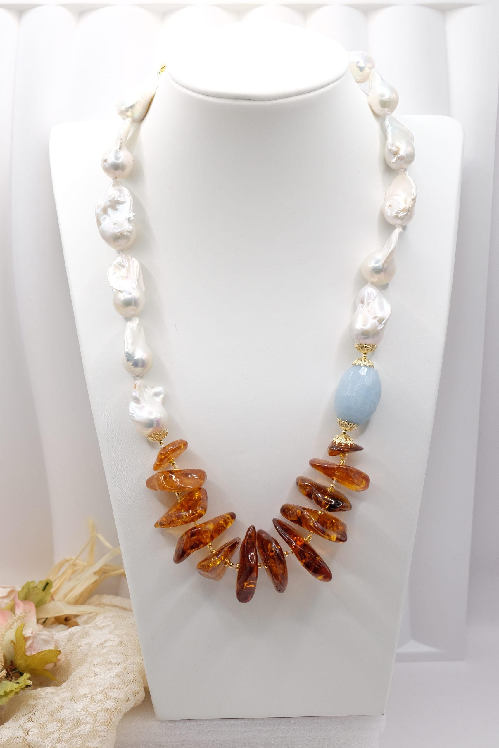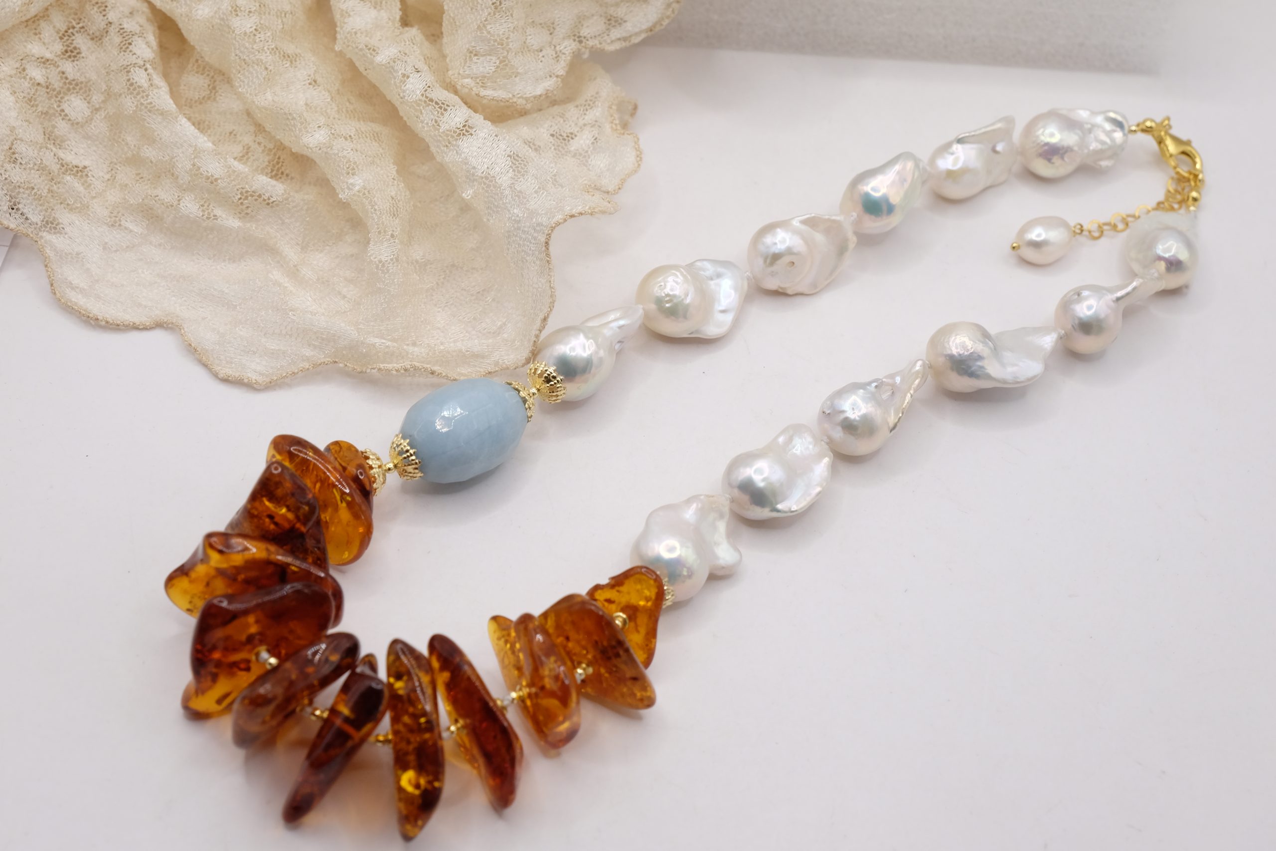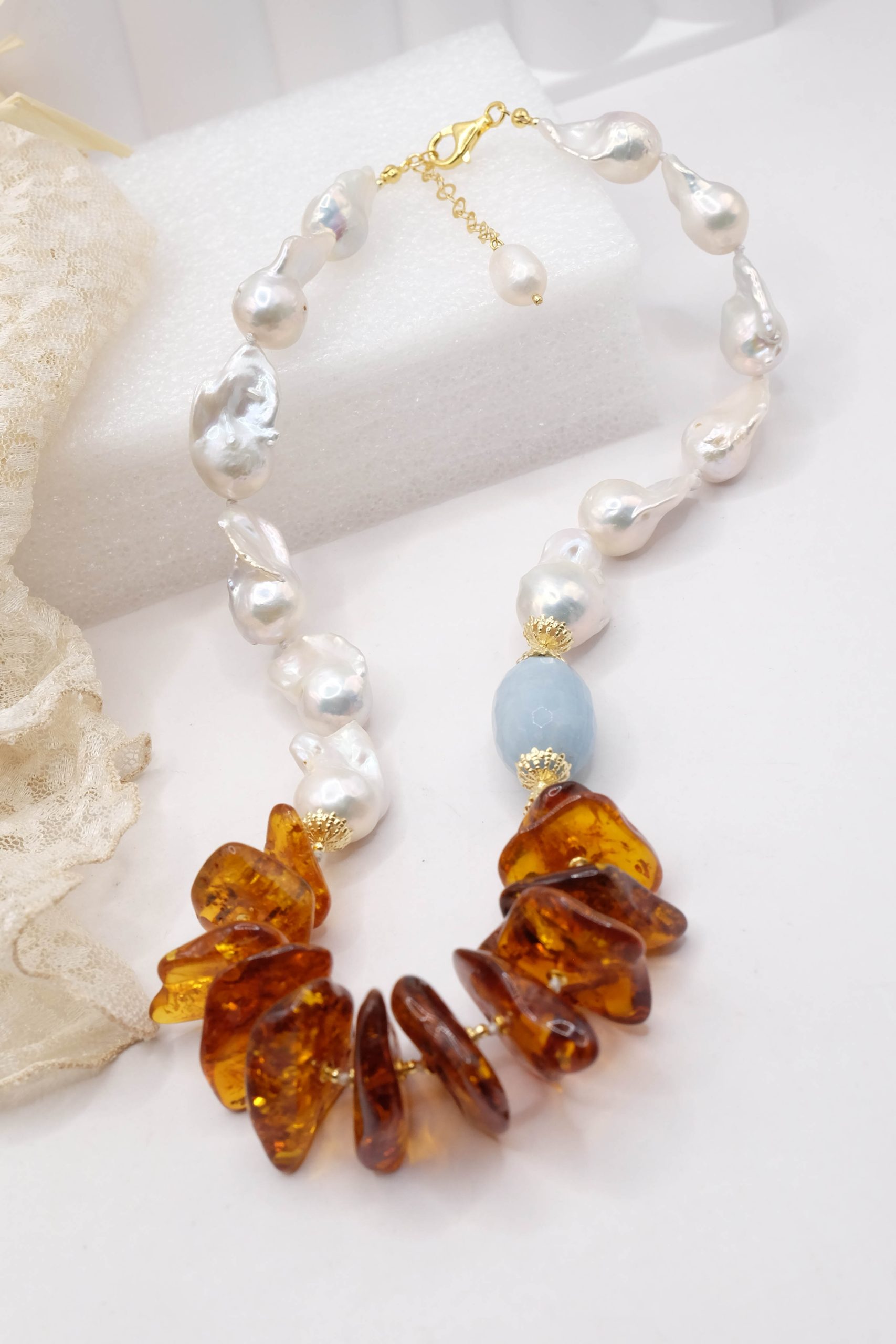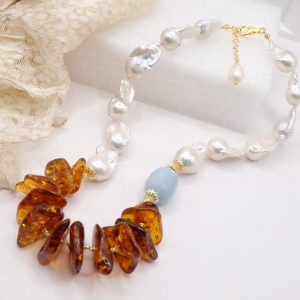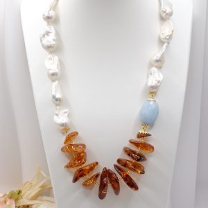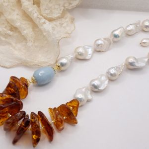 Collana lussuosa di grande fascino, in luminose perle bianche barocche da 25 x 15 mm, meravigliosa ambra del baltico e barilotto di acquamarina da 27 x 17 mm. Le finiture sono in argento 925 Placcato oro
