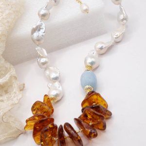 Collana Perle Naturali Barocche Ambra Acquamarina Argento 925