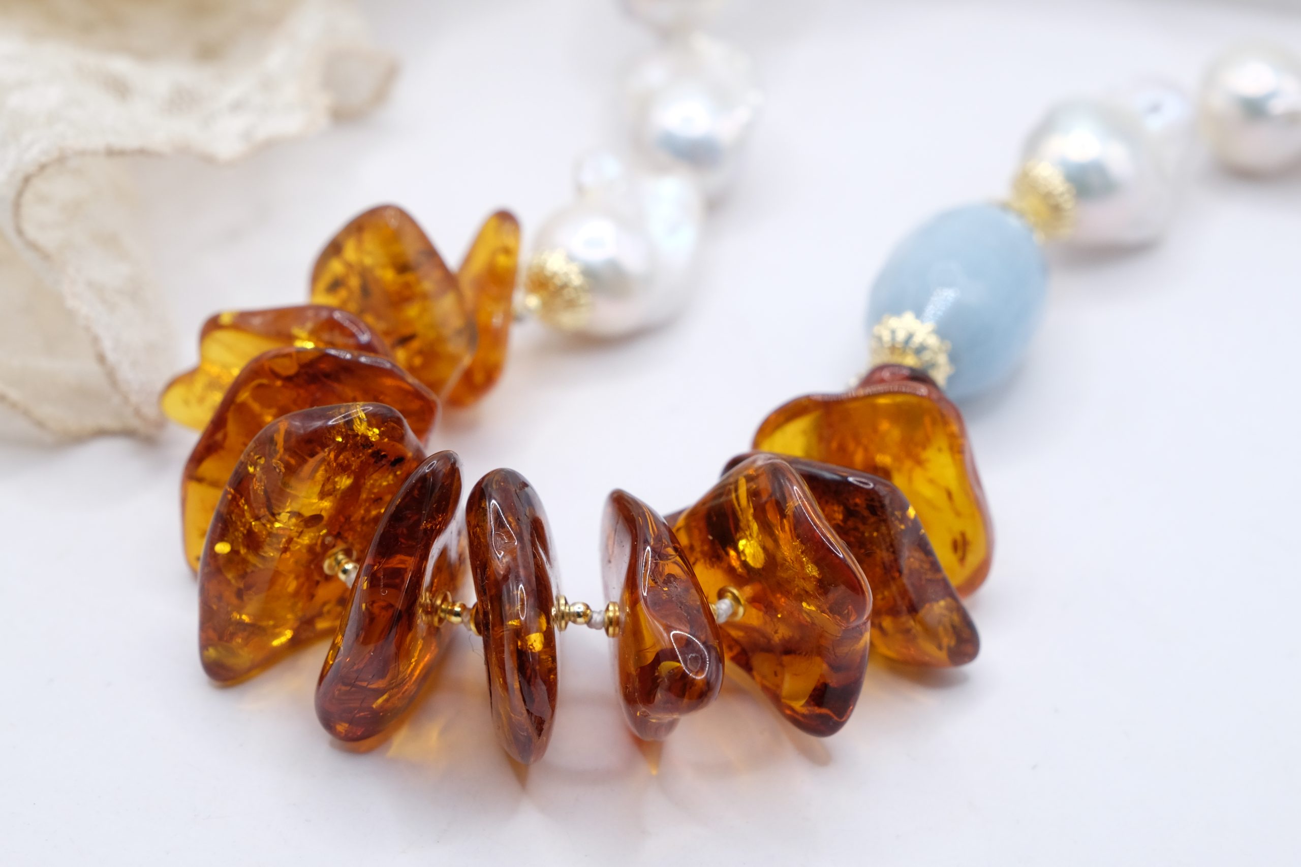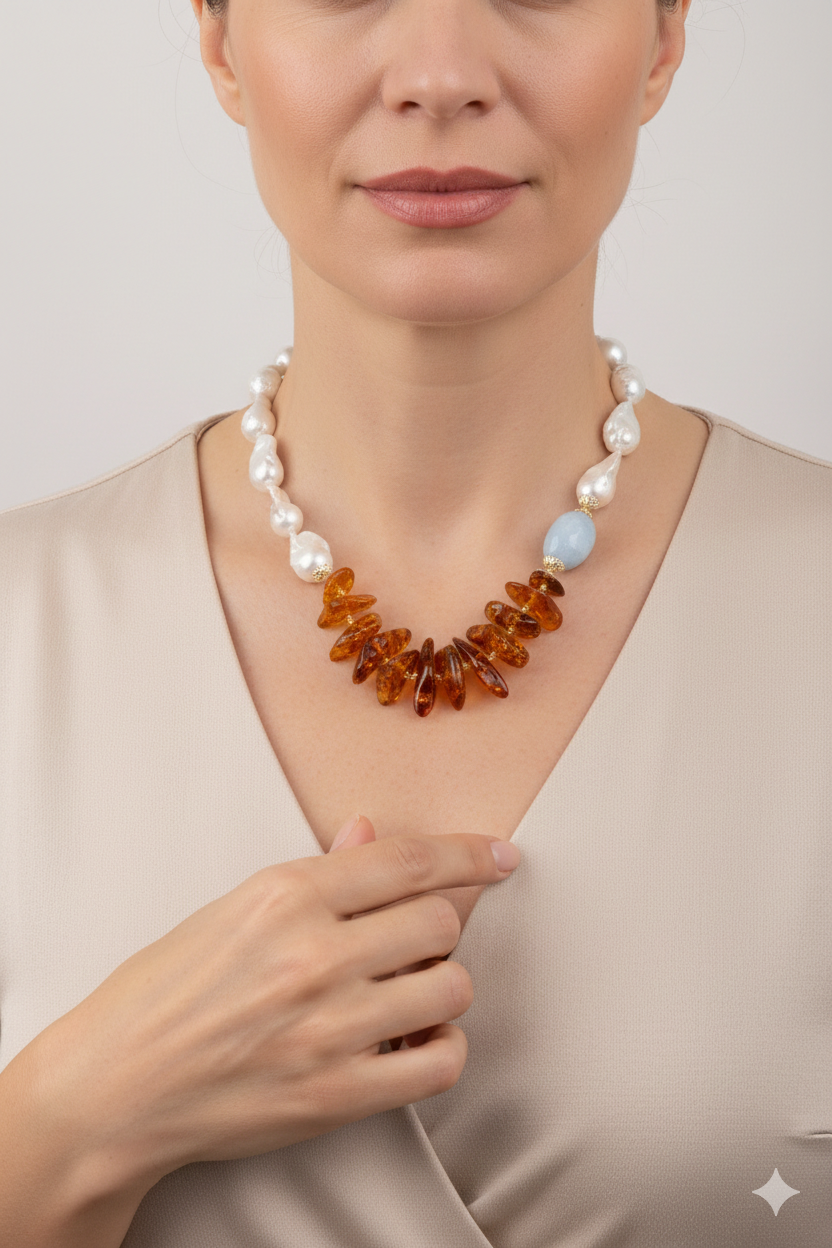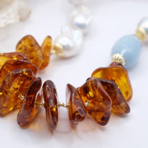 Materiale: Perle Naturali, Ambra del baltico, acquamarina, Argento 925 placcato oro