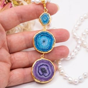 VARIANTE B Agata fetta azzurra e lavanda variegata ciondolo rimovibile collana lunga 64 cm + 9,5 il ciondolo