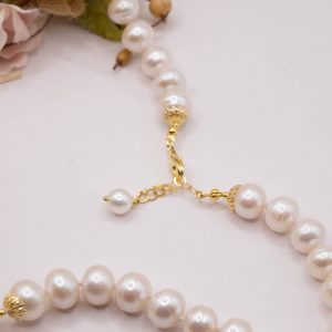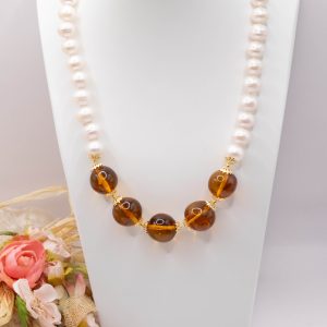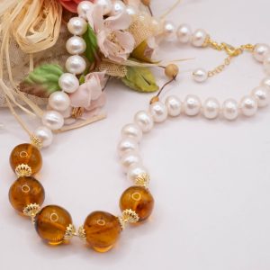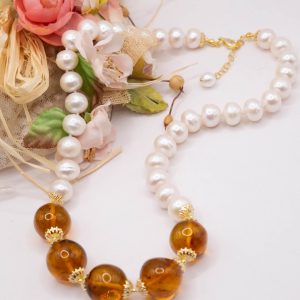 Collana lussuosa dal fascino classico e intamontabile in luminose e grandi perle bianche tondeggianti da 11/12mm e 5 sfere da 16/17 mm in superlativa ambra del baltico. Le finiture sono in argento 925 Placcato oro