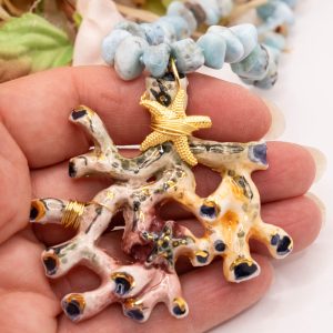 Collana artigianale con un esclusivo ramo di corallo in ceramica di Caltagirone (misura 6,5 x 6 cm) realizzata e dipinta a mano con applicazione di stella marina in ottone.