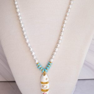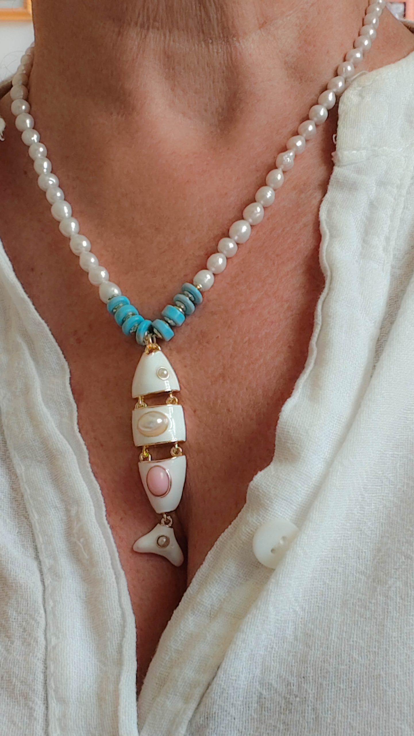 Il girocollo in pregiate perle naturali annodate con filo di seta, che monta al centro delle rondelle di turchese. è lungo 52 cm + il pendente pesce lungo 6,5 cm.