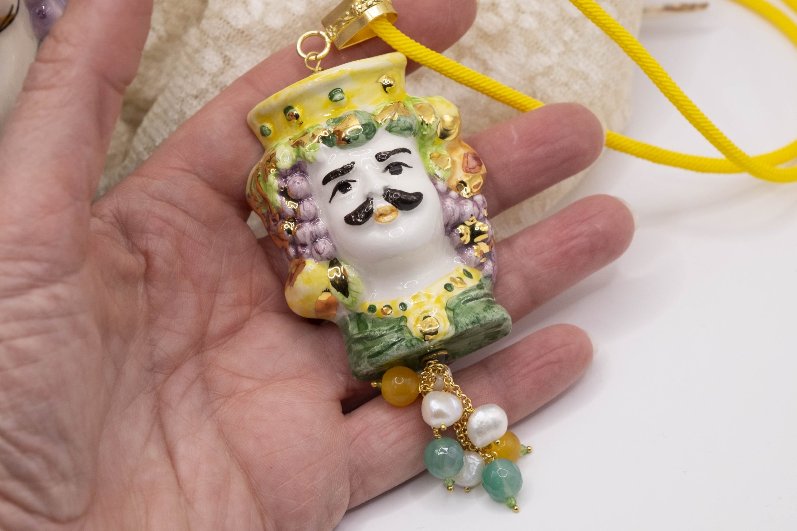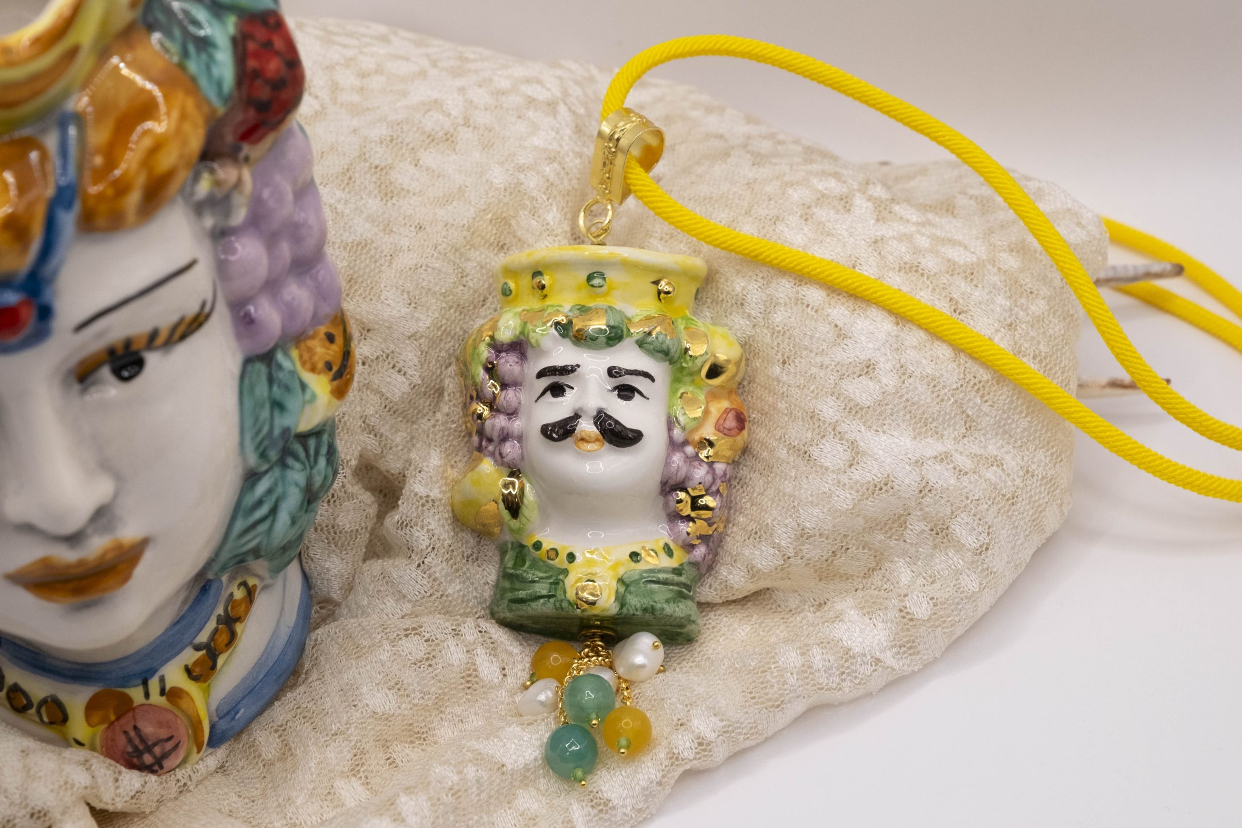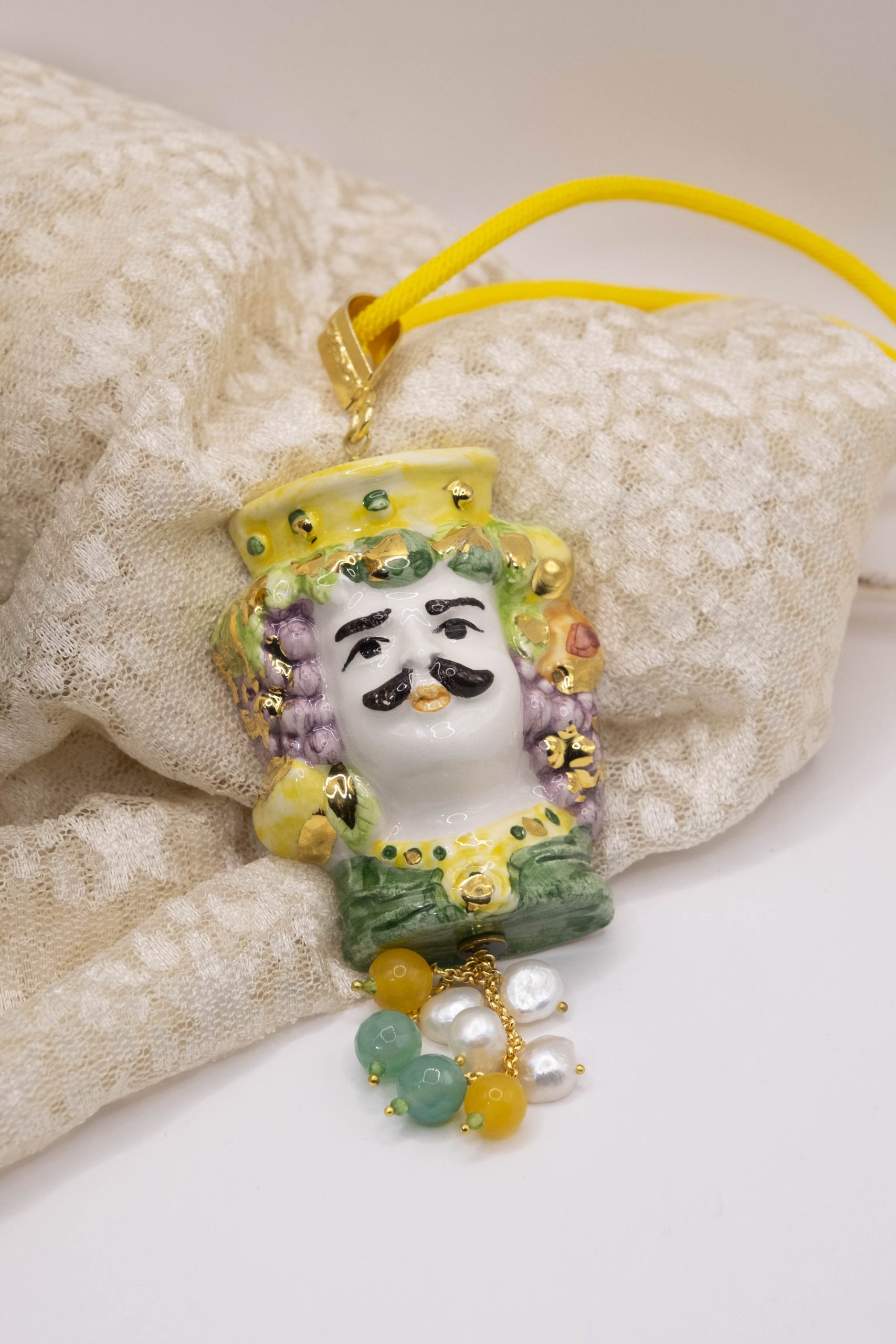 Collana, fatta interamente a mano,con cordino in cotone e Testa di Moro Uomo Top Quality in ceramica di Caltagirone con oro zecchino, da 6 x 4,5 cm, grappolo finale di perle naturali e giada naturale azzurra e gialla