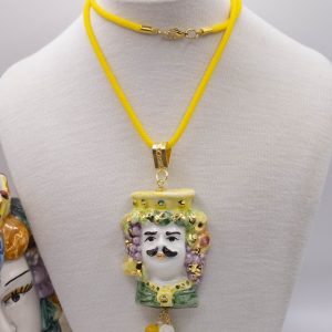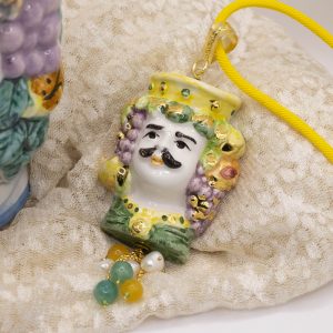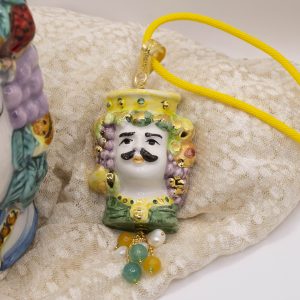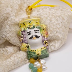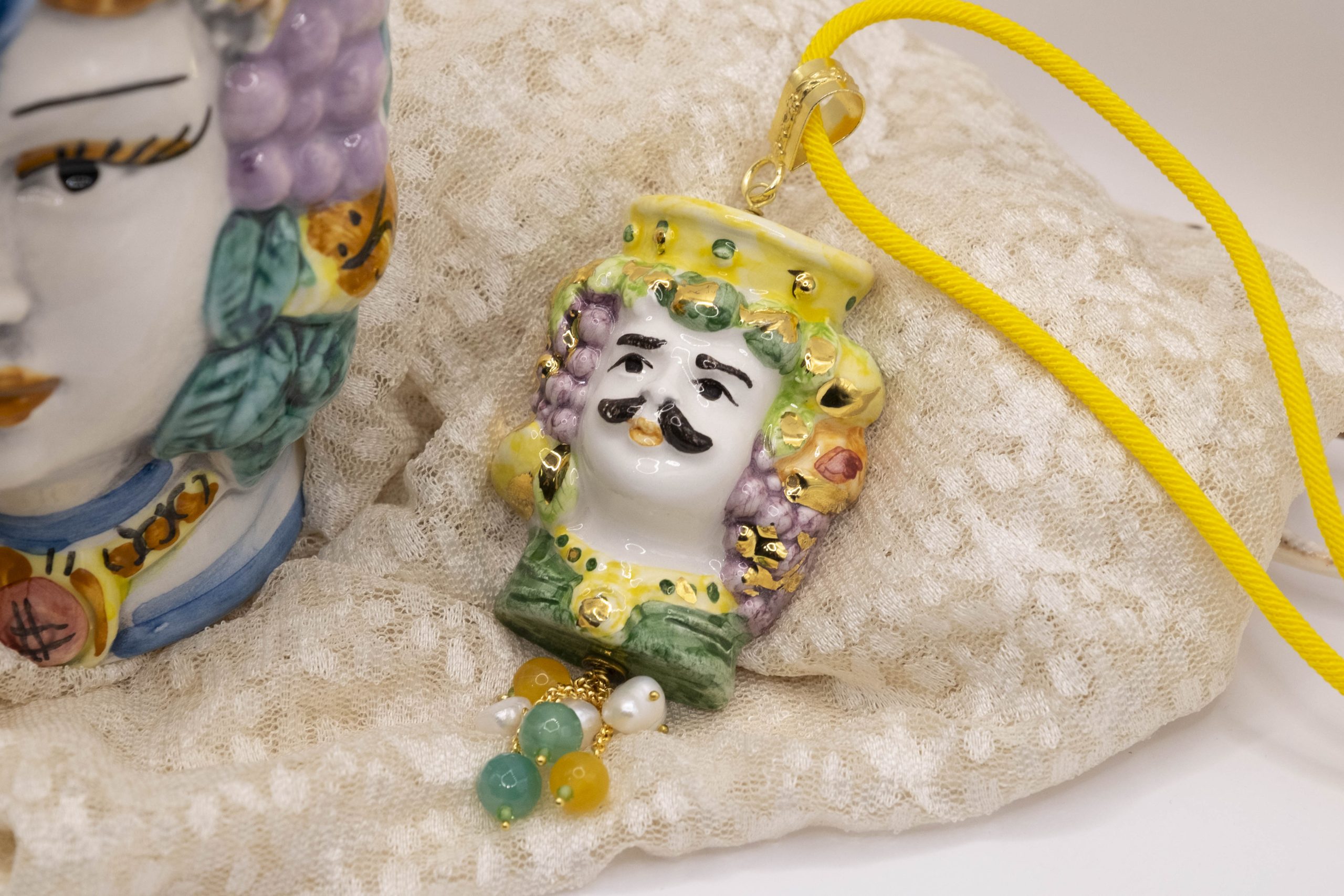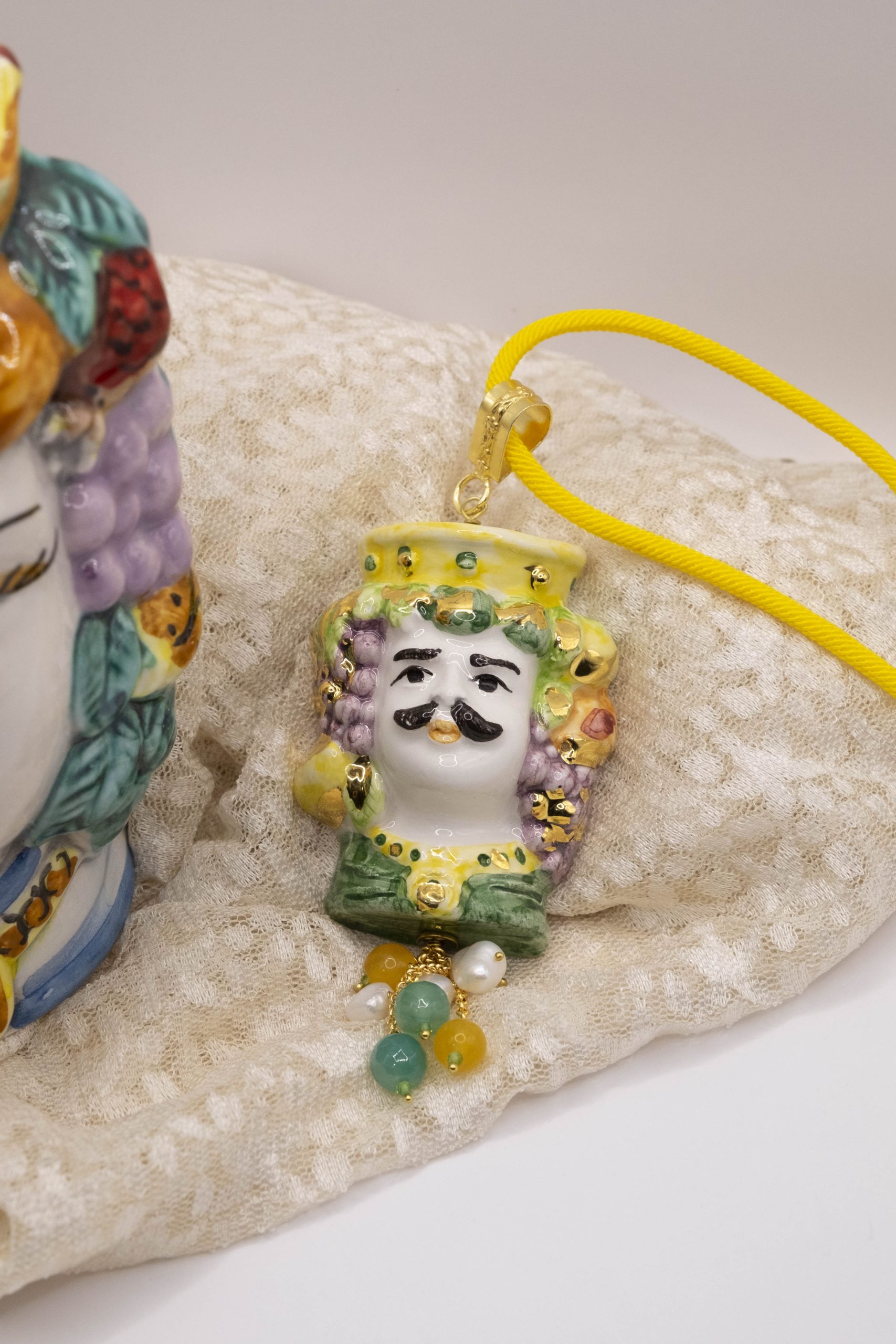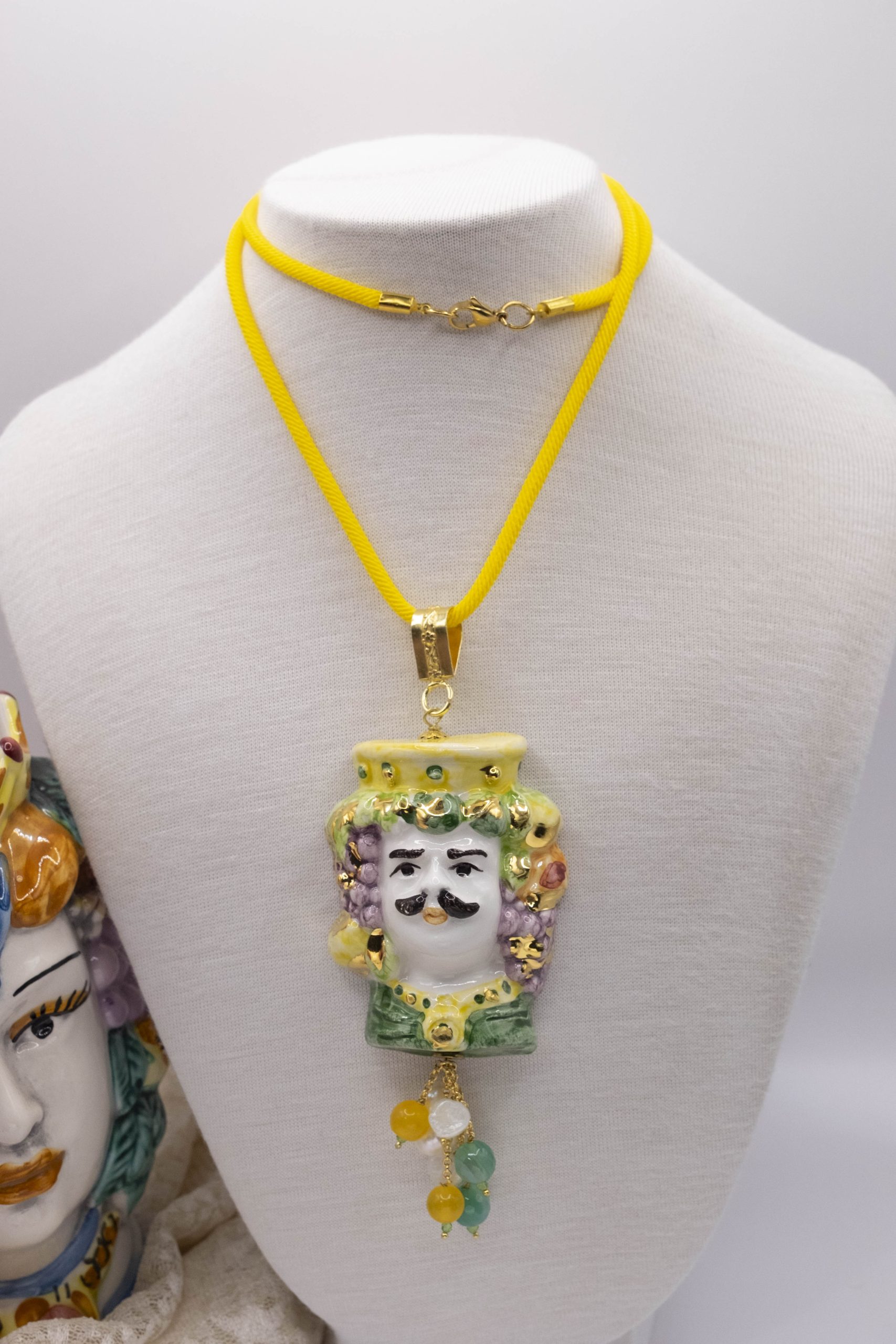 Collana, fatta interamente a mano,con cordino in cotone e Testa di Moro Uomo Top Quality in ceramica di Caltagirone con oro zecchino, da 6 x 4,5 cm, grappolo finale di perle naturali e giada naturale azzurra e gialla