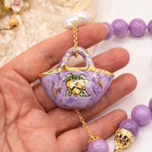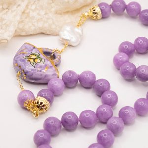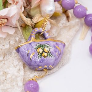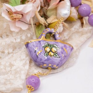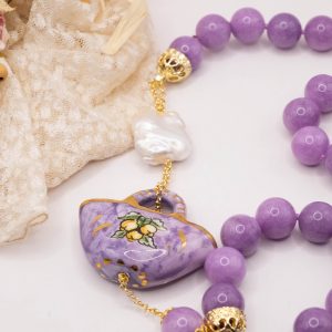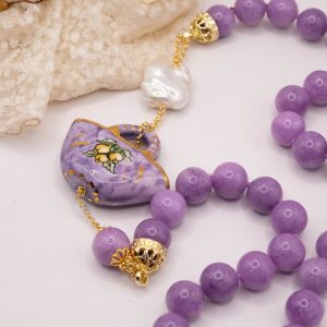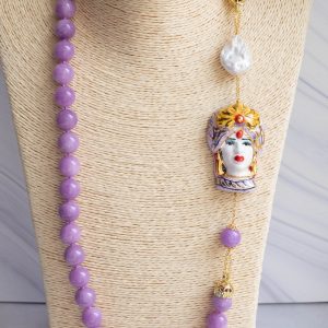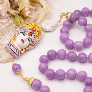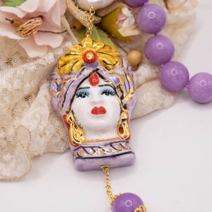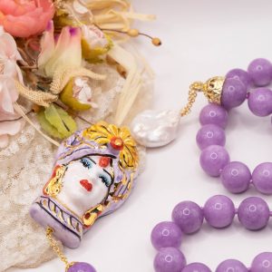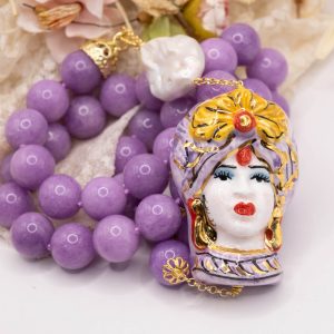 Collana magnifica, in kunzite lilla da 15mm di alta qualità, testa di moro donna in ceramica di Caltagirone da 6 x 4 cm o coffa siciliana coi limoni da 5,2 x 4 cm, realizzate e decorate a mano con oro zecchino e perle piatte naturali.