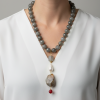 La collana è lunga 50 cm e la chiusura è in acciaio, Il ciondolo staccabile misura 6,5 x 10 cm