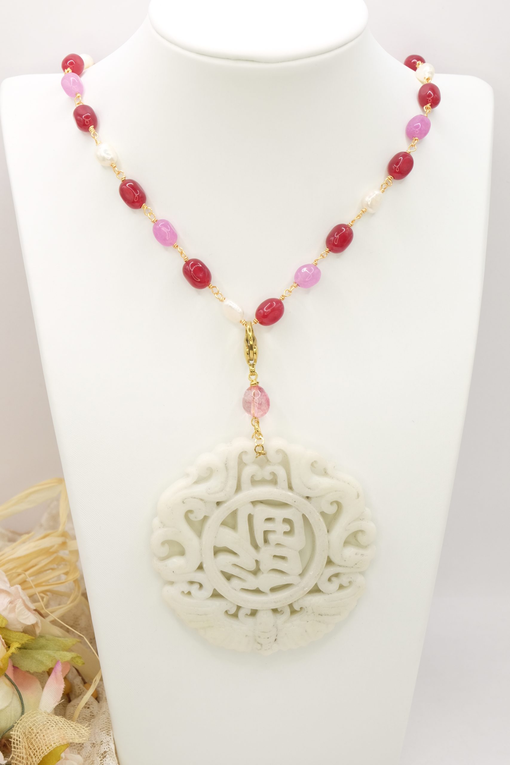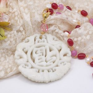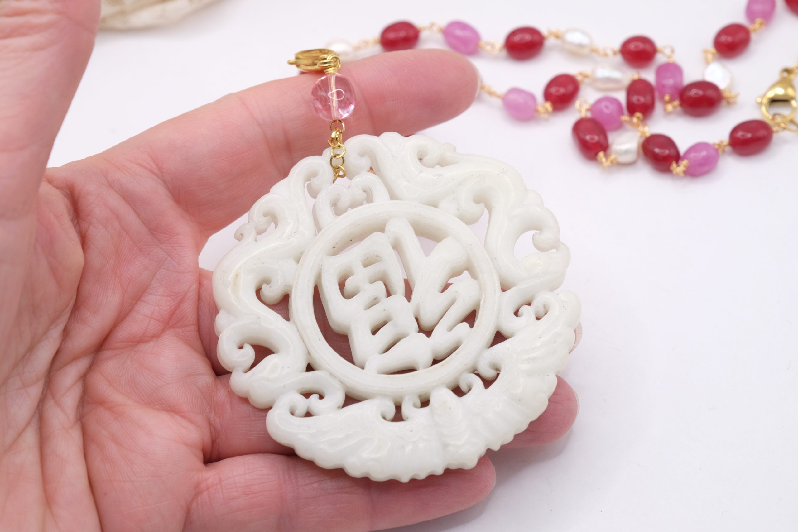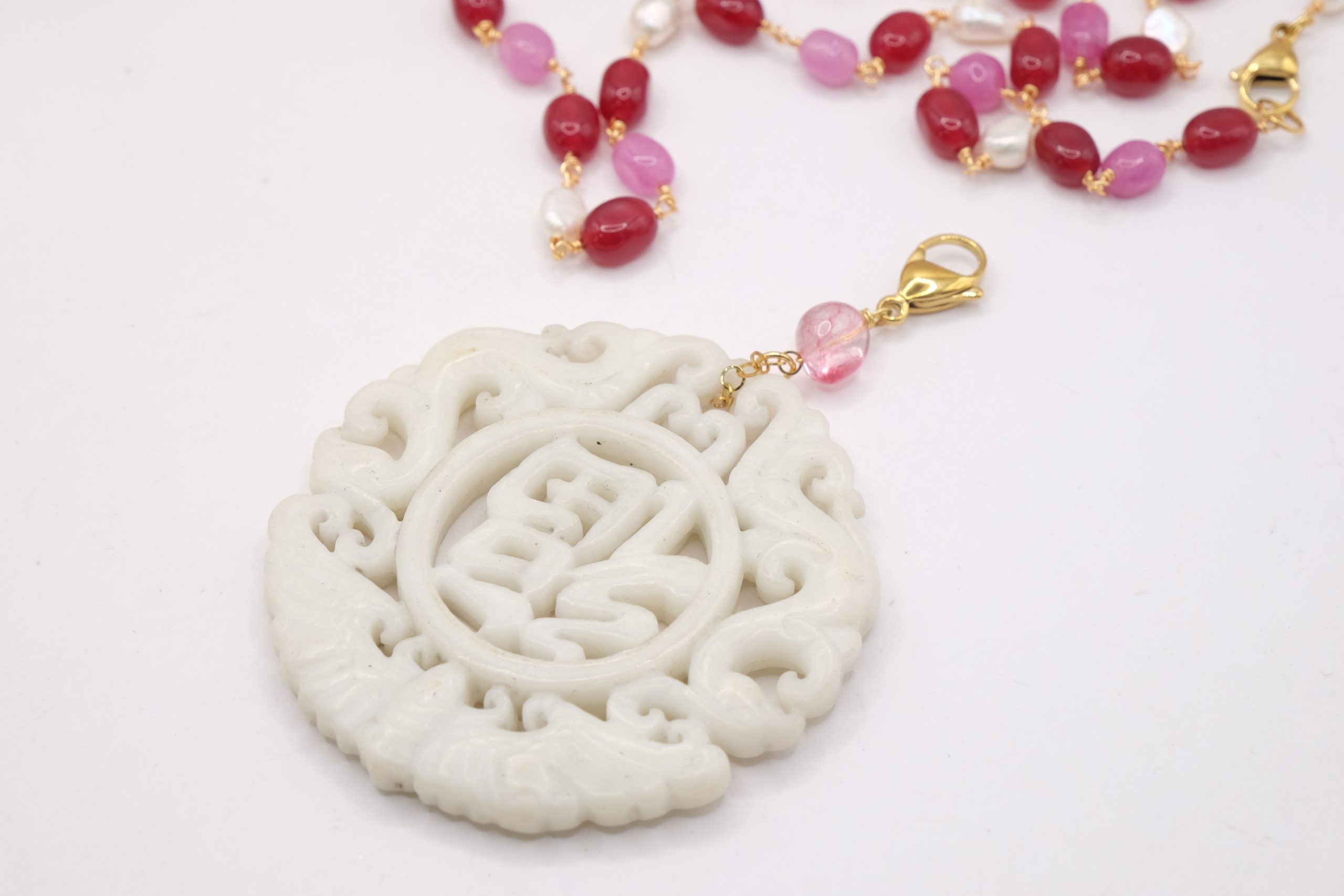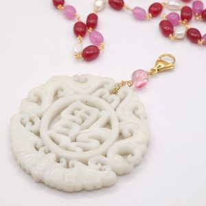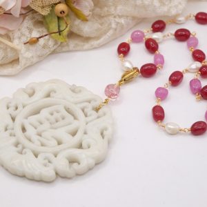 Collana a rosario di tormaline rosa e perle naturali con ciondolo mandala staccabile in giada bianca intarsiata a mano con tormalina rosa sulla sommità