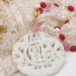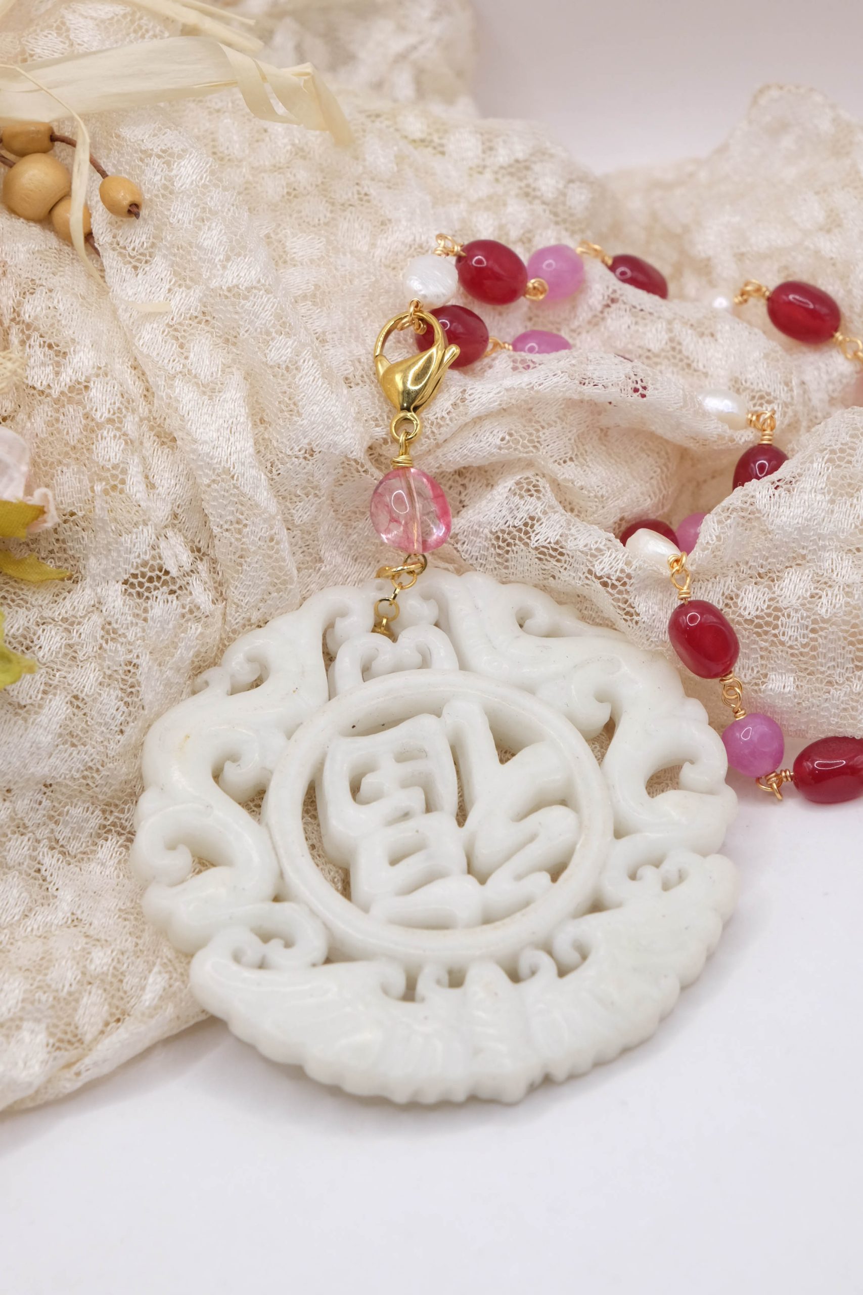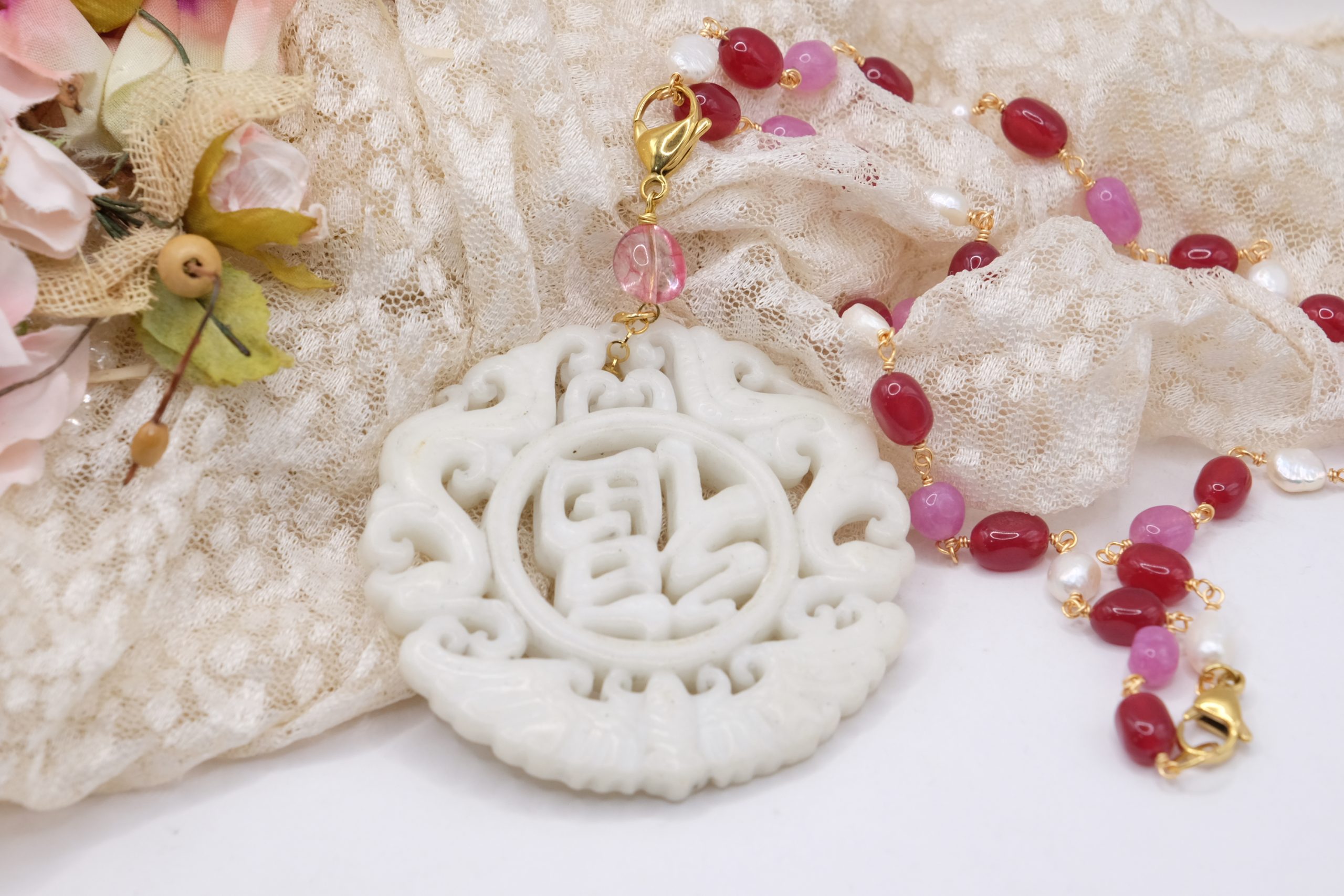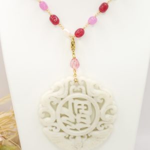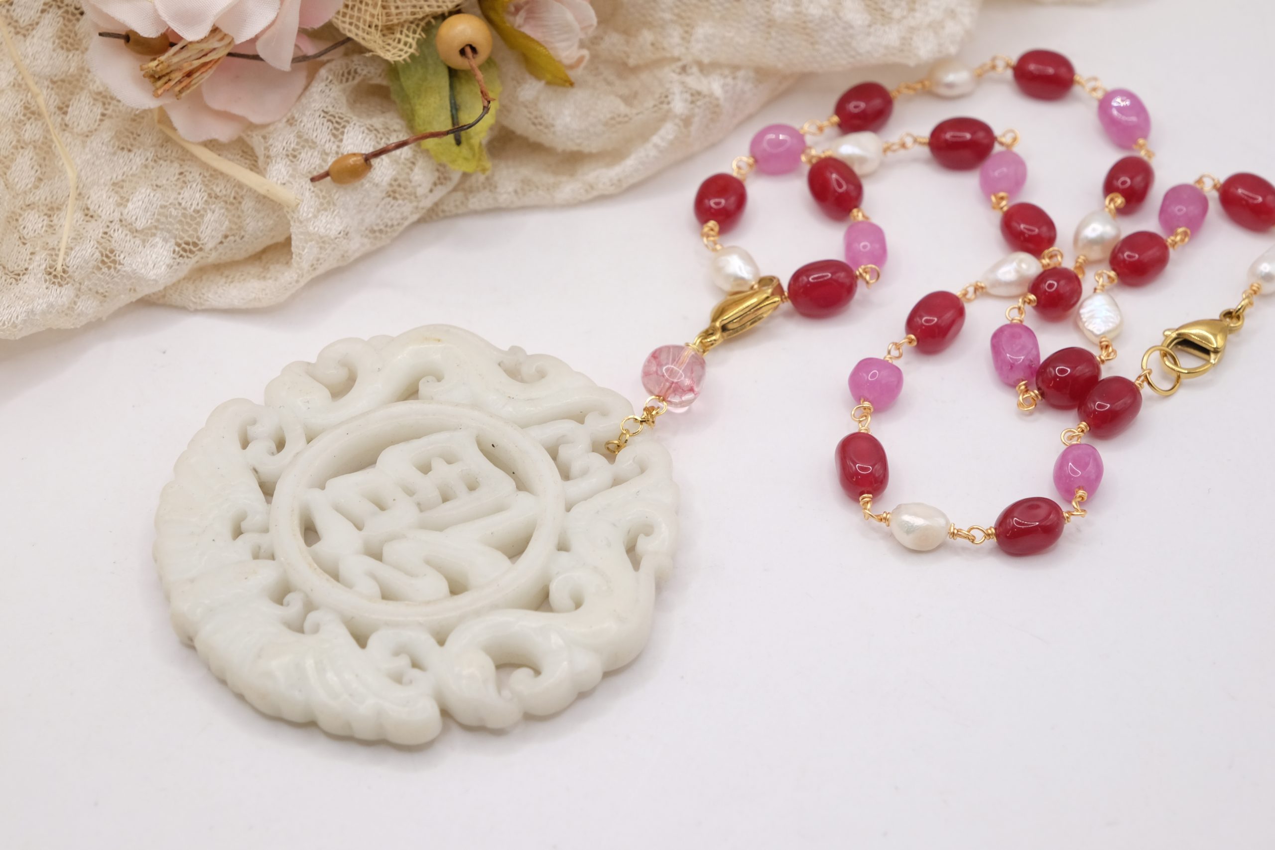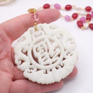 Collana a rosario di tormaline rosa e perle naturali con ciondolo mandala staccabile in giada bianca intarsiata a mano con tormalina rosa sulla sommità