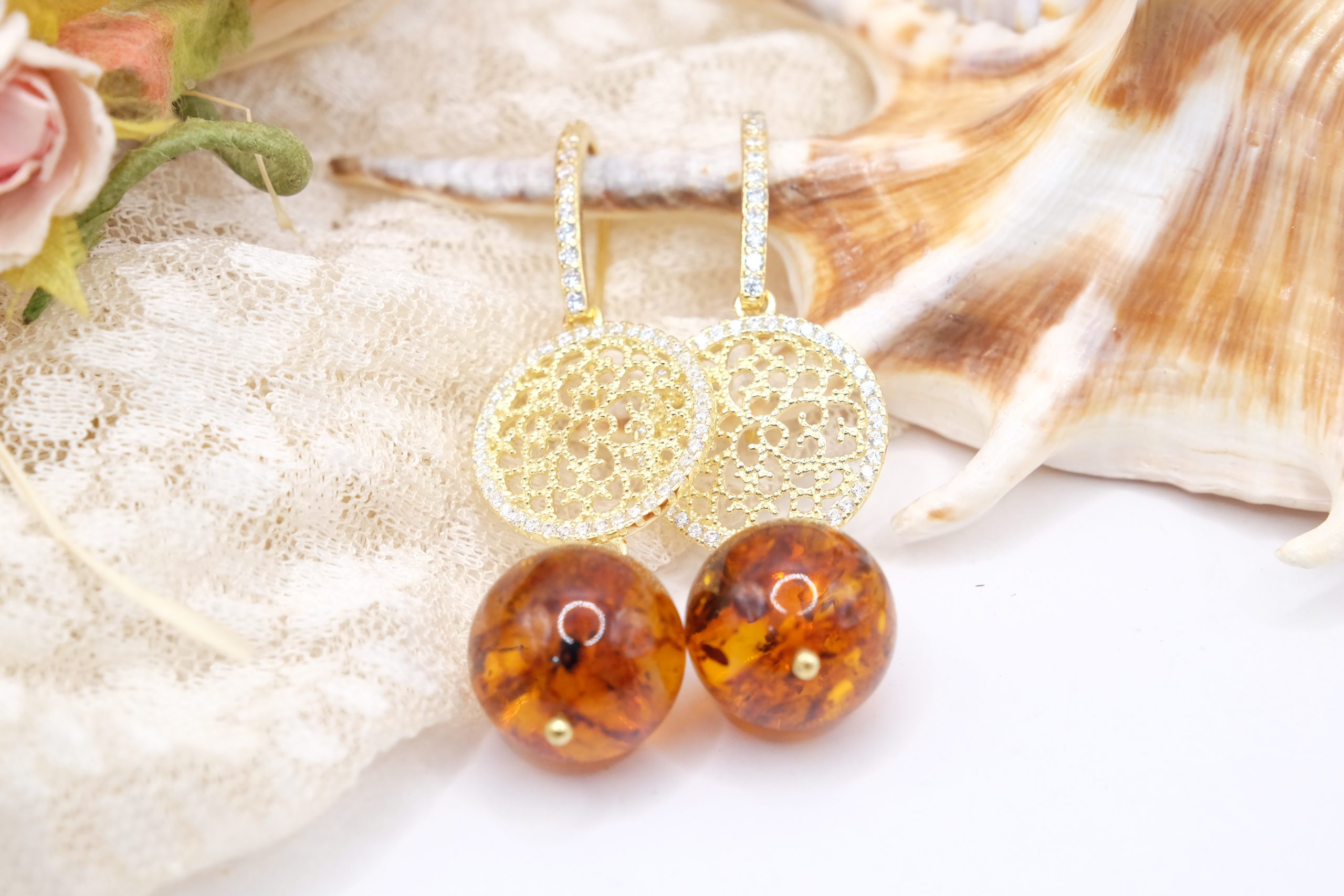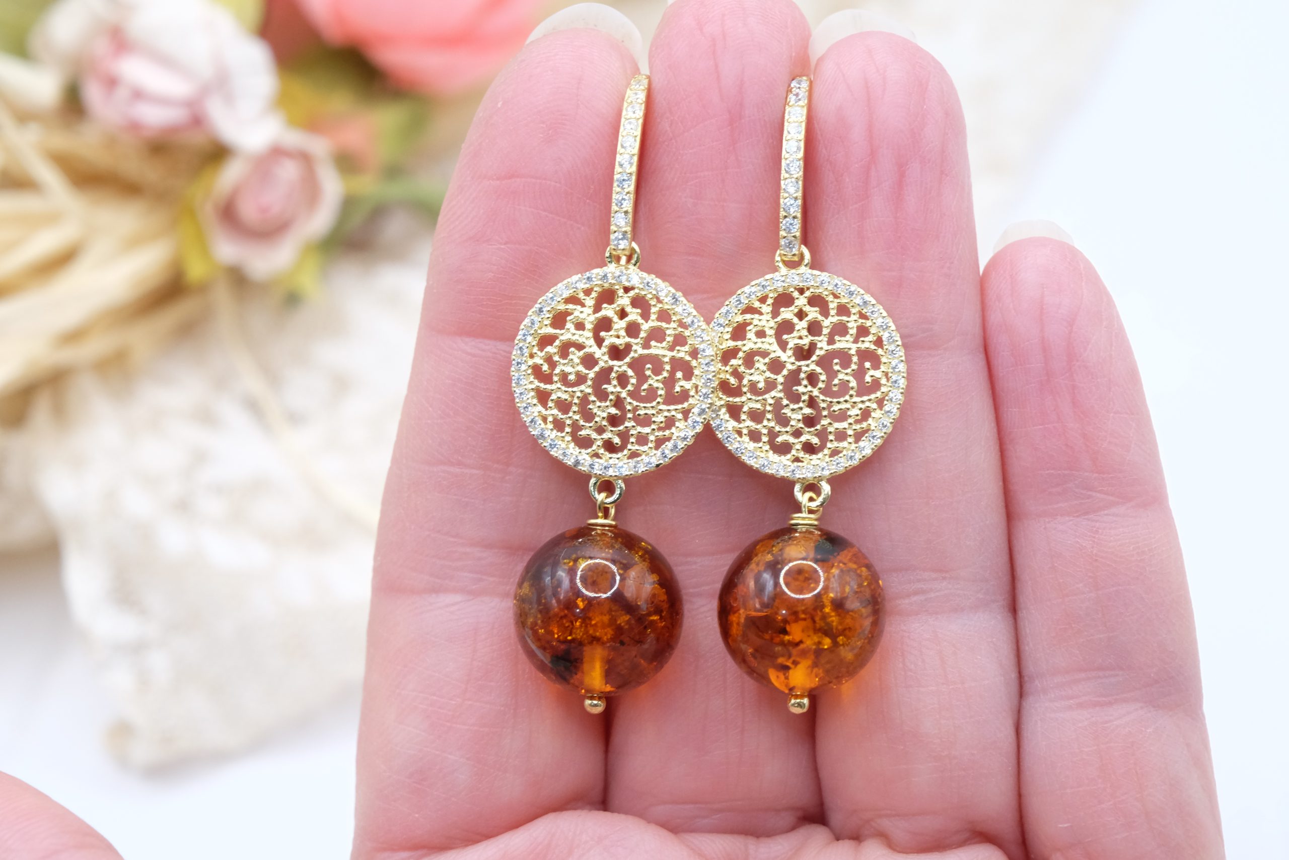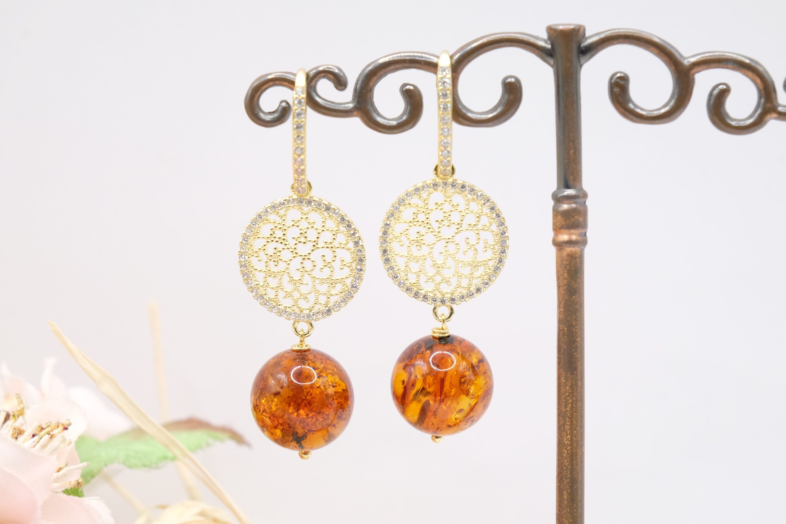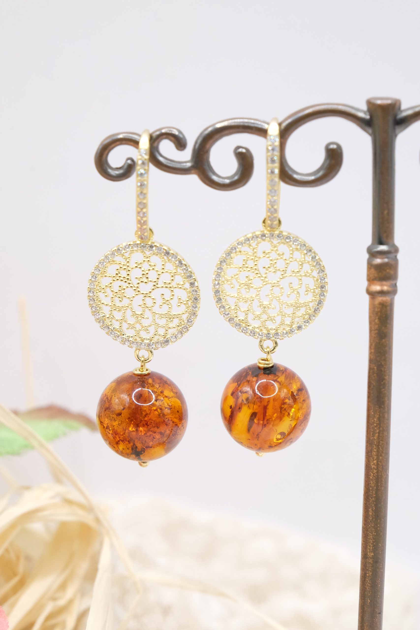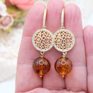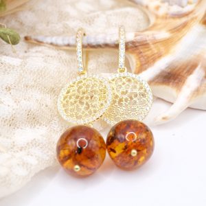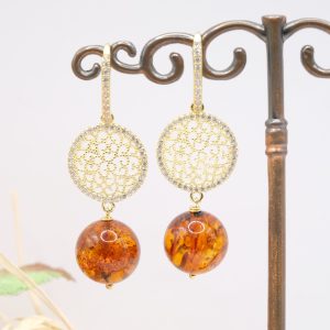Orecchini Ambra Naturale Argento 925 Zirconi Gold