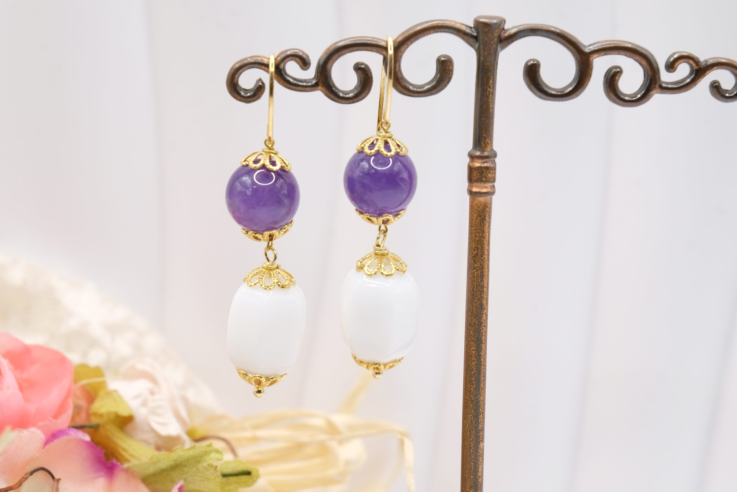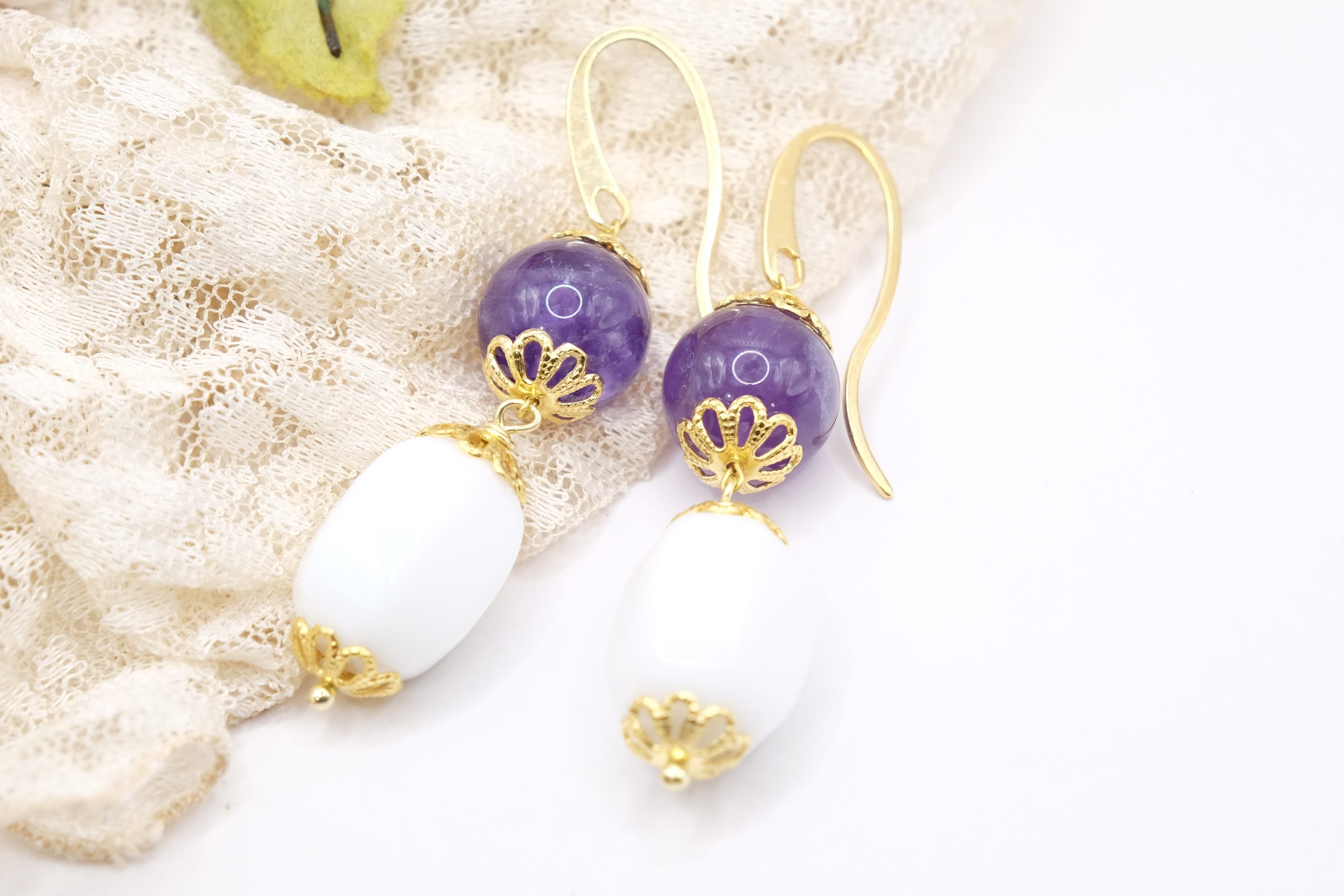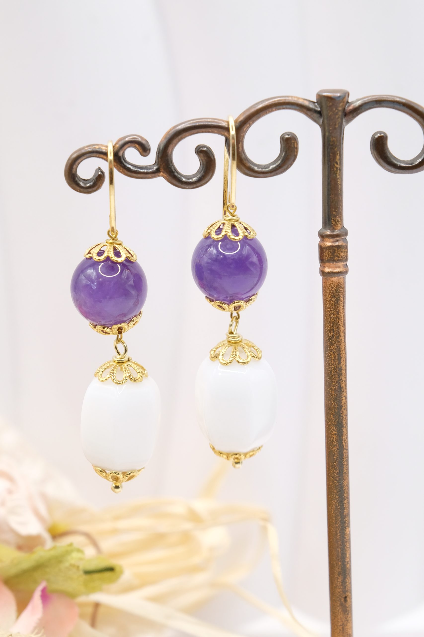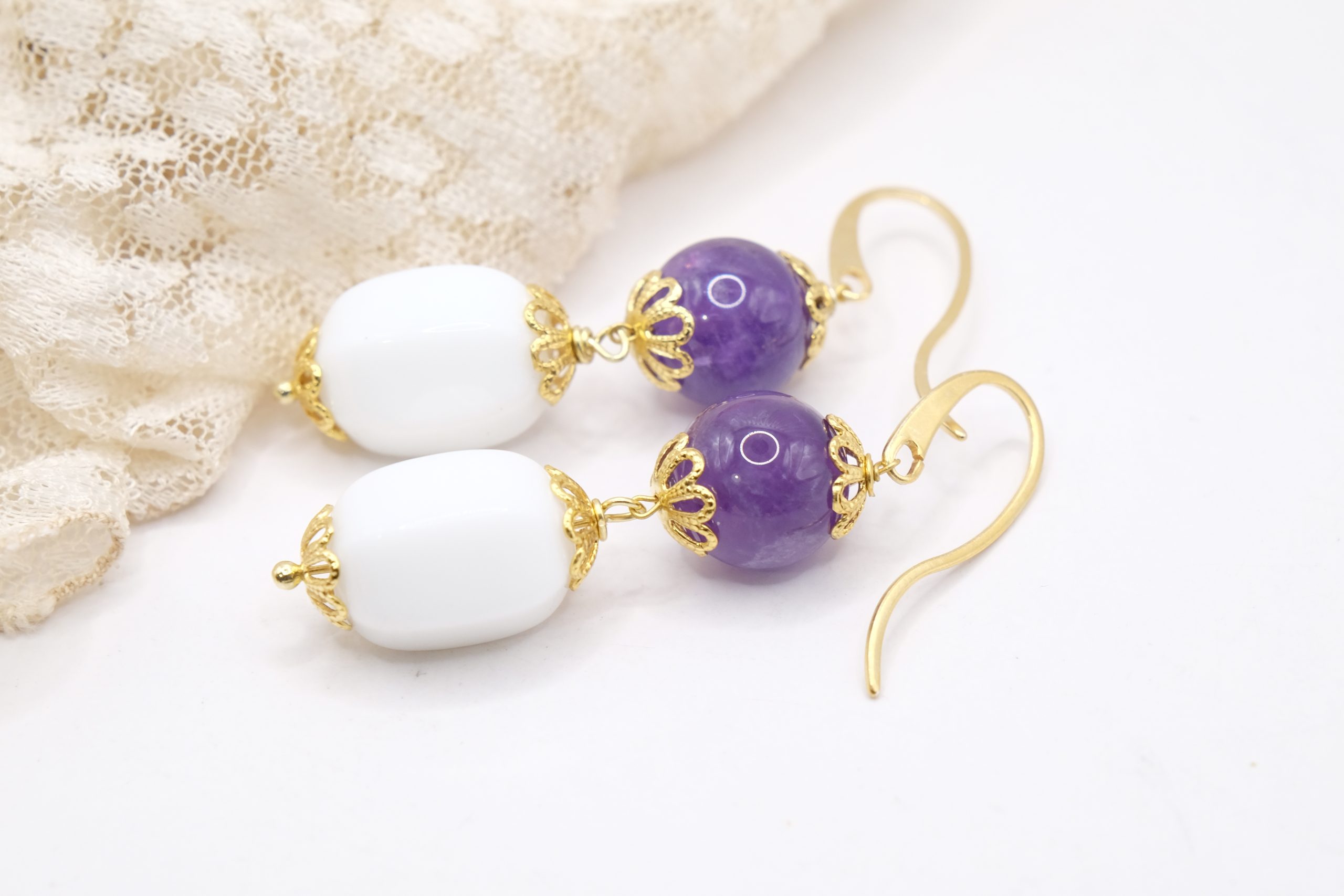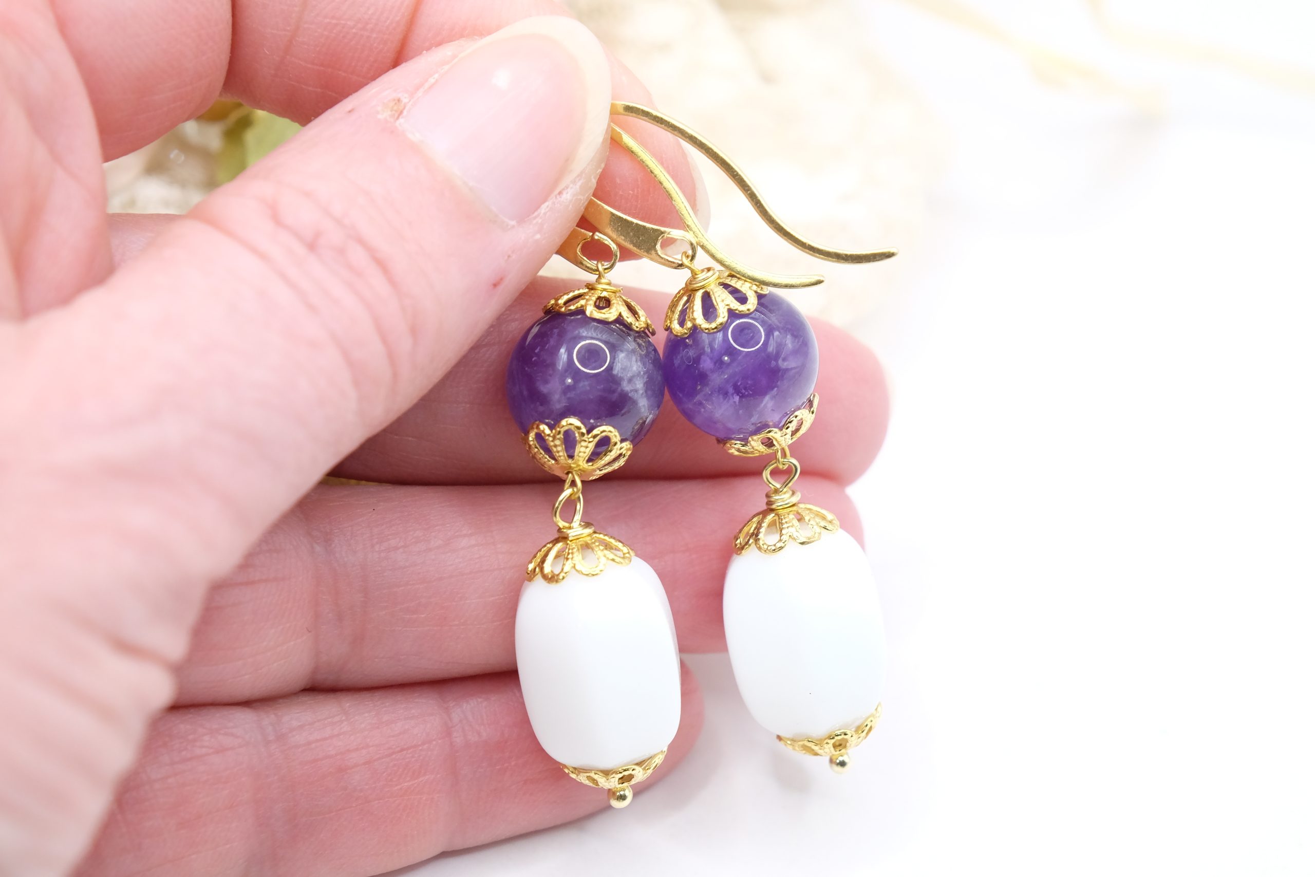 Il barilotto in agata bianca crea un raffinato contrasto con l’ametista, mentre la montatura a gancio in argento 925 placcato oro aggiunge un tocco caldo e prezioso 💛
