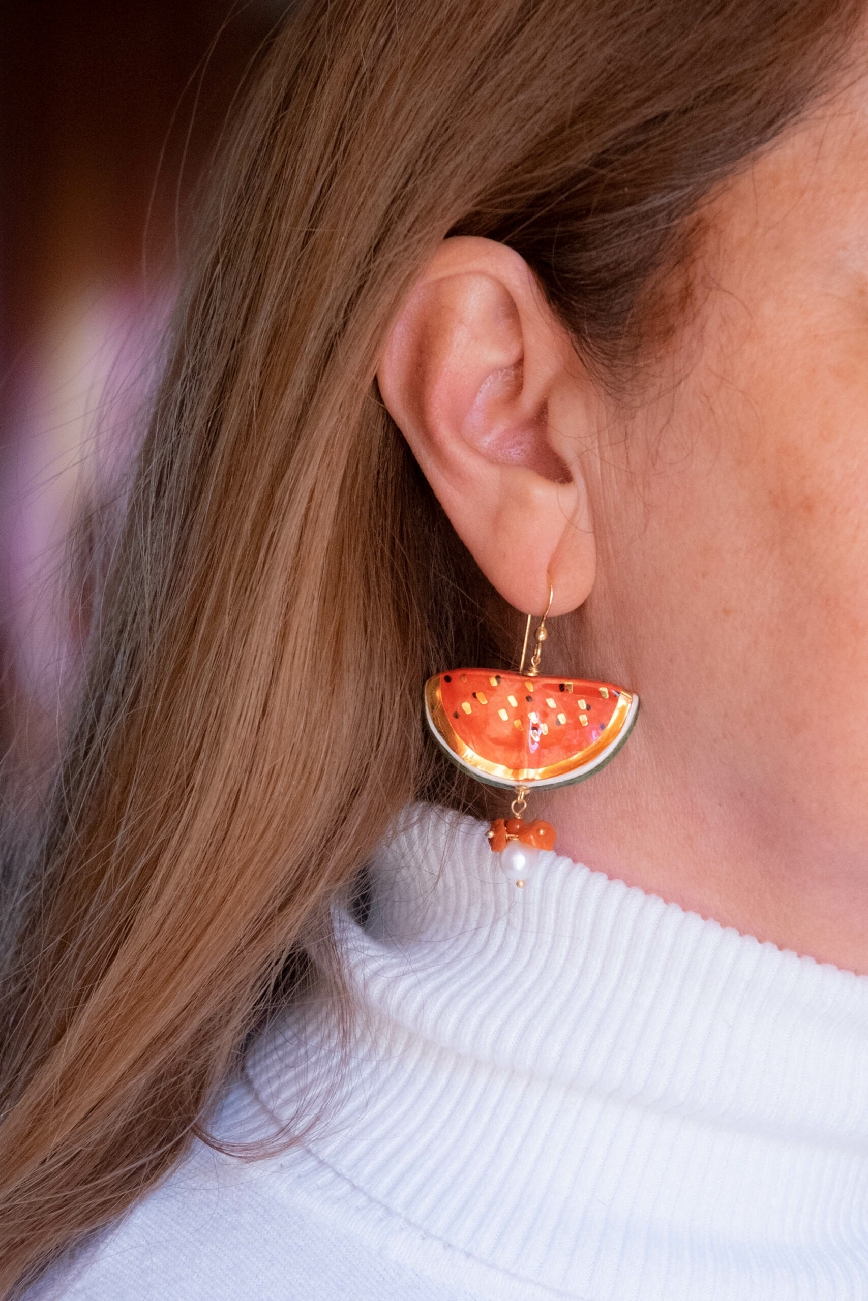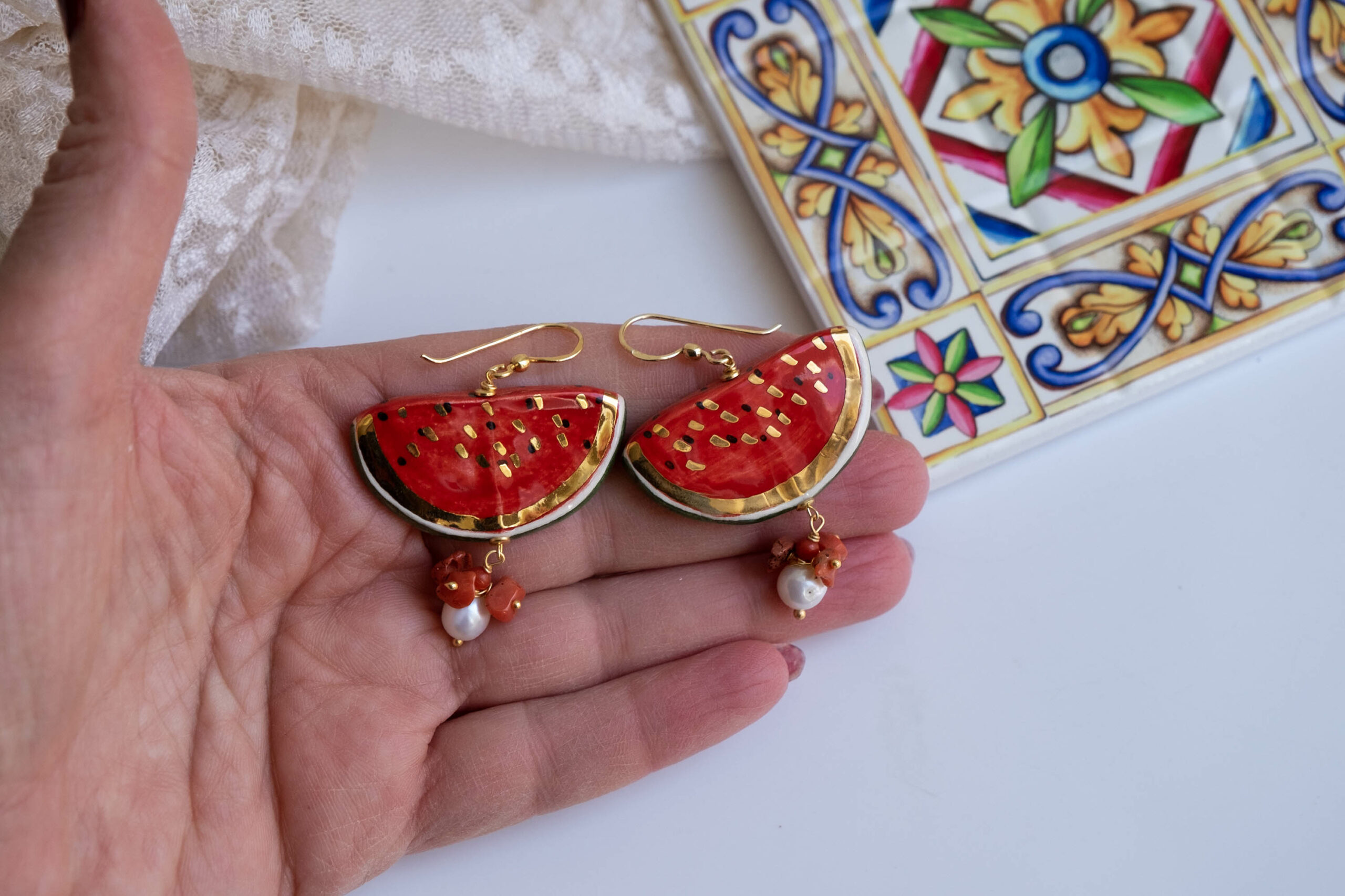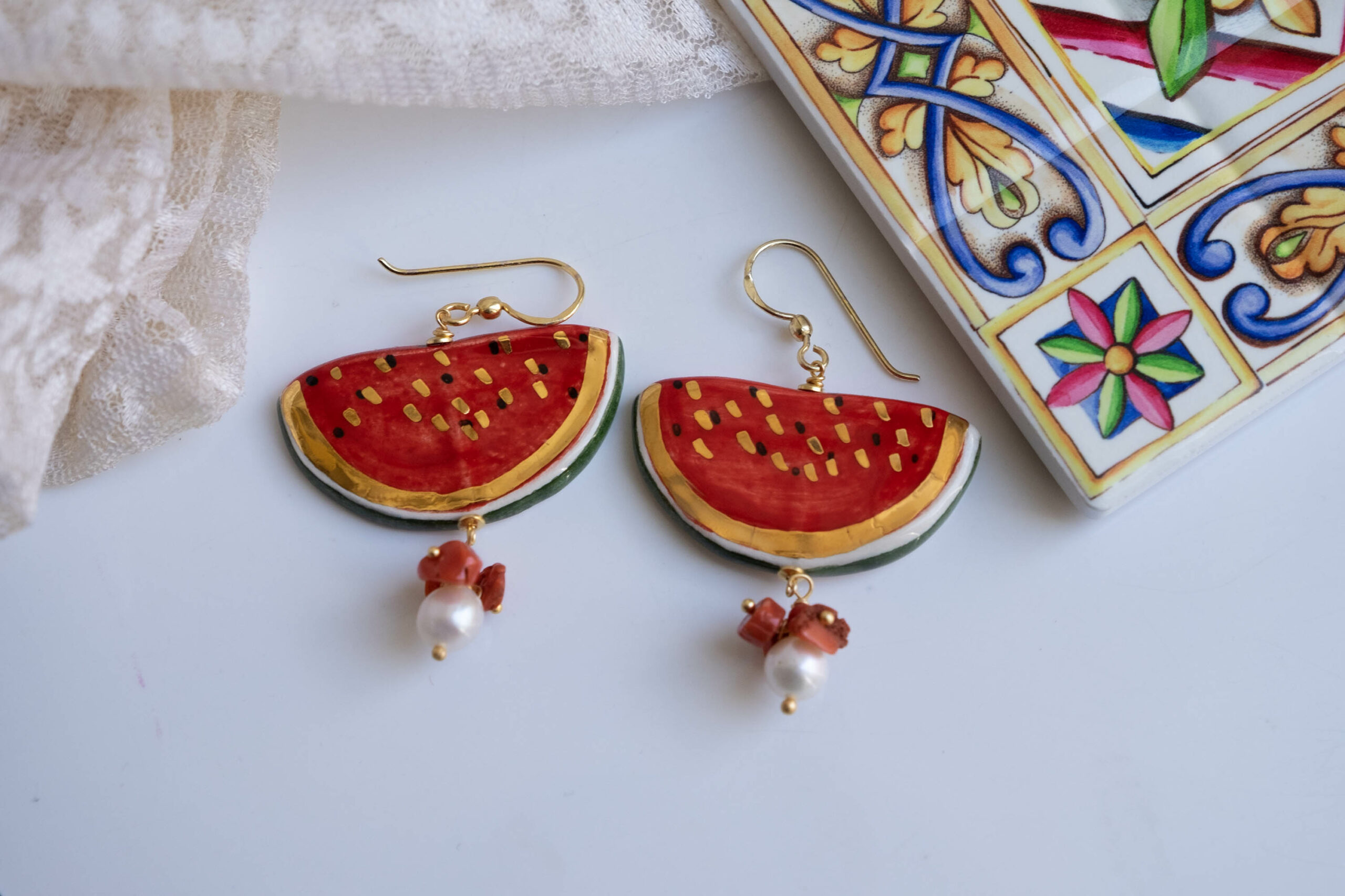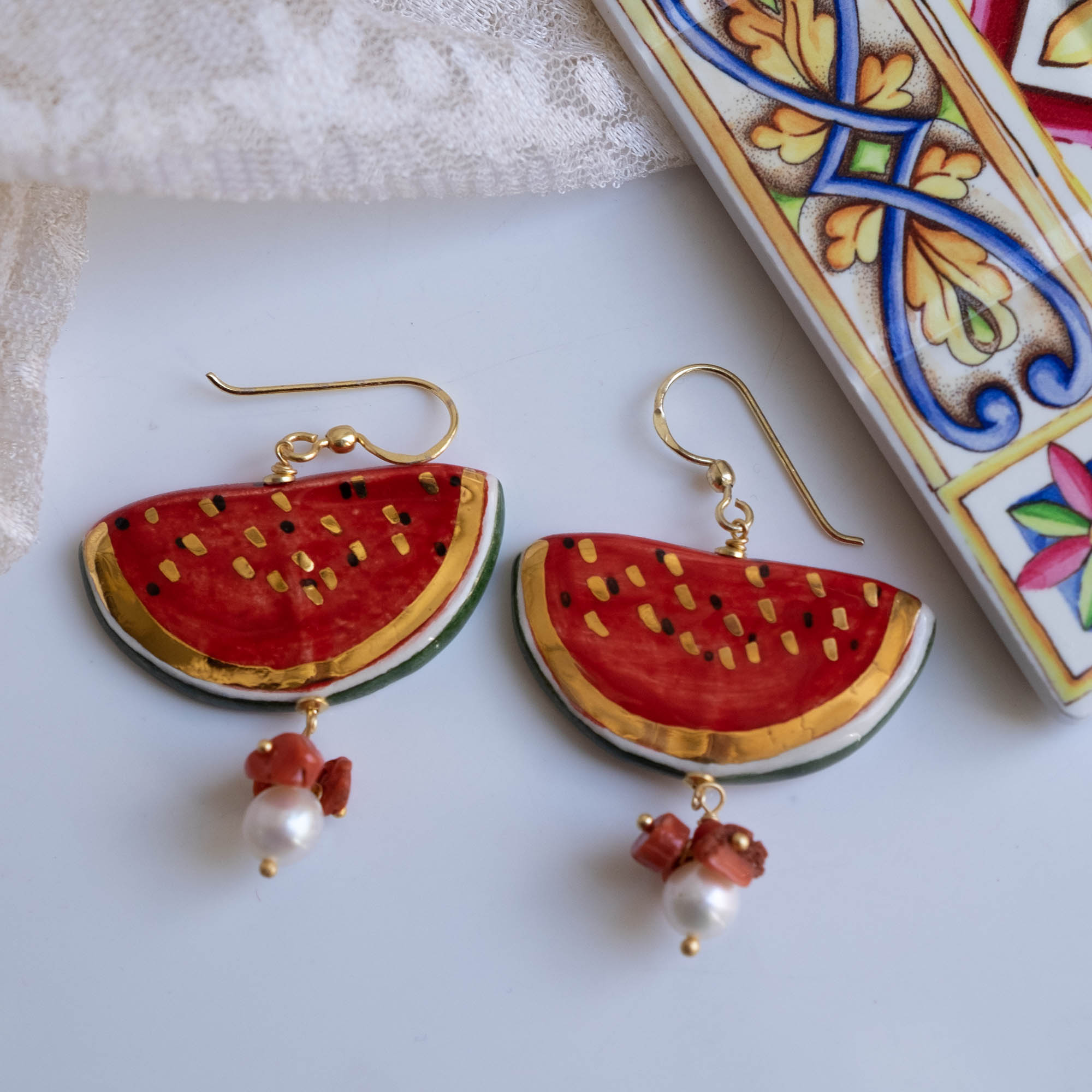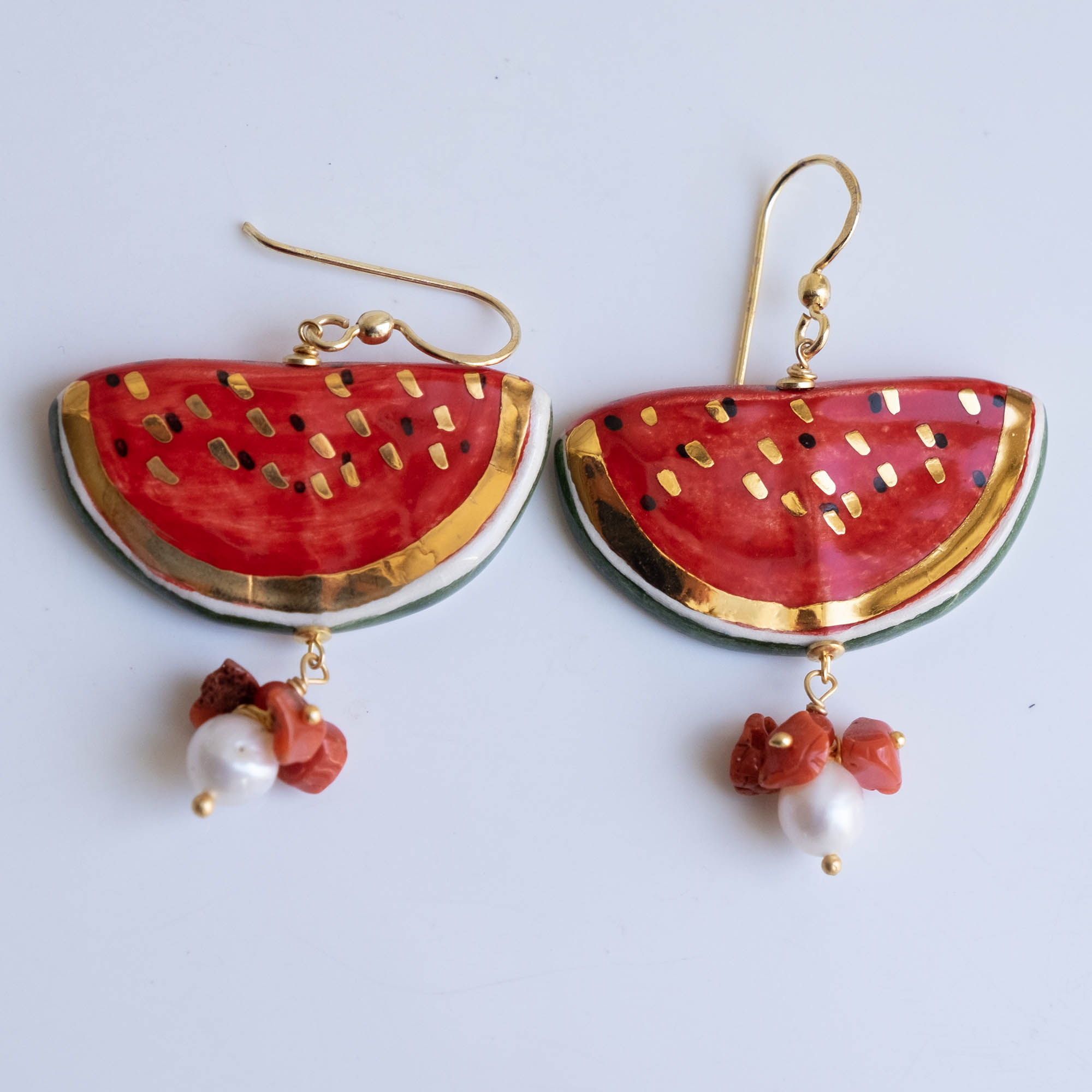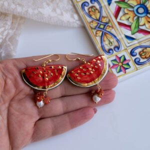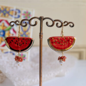 Orecchini pendenti con fette di anguria da 4 x 2 cm, realizzati e decorati a mano in ceramica di Caltagirone con foglia d’oro a 22 kt, perla bianca naturale e corallo rosso naturale.