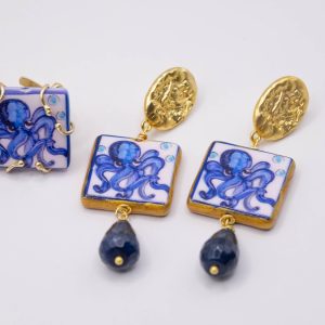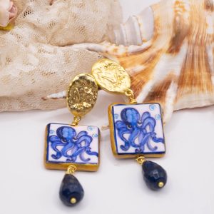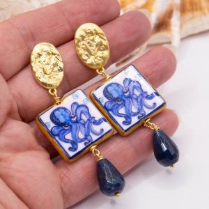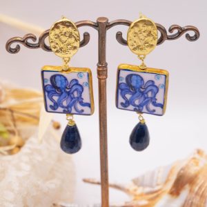 Orecchini pendenti con mattonelle, realizzate e decorate a mano in ceramica artistica di Caltagirone, con motivo di polpo e goccia di giada blu sfaccettata