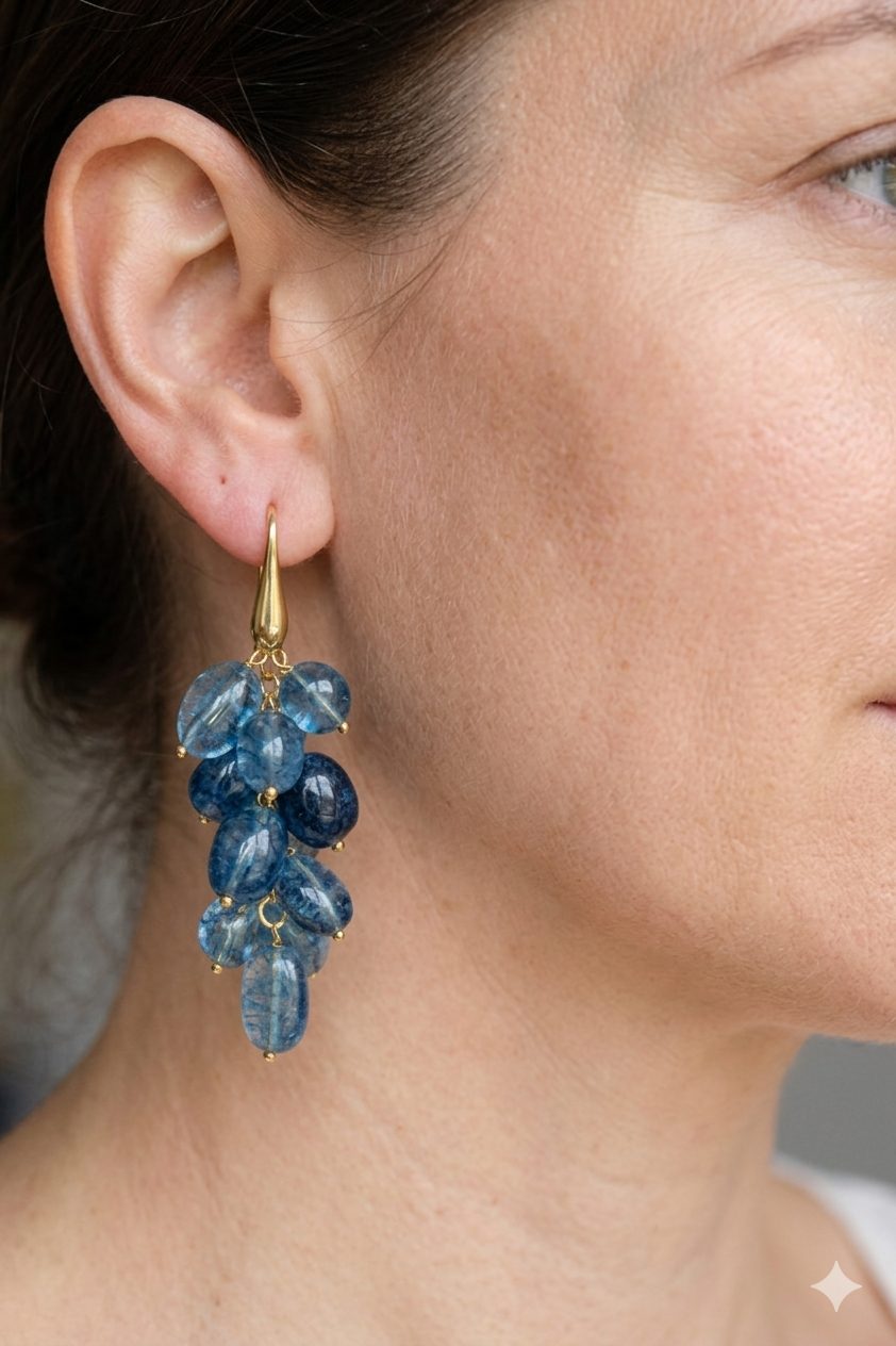 Realizzati a mano con tormaline naturali dai delicati toni azzurro blu, che insieme creano un elegante effetto a grappolo, ricco di luce e movimento. La monachina in argento 925 placcato oro aggiunge un tocco raffinato e li rende perfetti da indossare ogni giorno o nelle occasioni speciali ✨