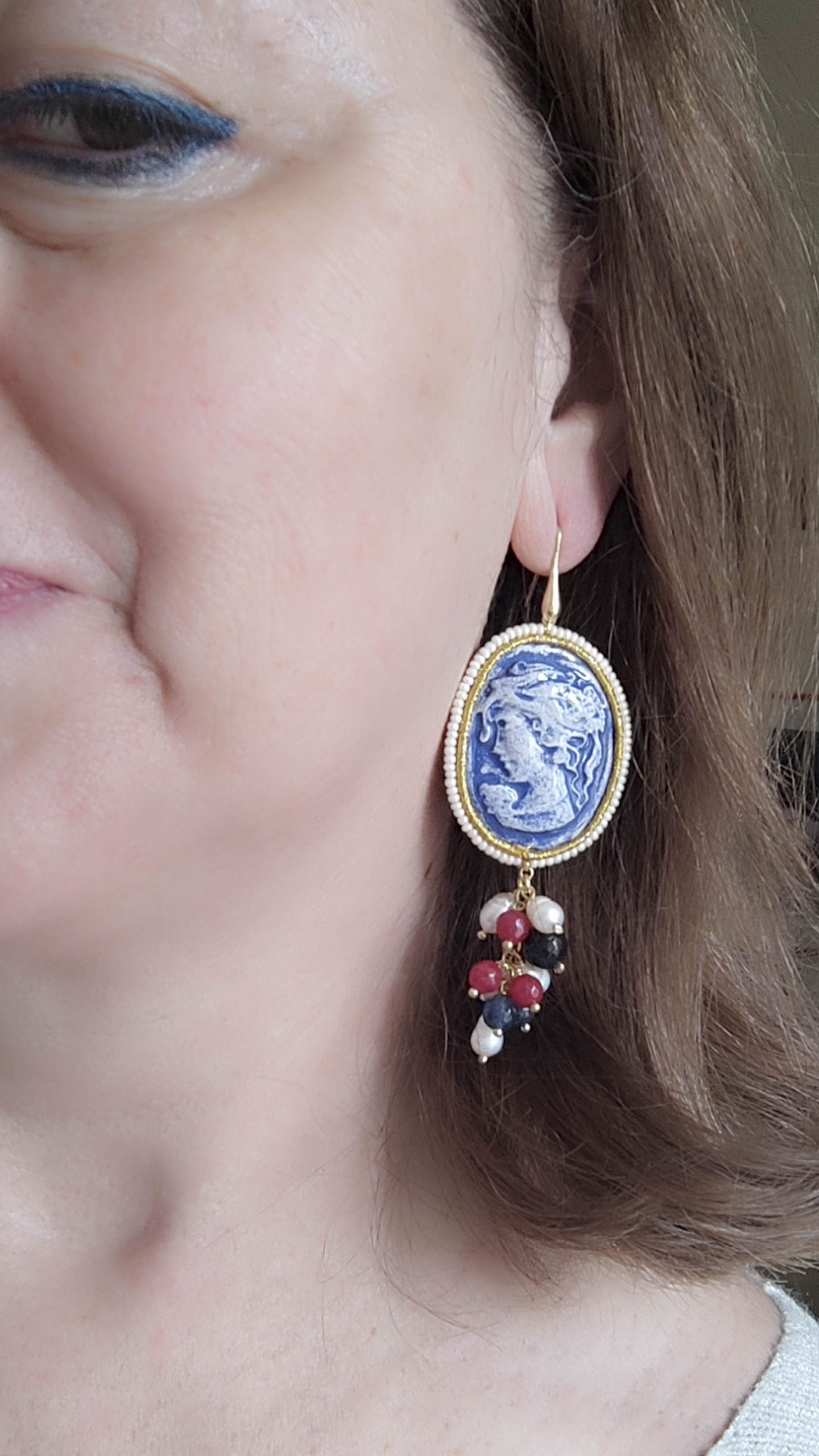 Orecchini magnifici, con cammei in ceramica, realizzati dai maestri ceramisti di Caltagirone, con cornice in zirconi naturali e passamaneria oro a lavorazione satuoire.