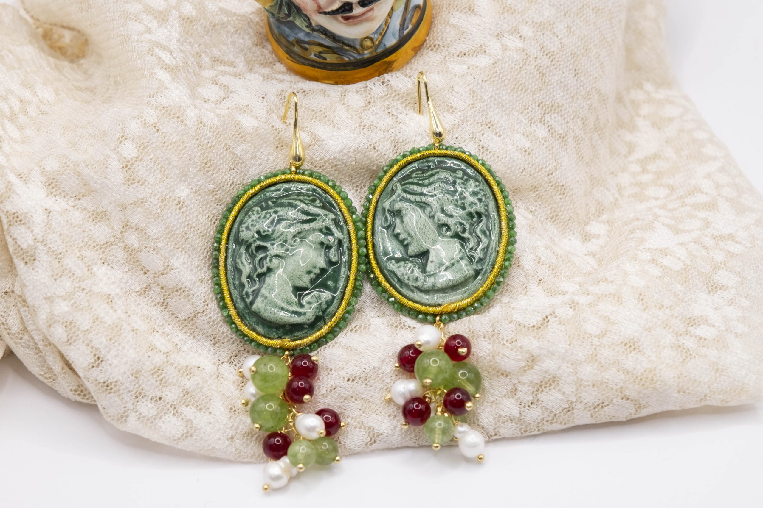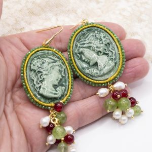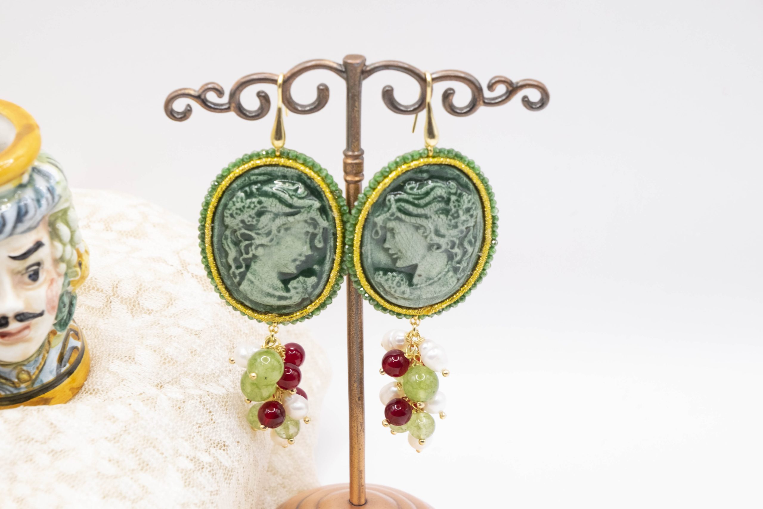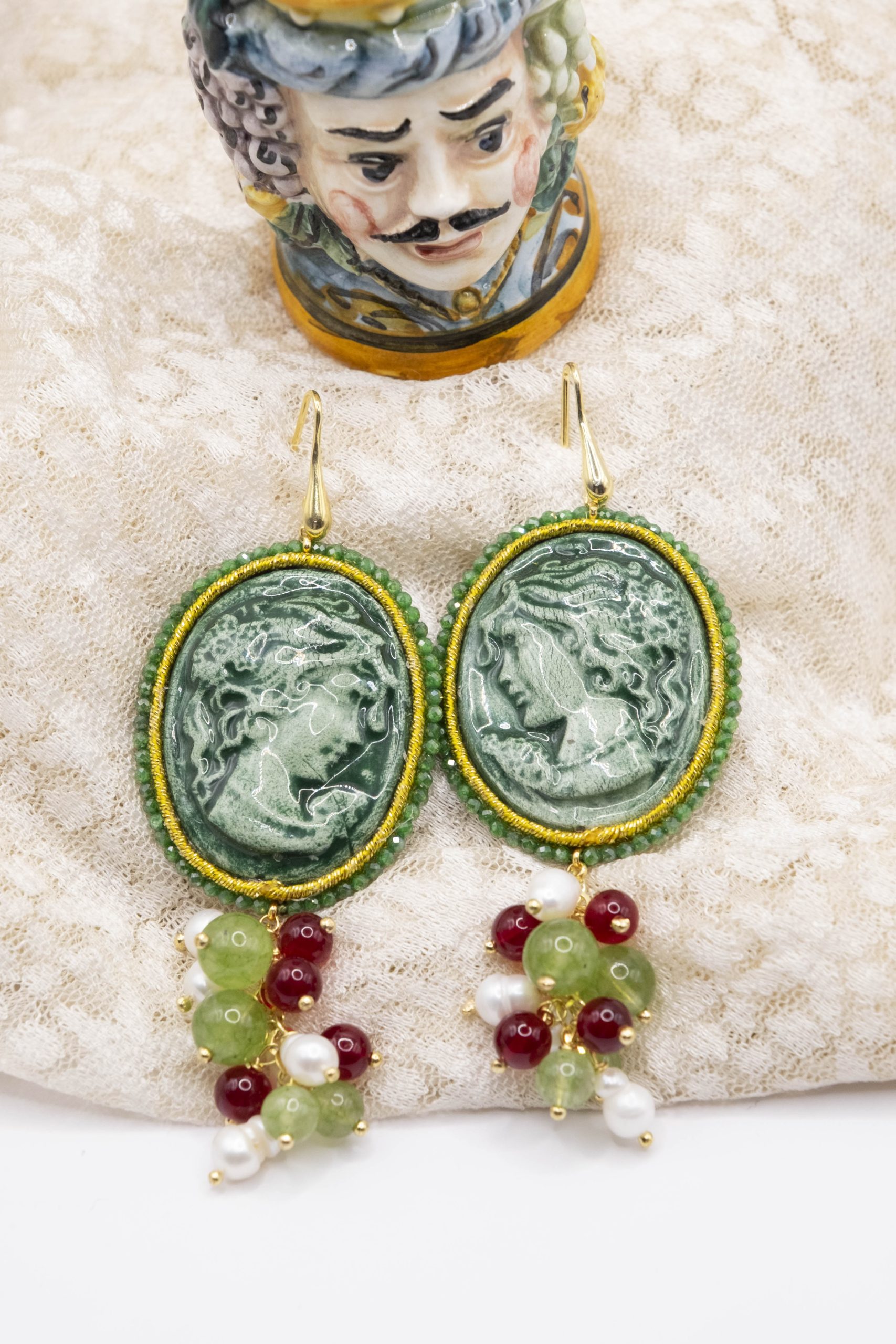 Orecchini Cammeo Ceramica di Caltagirone Giada Verde Borgogna Perle