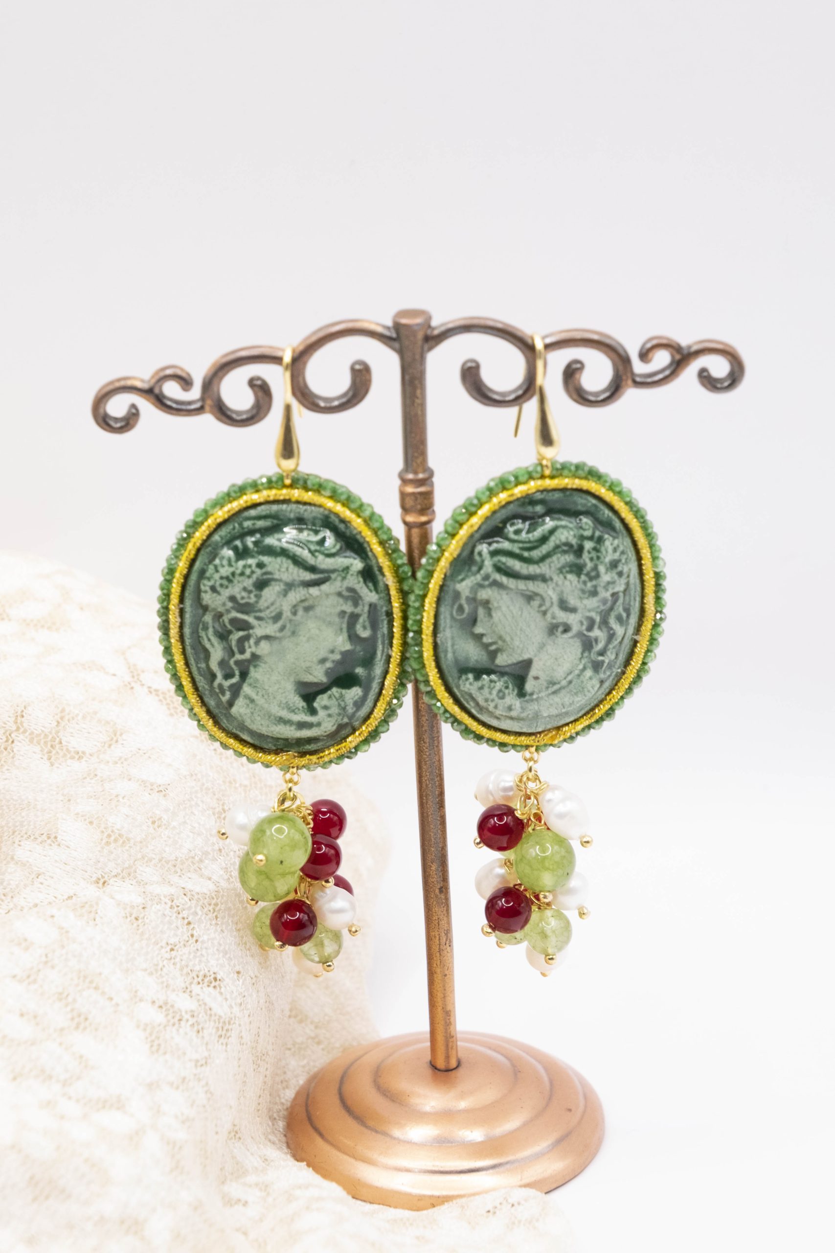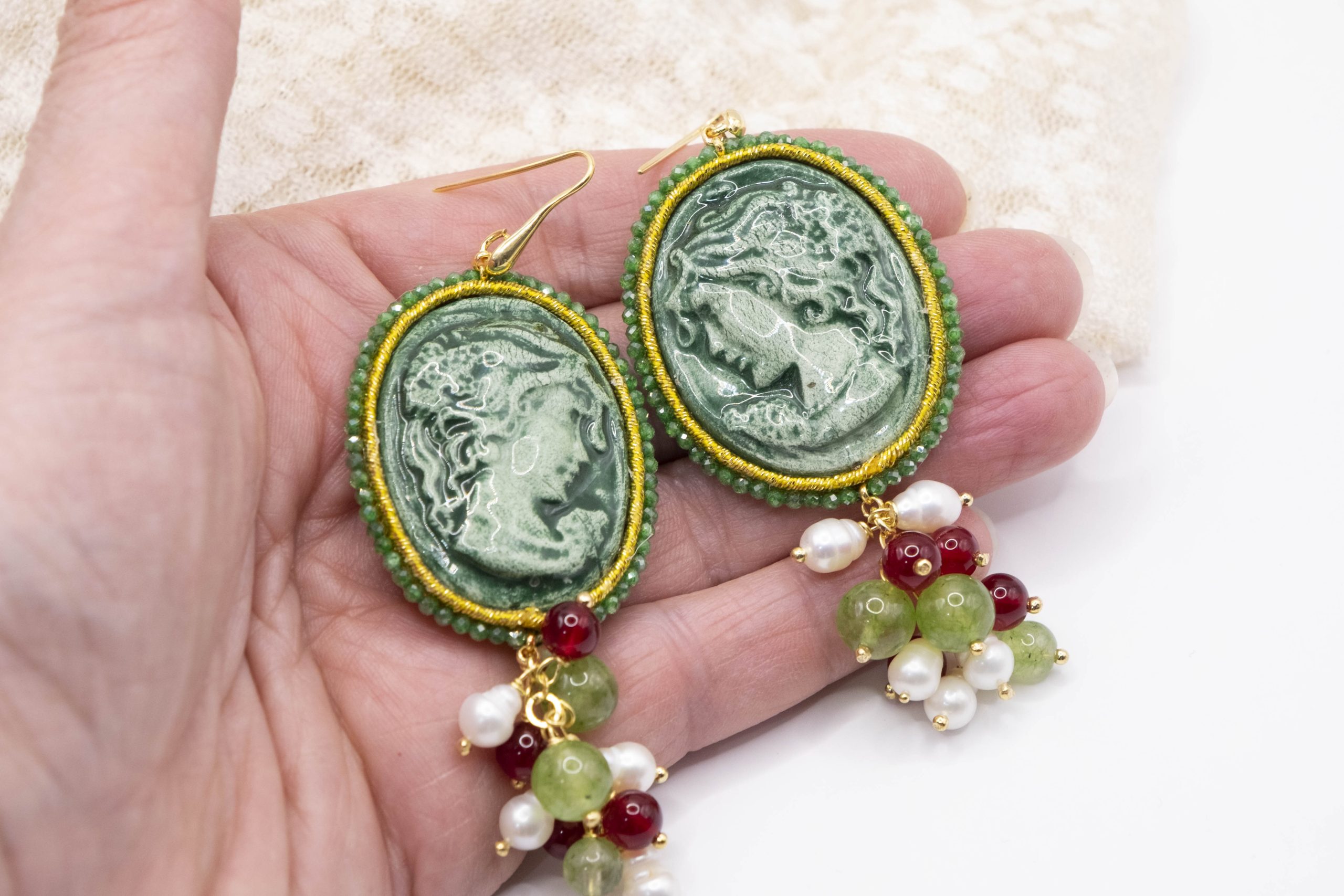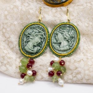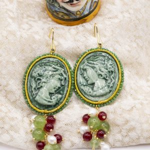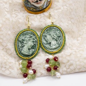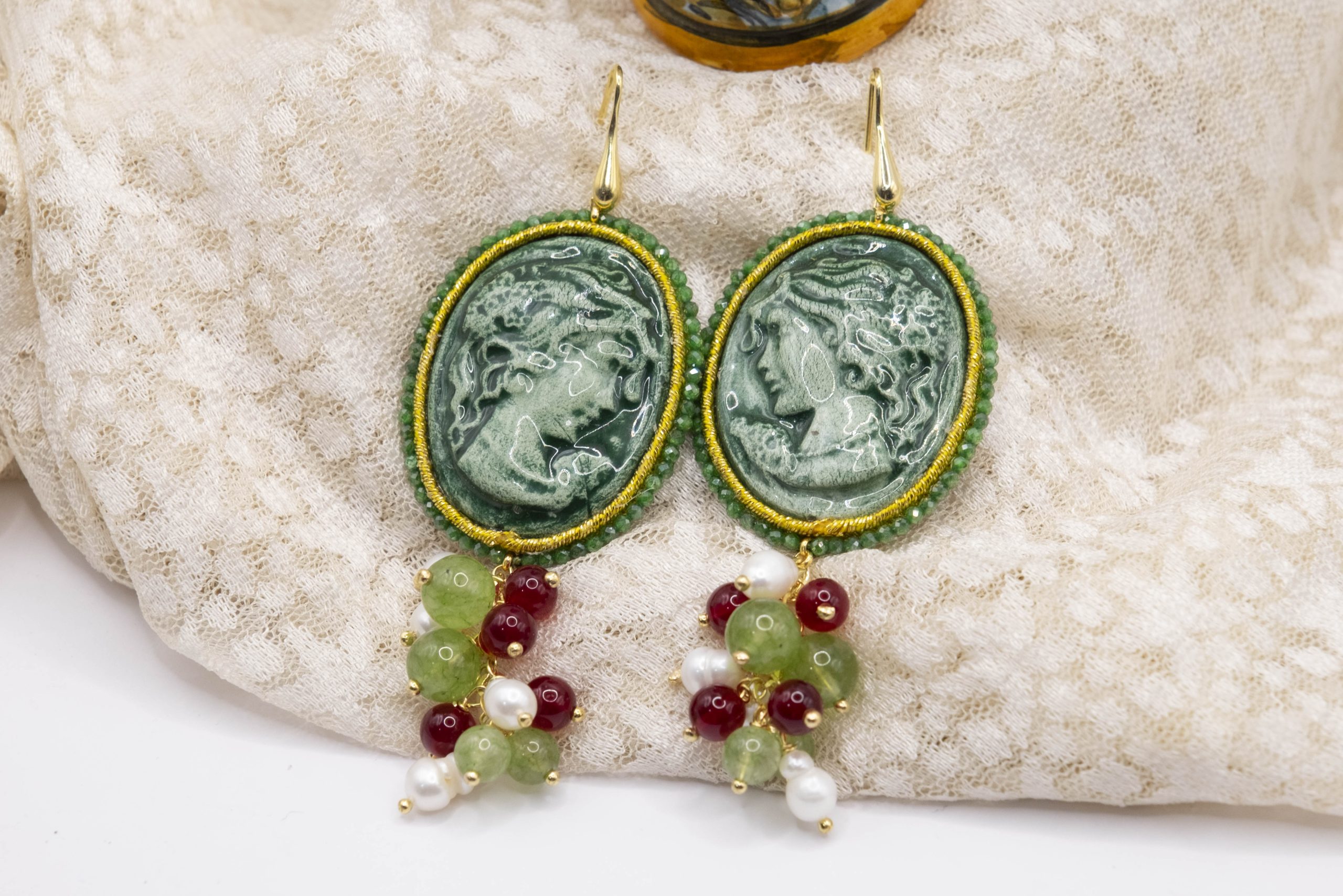 Orecchini Cammeo Ceramica di Caltagirone Giada Verde Borgogna Perle