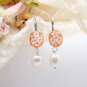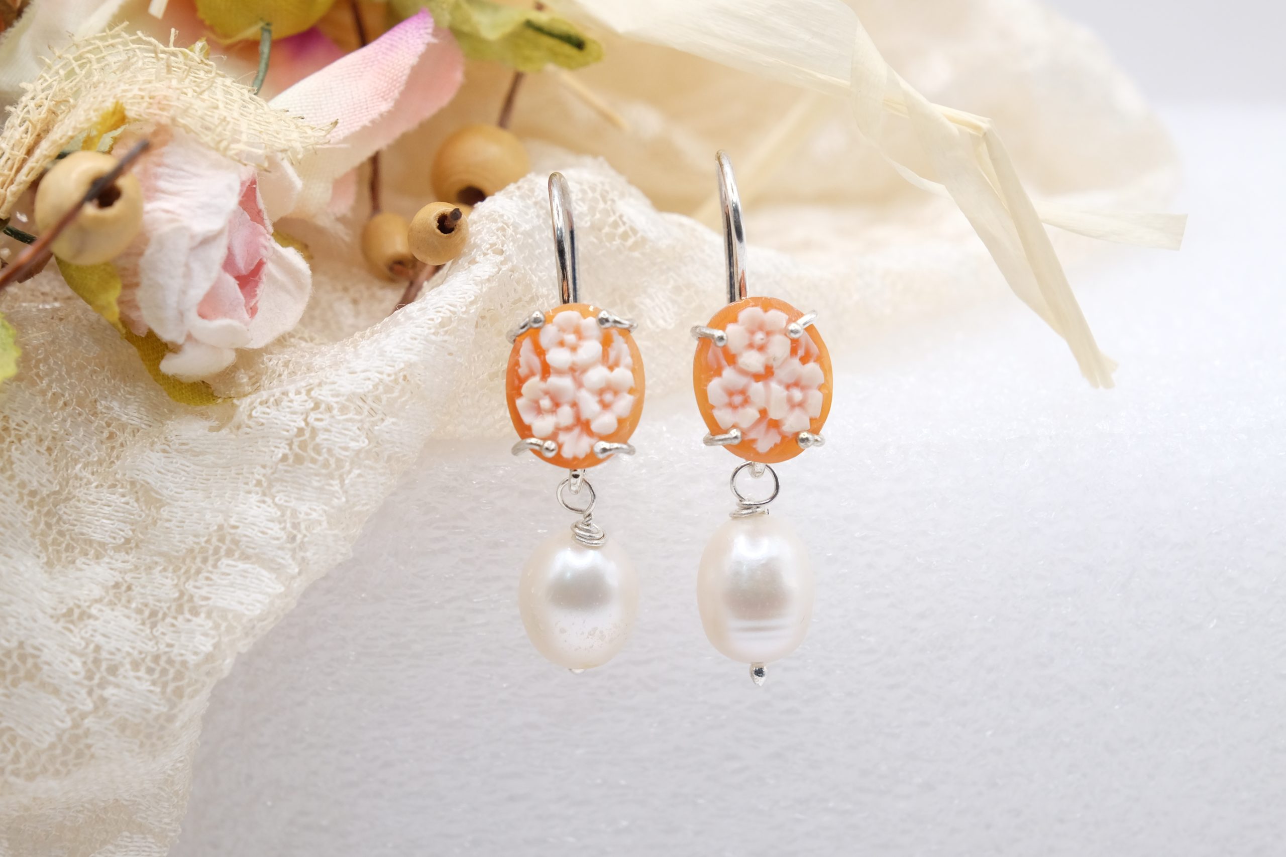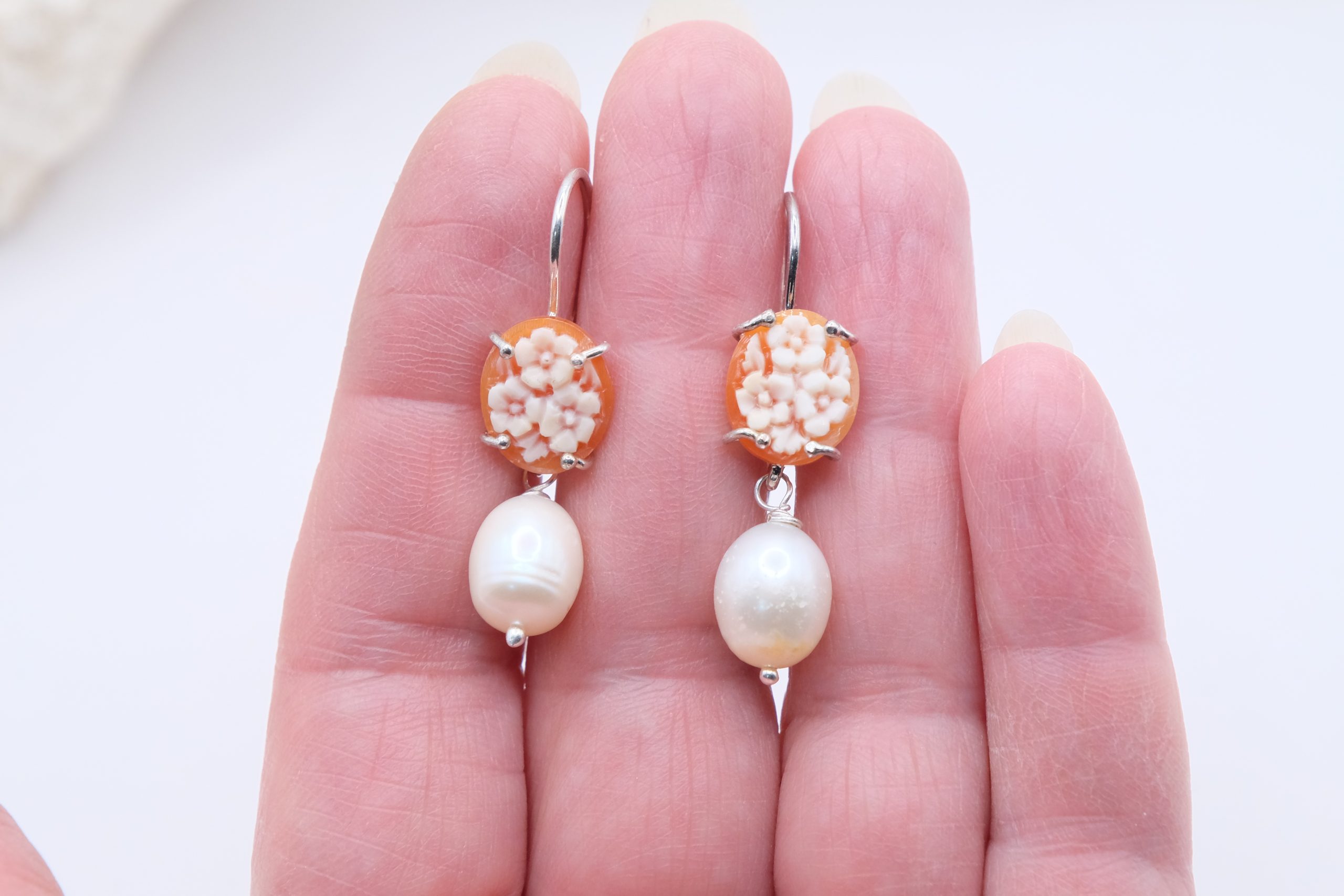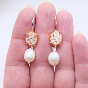 Orecchini con cammeo genuino, inciso dai maestri orafi di Torre del Greco, da 1,2 x 0,7 cm e perle naturali barocche a goccia, su argento 925 placcato rodio.