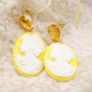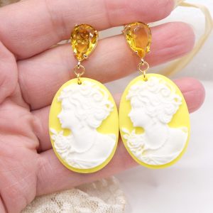 Esalta il tuo stile con questi esclusivi orecchini cammeo in resina Giallo, con un delicato volto di Dama inciso con maestria. Il perno in acciaio con elegante dettaglio cristallo sfaccettato a goccia ambrata dona un tocco sofisticato, perfetto per ogni occasione.