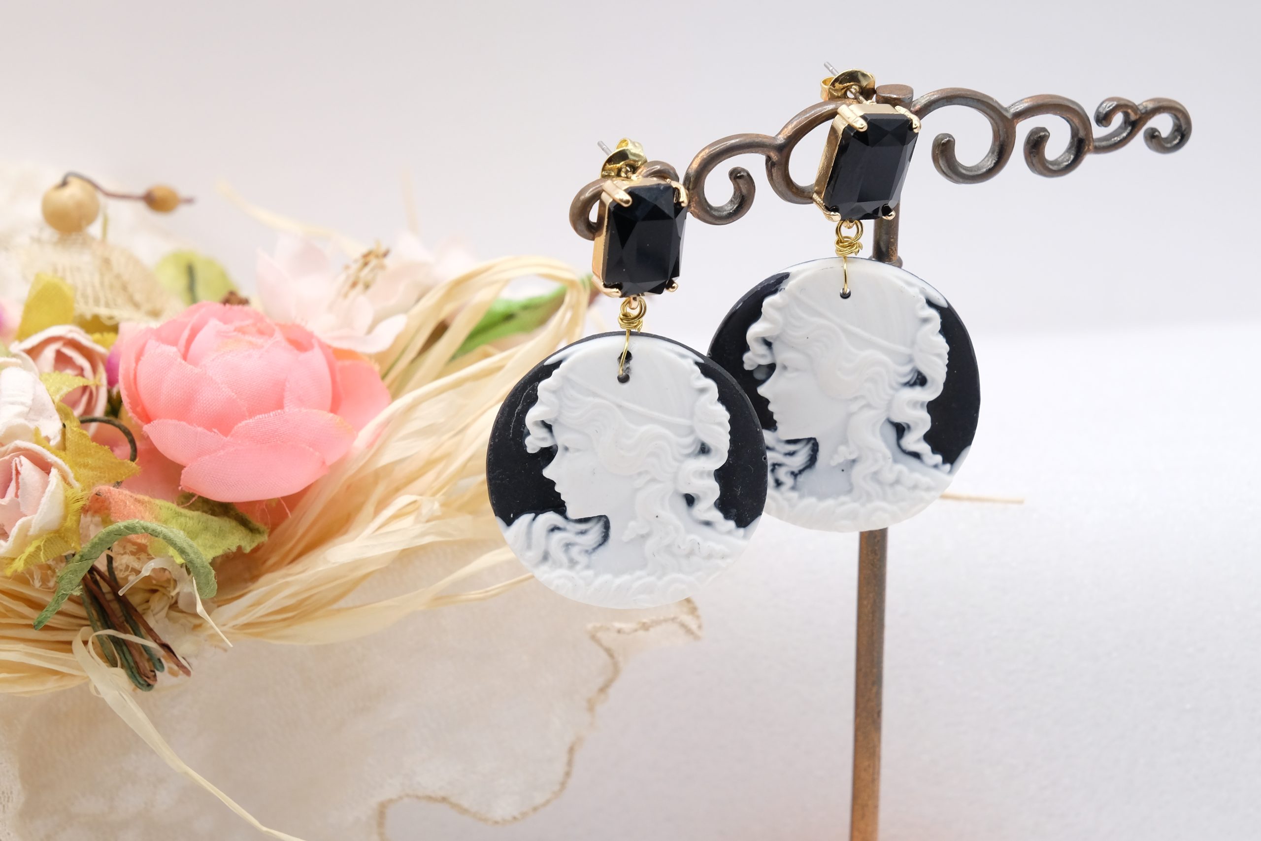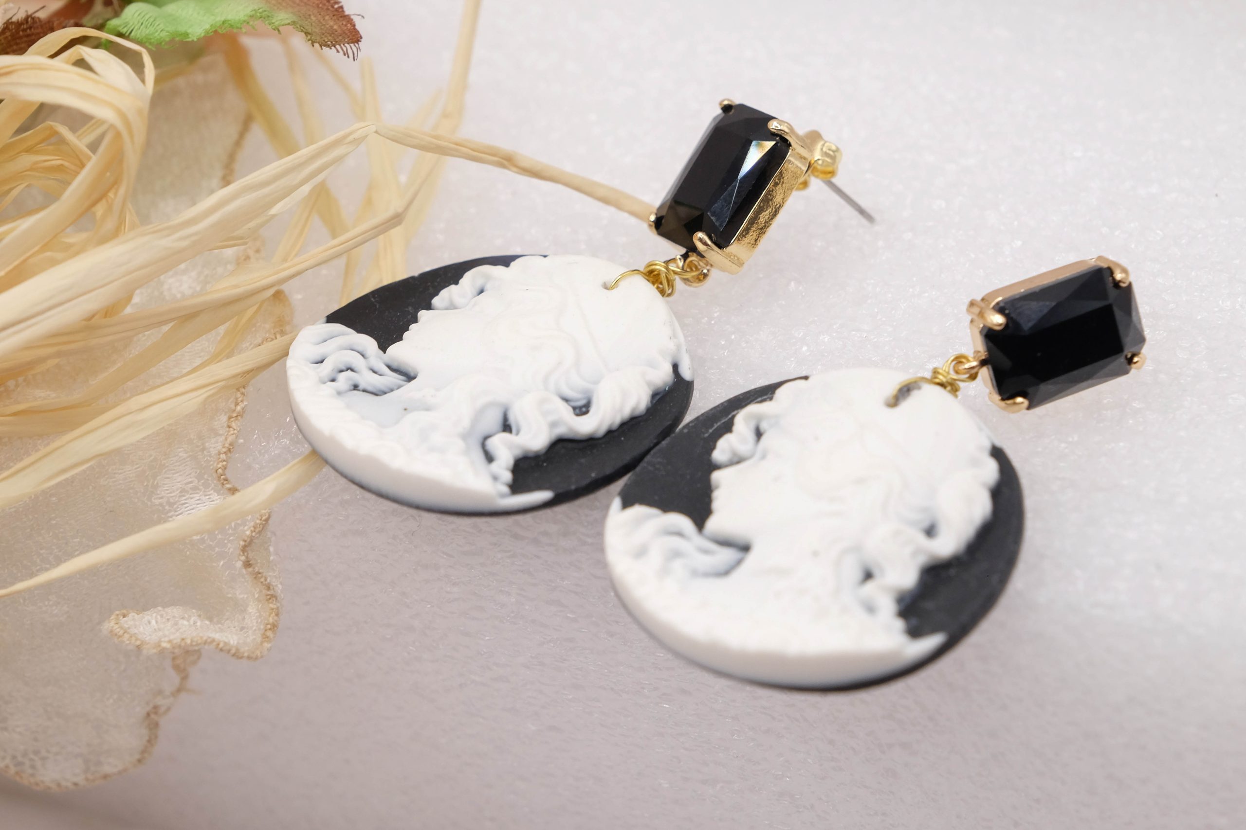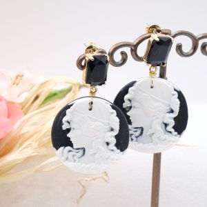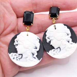 Orecchini Cammeo in Resina Nero con Perno Cristallo Artigianali