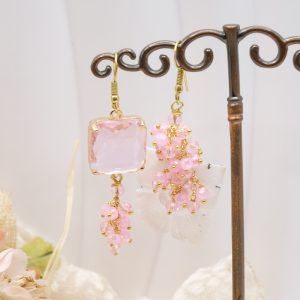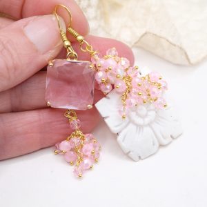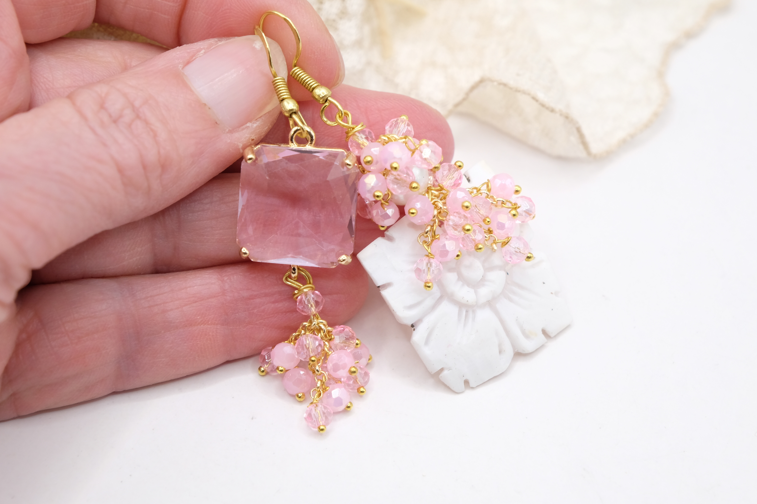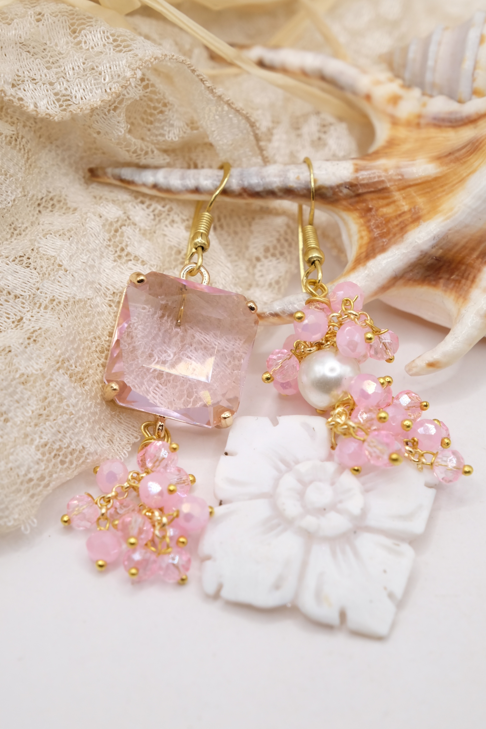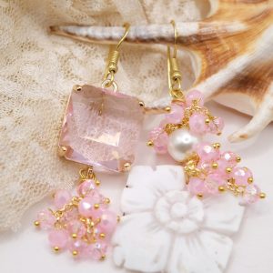 Orecchini “diversi”, uno con con vero cammeo in conchiglia, incisi a mano dai maestri artigiani di Torre del Greco a motivo di Dama con cristalli a cascata, l’altro monta un cristallo quadrato e un grappolo di cristalli in basso