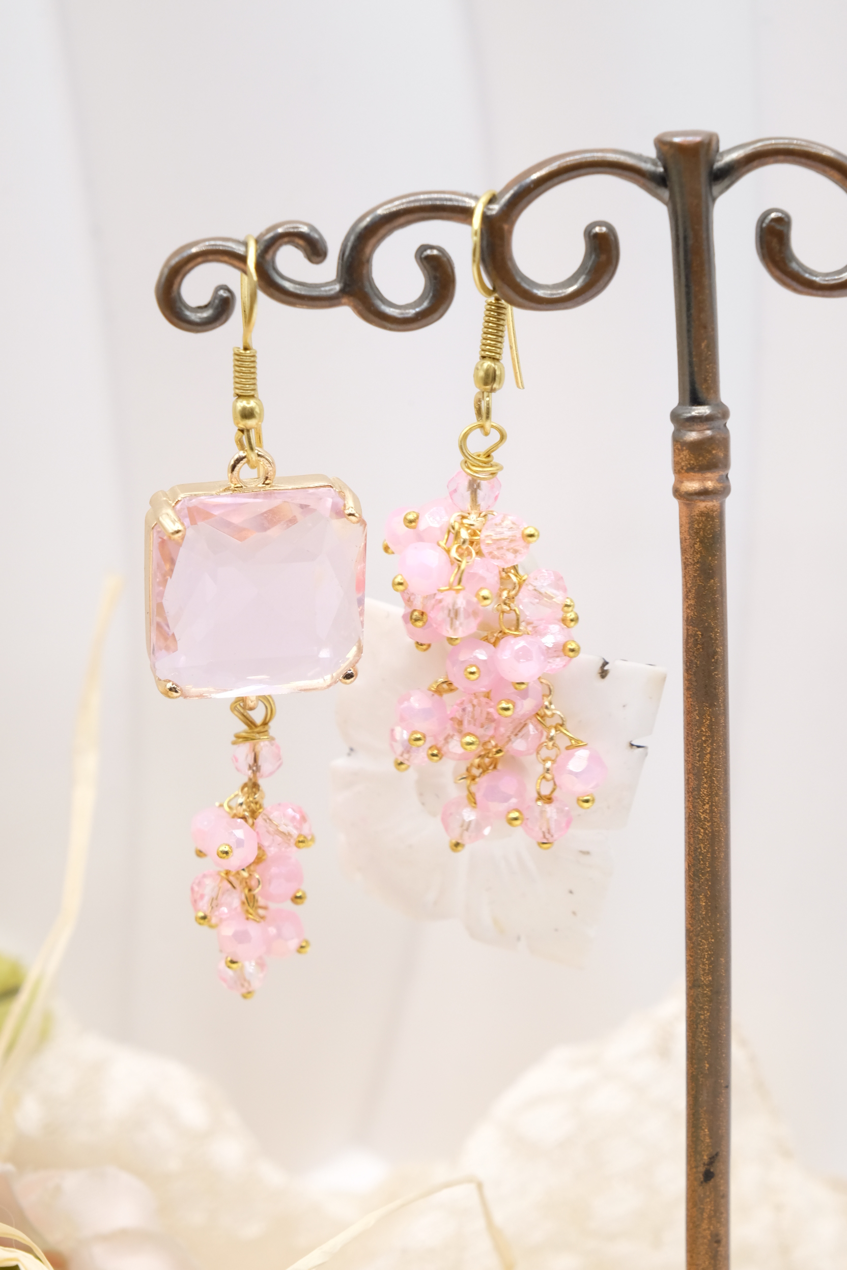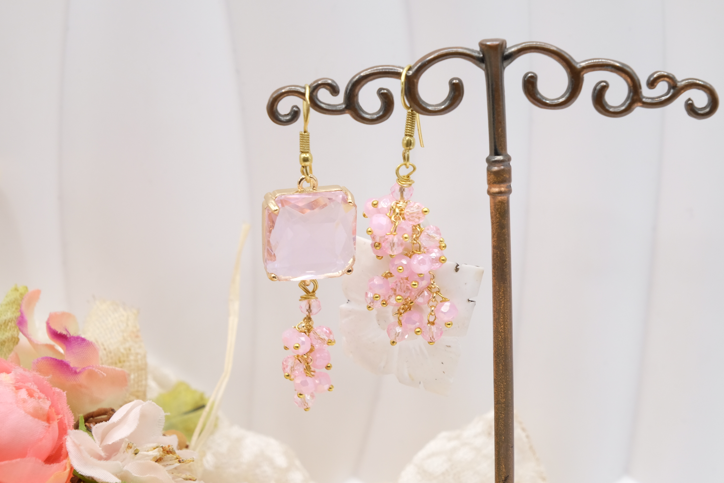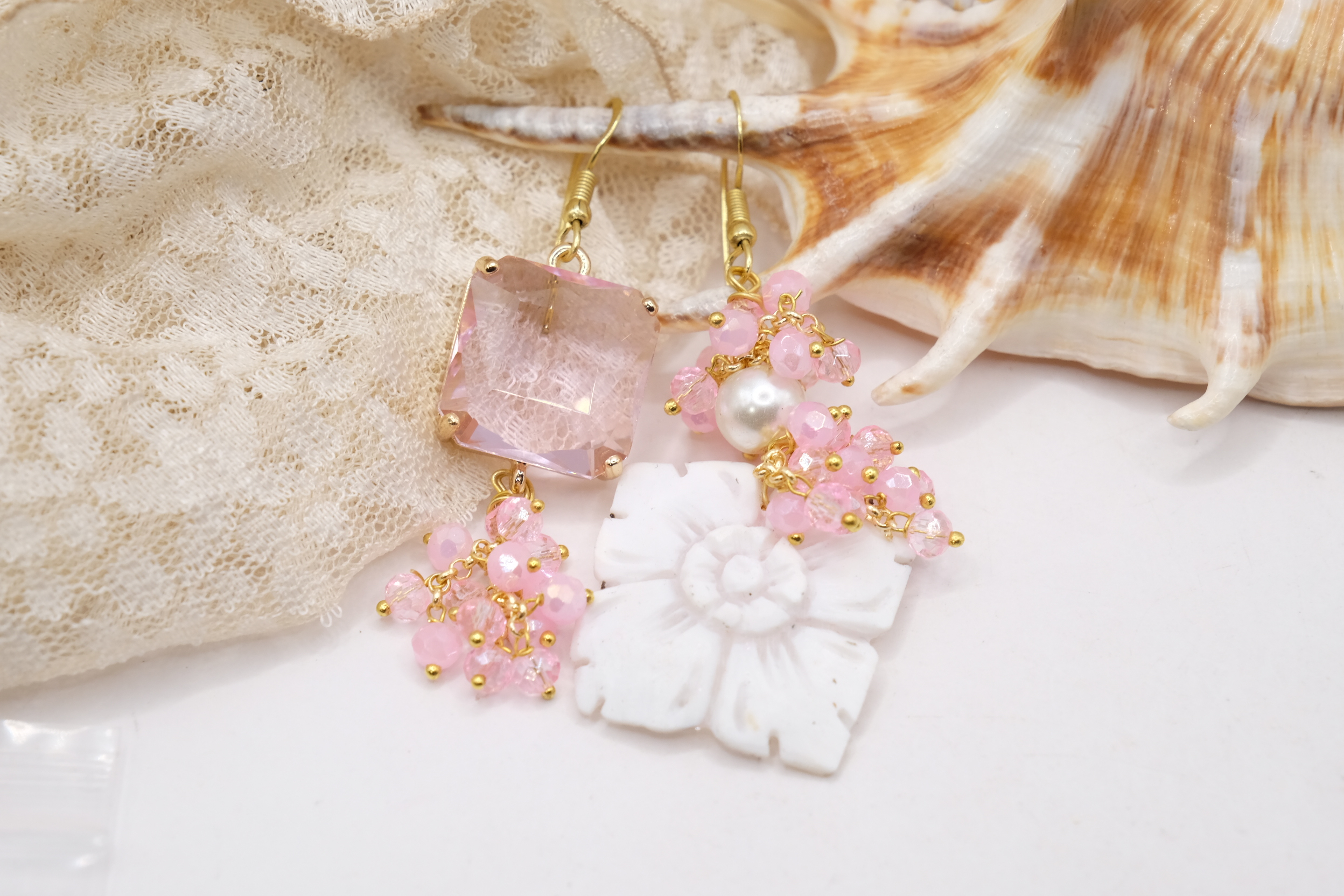 Orecchini “diversi”, uno con con vero cammeo in conchiglia, incisi a mano dai maestri artigiani di Torre del Greco a motivo di Dama con cristalli a cascata, l’altro monta un cristallo quadrato e un grappolo di cristalli in basso